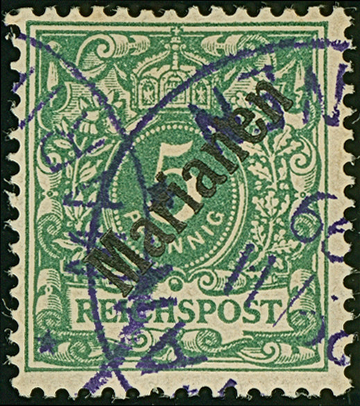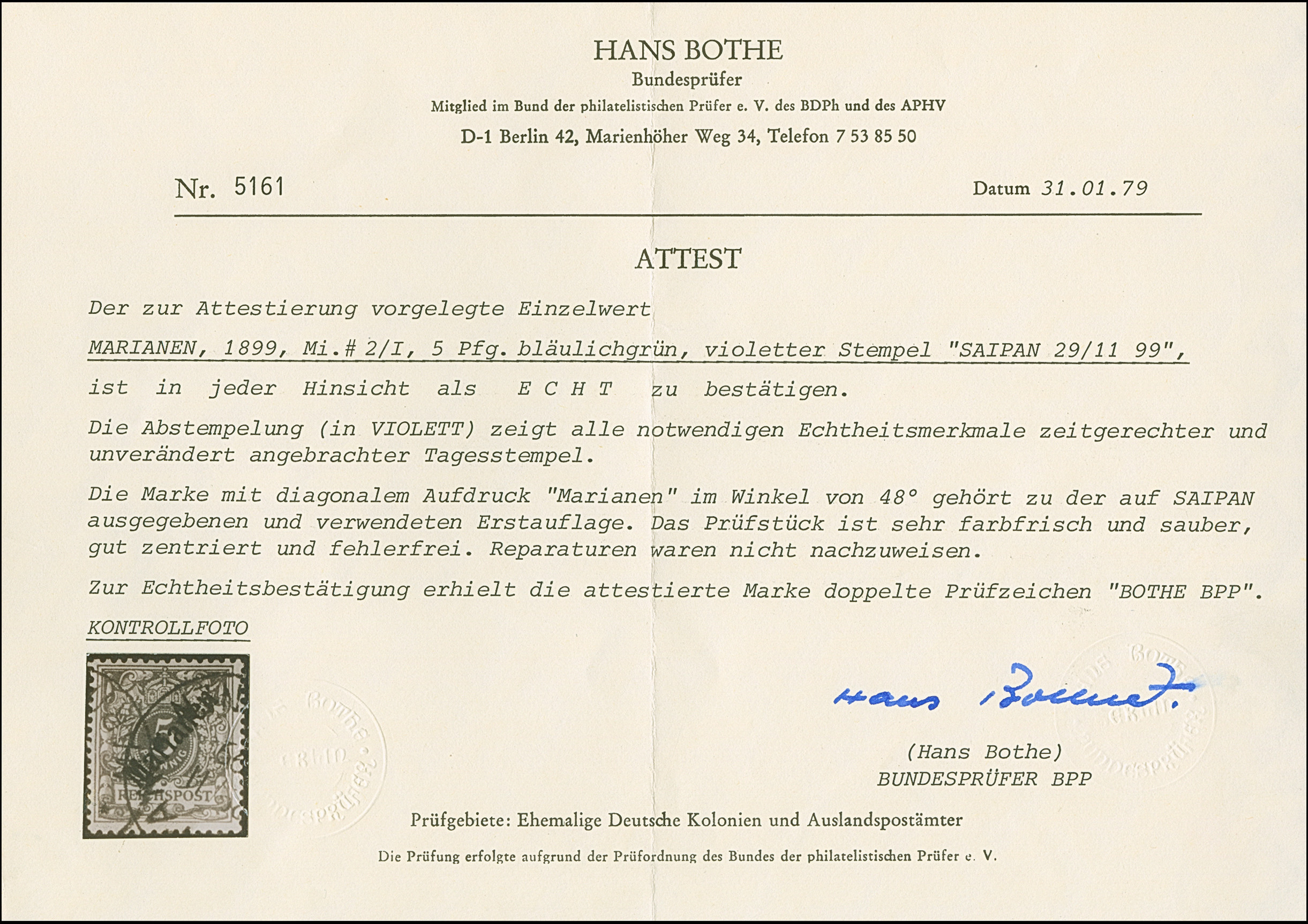 1899/1900, Steilaufdruck 5 Pfg. mit violettem Stempel “SAIPAN MARIANEN 29.11.99", in tadelloser Erhaltung, doppelt signiert Bothe BPP mit Fotattest (1979)