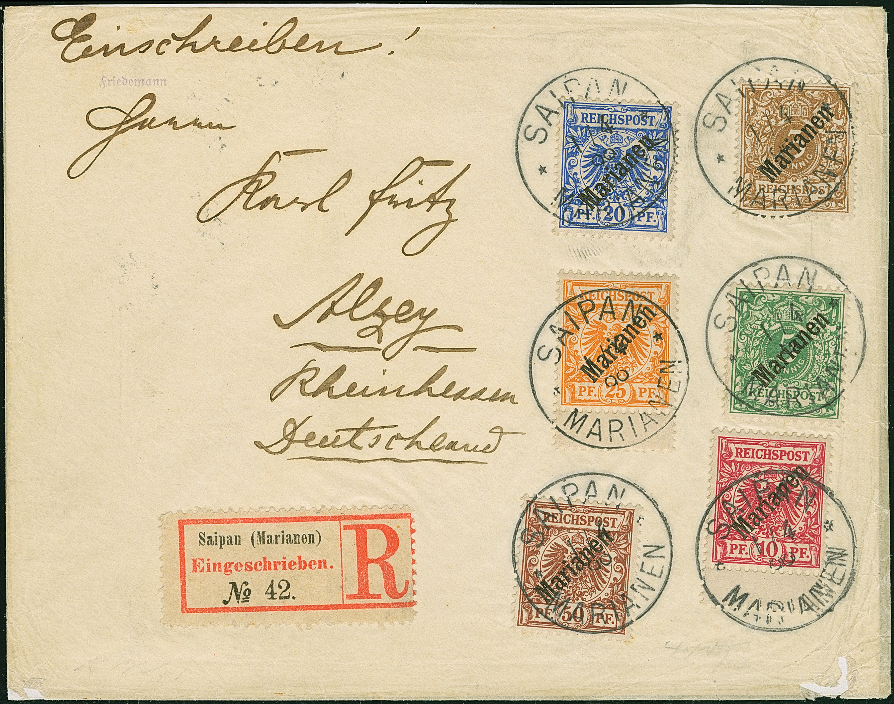 1900, Steilaufdruck 3-50 Pfg. komplett je mit Stempel “SAIPAN MARIANEN 5.2.00” auf überfrankiertem R-Brief nach Metz mit Ankunftsstempel. Rückseitig fehlt die Verschlussklappe, ansonsten in einwandfreier Erhaltung, sign. Bothe BPP