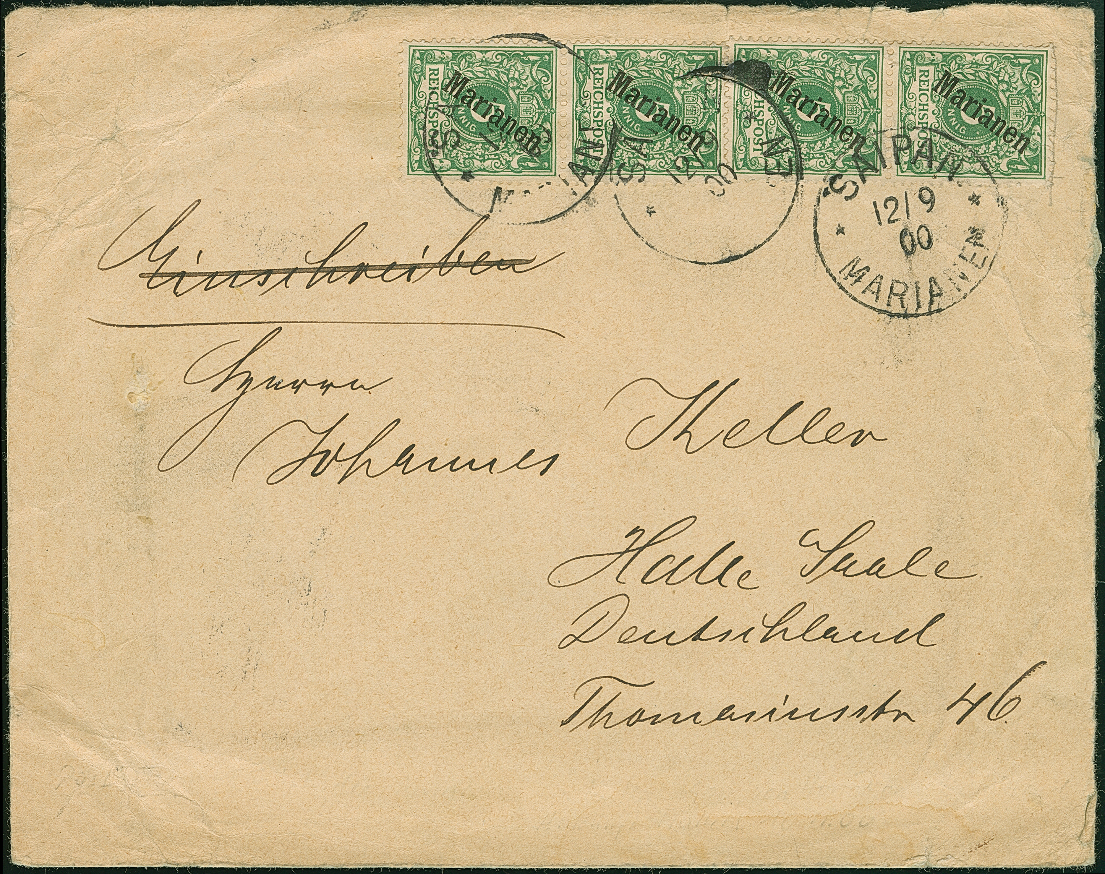 1900, Steilaufdruck 5 Pfg., zwei senkrechte Paar mit Stempel “SAIPAN MARIANEN 12.9.00” als tarifgerechte Mehrfachfrankatur auf Briefkuvert nach Halle mit Ankunftsstempel. Der Umschlag mit stärkeren Beförderungsspuren im Rand und rückseitig fehlt ein kleiner Teil der Verschlussklappe, die Marken mit kleinen Zahnbügen und Druckstellen, ansonsten in guter Erhaltung. Bedarfsbriefe aus dieser Zeit sind nicht häufig