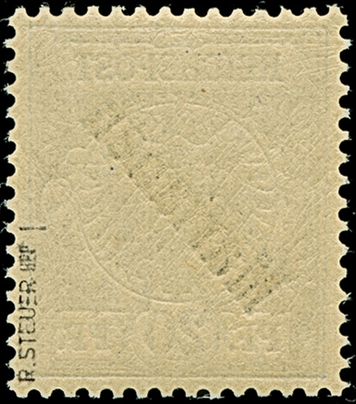 1900, 5 Pfg. auf 10 Pfg. mit steilem Aufdruck ohne Blaustrich (Aufdrucktype 2) mit Bogenrand rechts (vorgefaltet). Die farbfrische und postfrische Marke ist tadelloser Erhaltung, unsigniert mit Fotoattest R. Steuer BPP (1994)