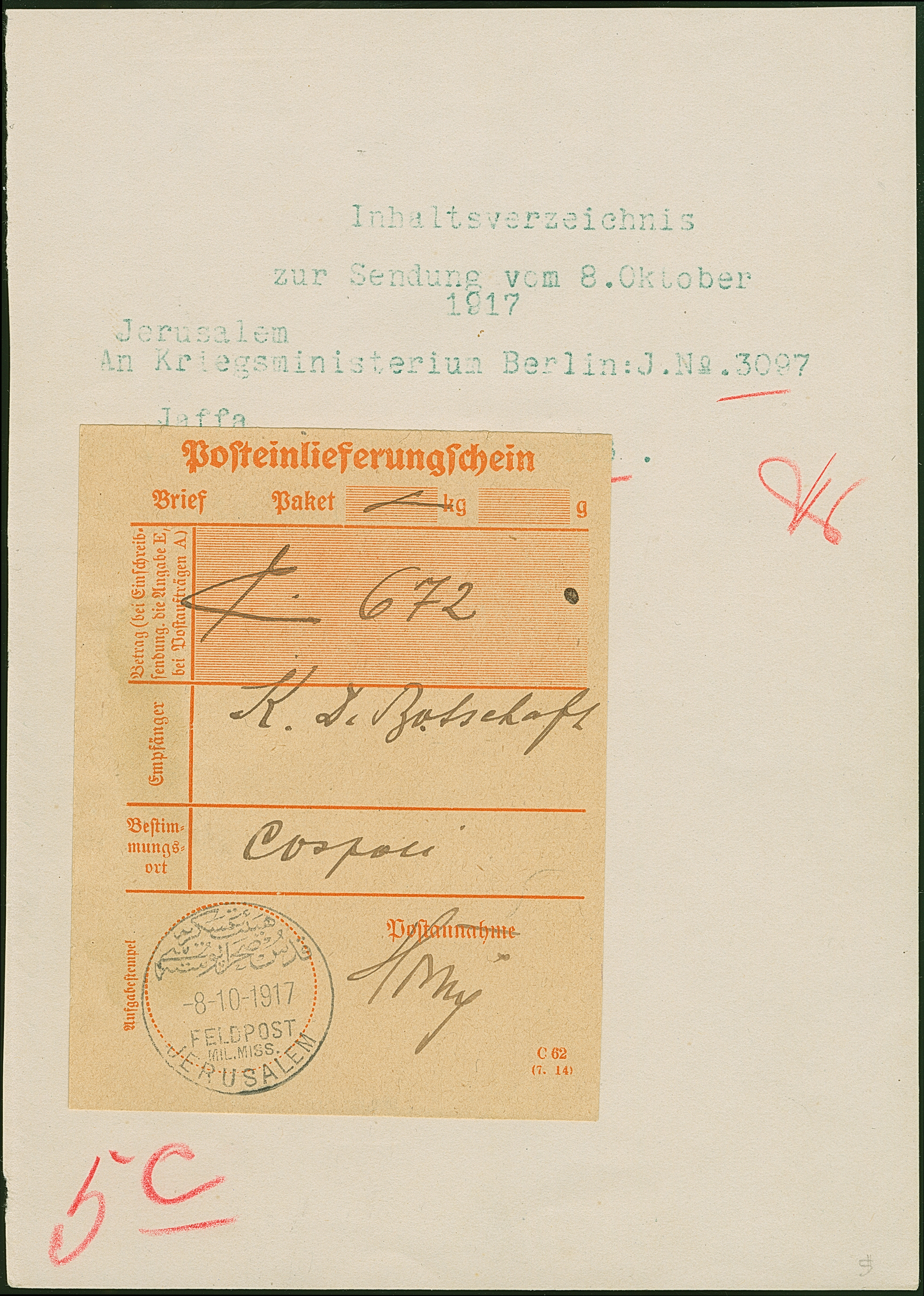 1917, “JERUSALEM FELDPOST MIL.MISSION 8.10.17” klar auf Posteinlieferungsschein, aufgeklebt auf Inhaltsverzeichnis mit roter Kontroll-Paraphe, in guter Erhaltung