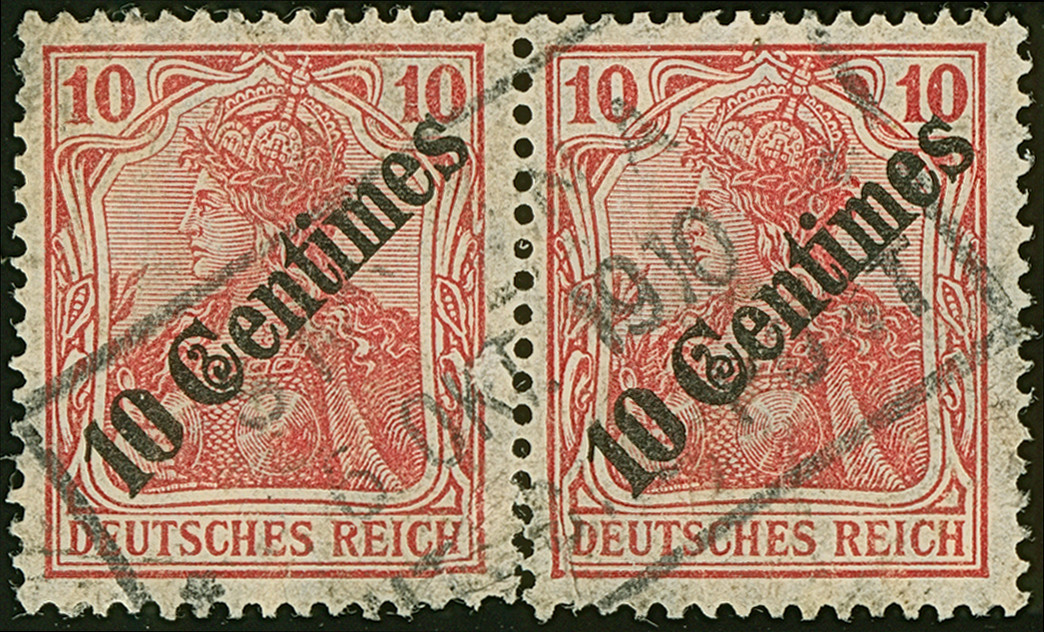 “SMYRNA DEUTSCHE POST ** 6.OKT.1910” sogen. Rosinenstempel klar und fast kpl. auf waagerechtem Paar Ausgabe 1908 10 C. auf 10 Pfg.. Das Paar ist unten angetrennt und jeweils mit kleinem Eckzahnfehler