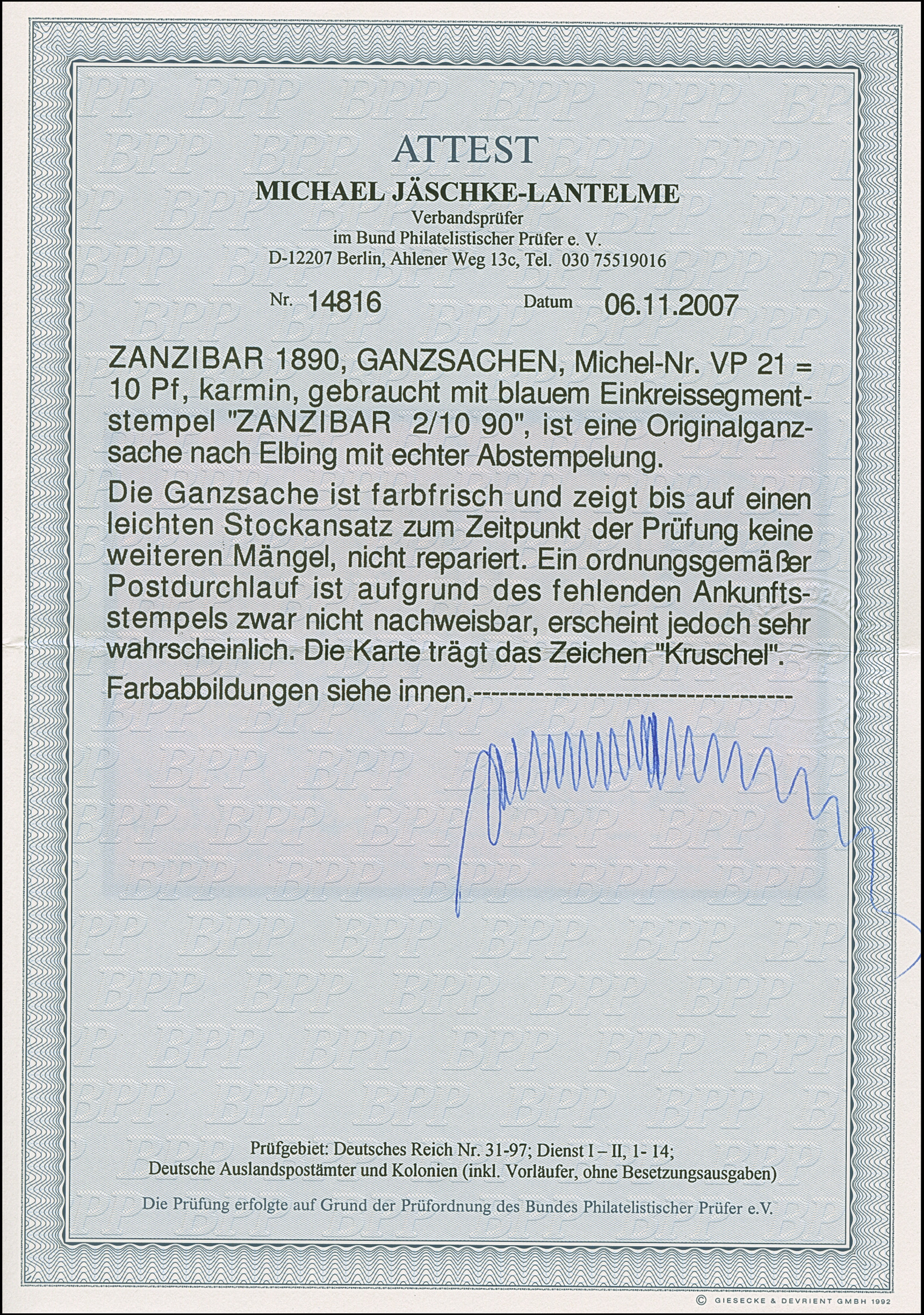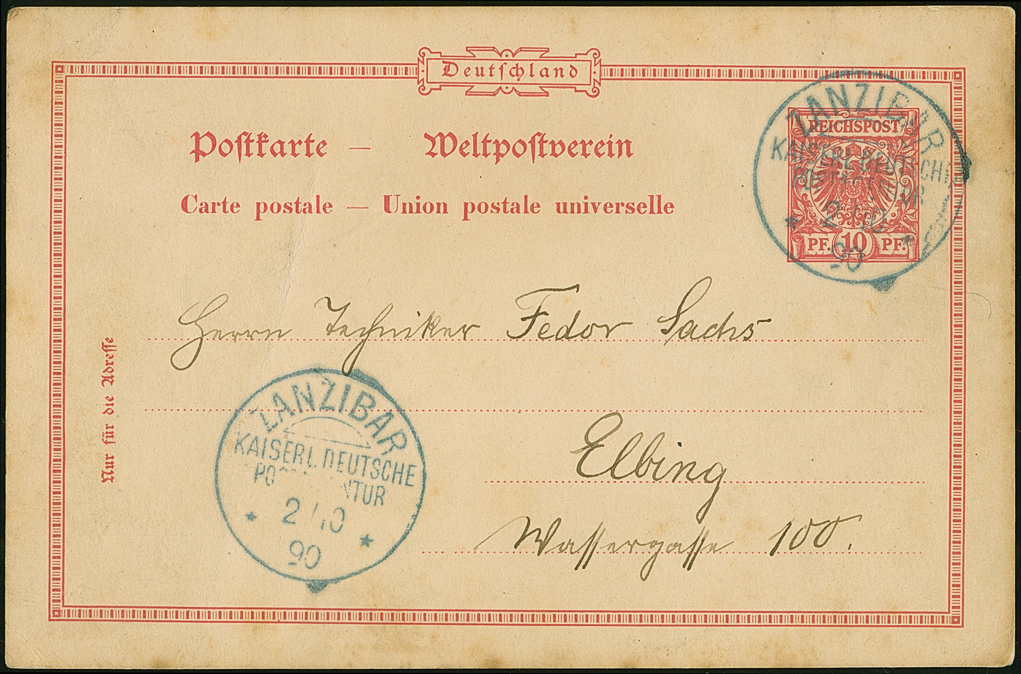 1890, Ganzsachenkarte Krone/Adler 10 Pfg. mit blauem Stempel “ZANZIBAR KDPAG 2.10.90” als Entwerter und 2. Abschlag unten sowie viel Text vom Postmeister Alfred Sachs nach Elbing. Der Postmeister Sachs traf am 30.9.1890 mit dem frz. Schiff “Mendoza” in Zanzibar an und eröffnete am 14.10.1890 die Kaiserlich Deutsche Postagentur in Daressalam. Die Karte mit Stockflecken im Rand und kleinem Eckbug, ansonsten in guter Erhaltung. Eine nicht häufige Verwendung mit besserem Stempel und interessantem Absender, sign. Kruschel und Fotoattest Jäschke-L. BPP (2007)