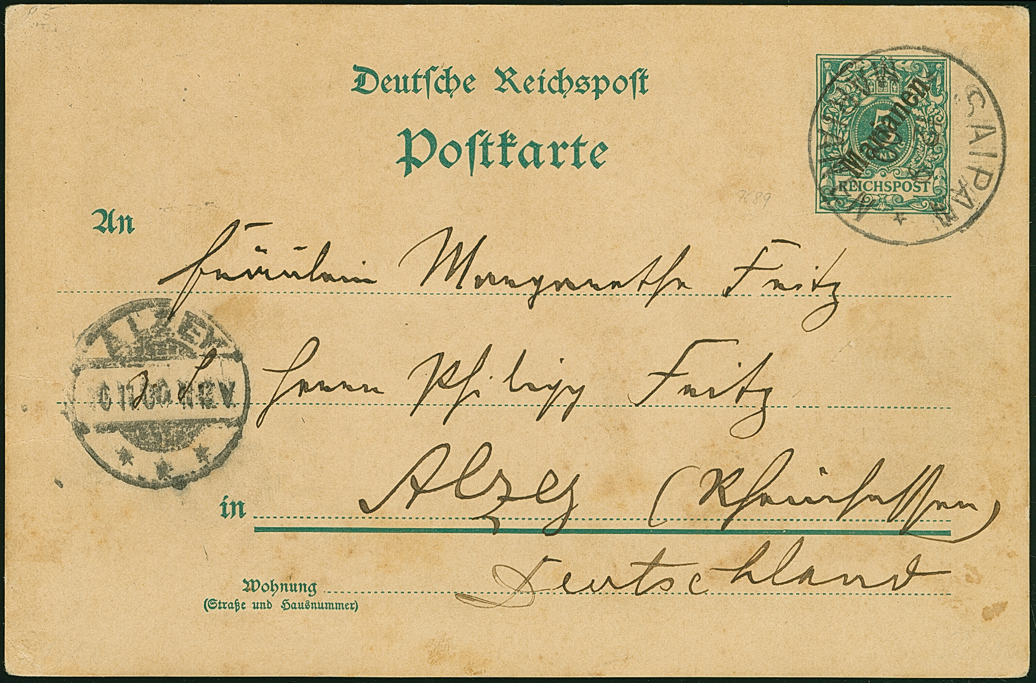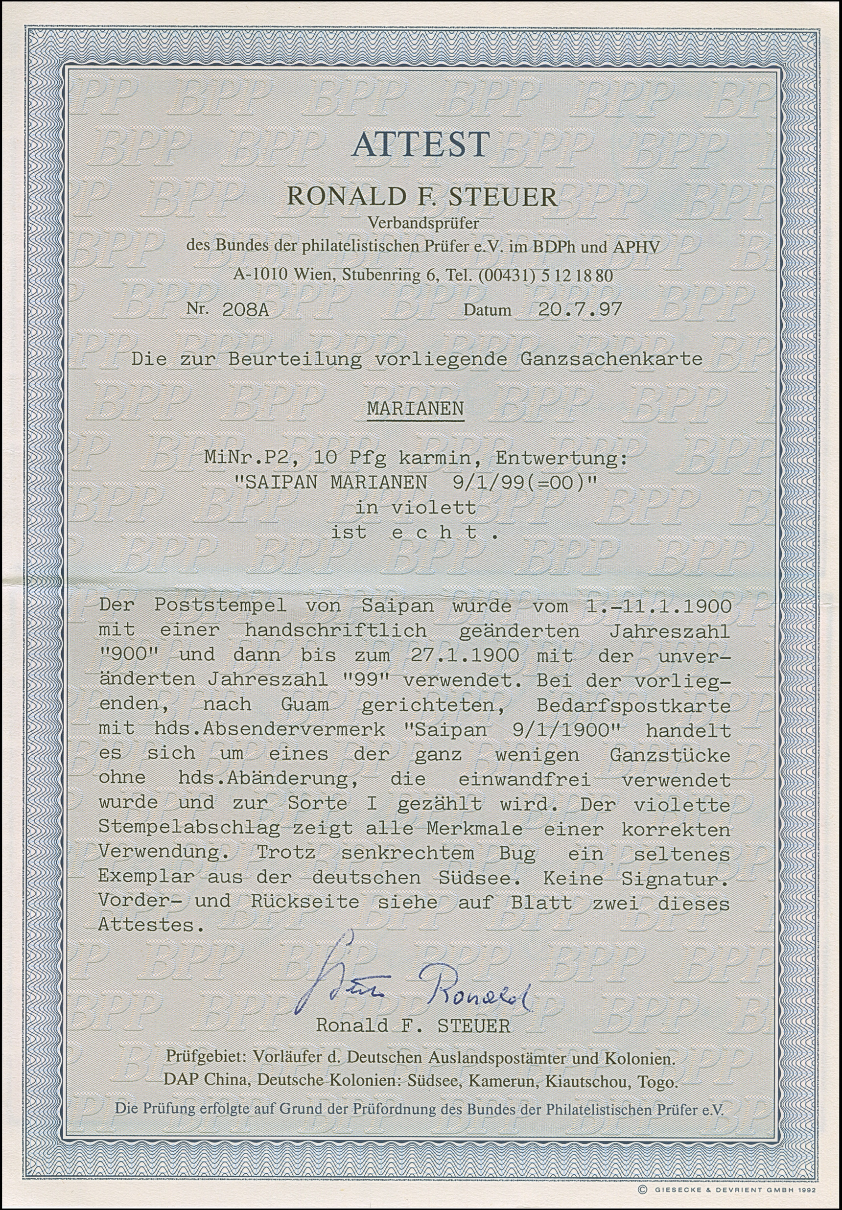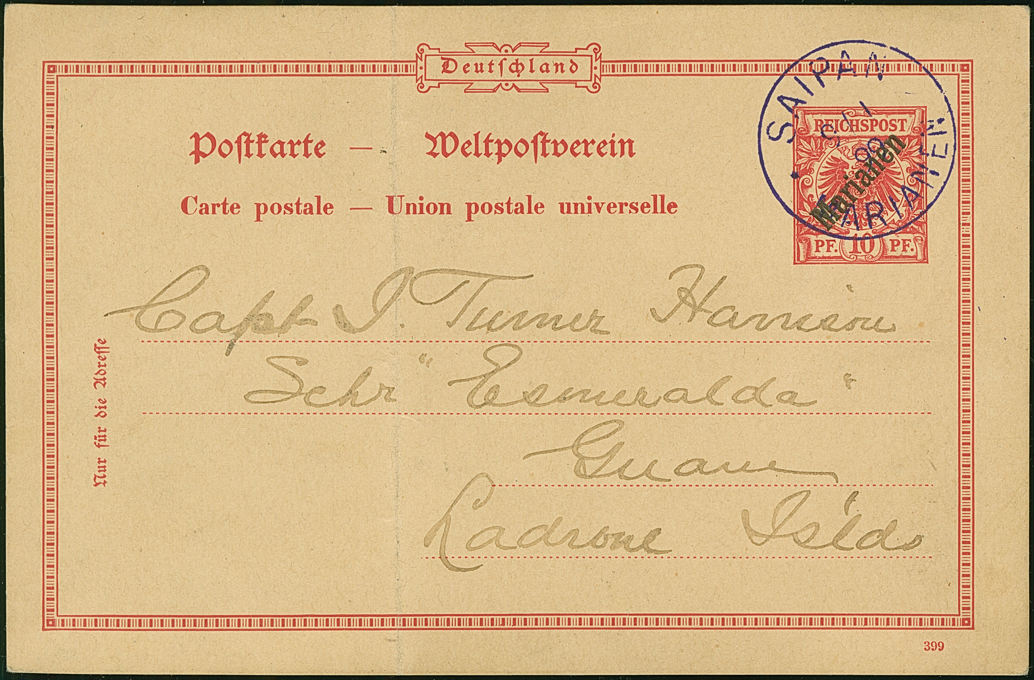 “SAIPAN MARIANEN 9.1.99” (1900), violetter Stempel klar auf Aufdruck-Ganzsachenkarte 10 Pfg. mit englischem Text an eine Kapitän der Esmeralda in Guam. Die Karte mit senkrechter Faltung, ansonsten in guter Erhaltung. Der violette Stempel von Saipan wurde in der Zeit vom 9.-27.1.1900 ohne handschriftliche Änderung der Jahreszahl verwendet und ist auf Bedarfspost außerordentlich selten, Fotoattest R. Steuer BPP (1997)