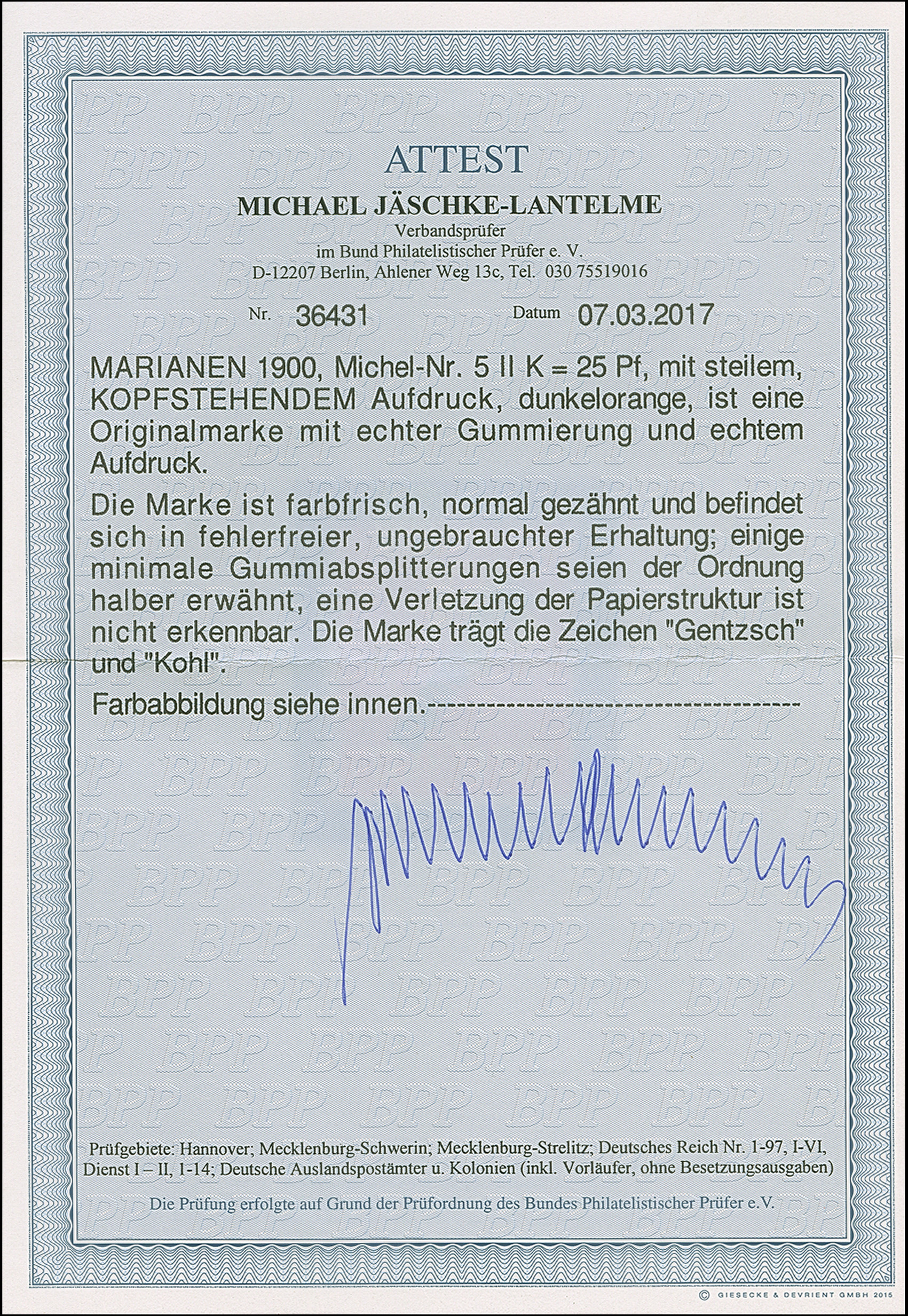 1899/1900, Steilaufdruck 3 Pfg. mit Stempel “SAIPAN MARIANEN 27.1.00”, rückseitig mit Tintenspur. Die farbfrische Marke ist in einwandfreier Erhaltung, u.a. signiert Dr. Lantelme BPP mit Fotoattest (1990)