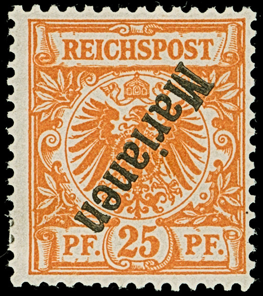 1900, 25 Pfg. dunkelorange mit kopfstehendem Aufdruck, farbfrisch und normal geähnt, ungebraucht, einige minimale Gummiabsplitterungen, eine seltene Marke in einwandfreier Erhaltung, signiert sowie Fotoattest Jäschke-Lantelme BPP (2017)