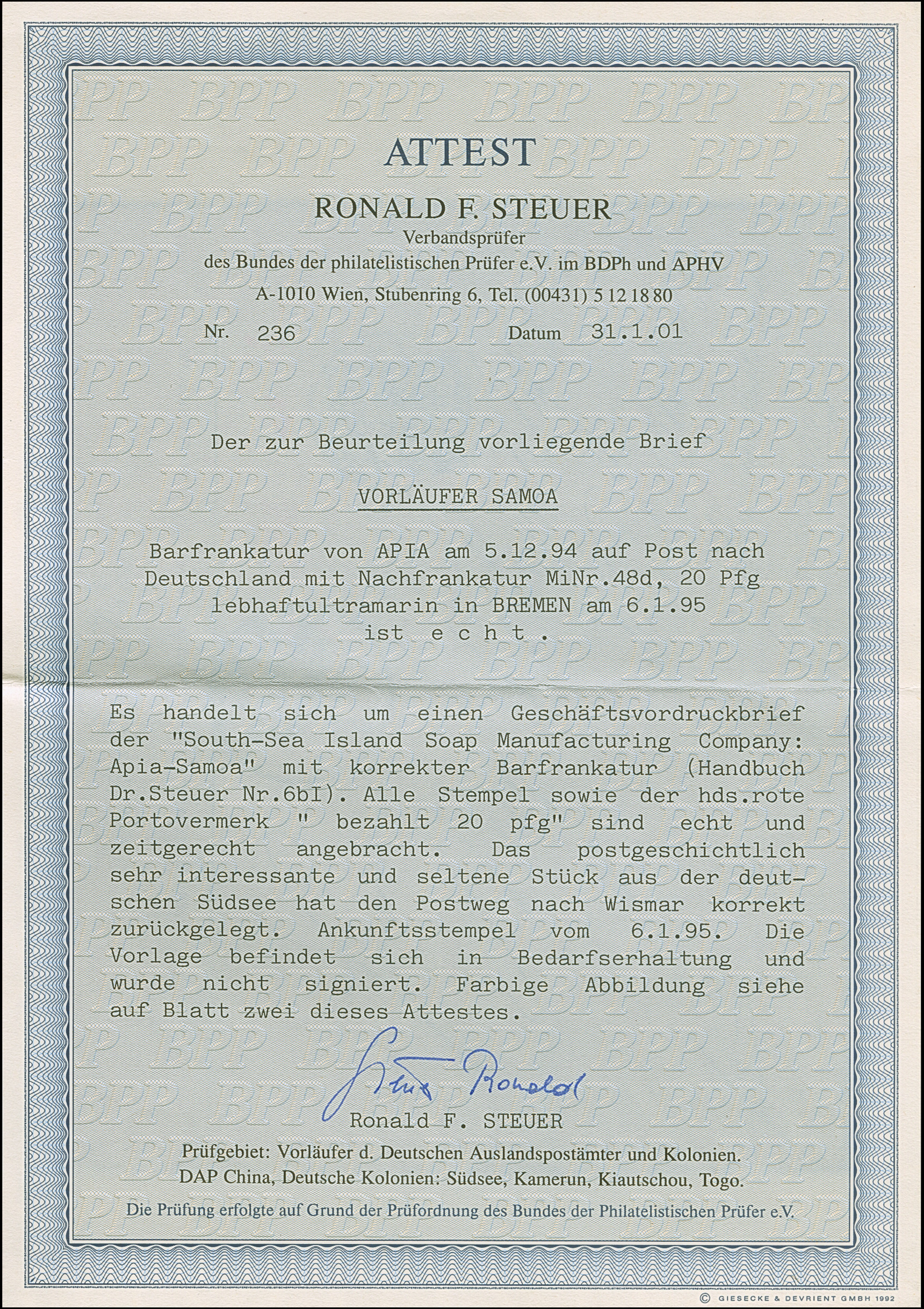 1890, Krone/Adler 20 Pfg. violettultramarin mit nachträglicher Entwertung “BREMEN 6.1.89” auf Vordruckbrief “South-Sea Island Soap Manufacturing Company: Apia-Samoa" mit Aufgabestempel “APIA KDPAg 5.12.94” und Barfrankatur “bezahlt 20 Pfg.” in Rot nach Wismar mit Ankunftsstempel. Der Umschlag oben und unten mit einer waagerechten Faltung und im Rand zum Teil mit stärkeren Beförderungsspuren. Trotz der Einschränkungen eine nicht häufige Verwendung, Fotoattest R. Steuer BPP (2001)