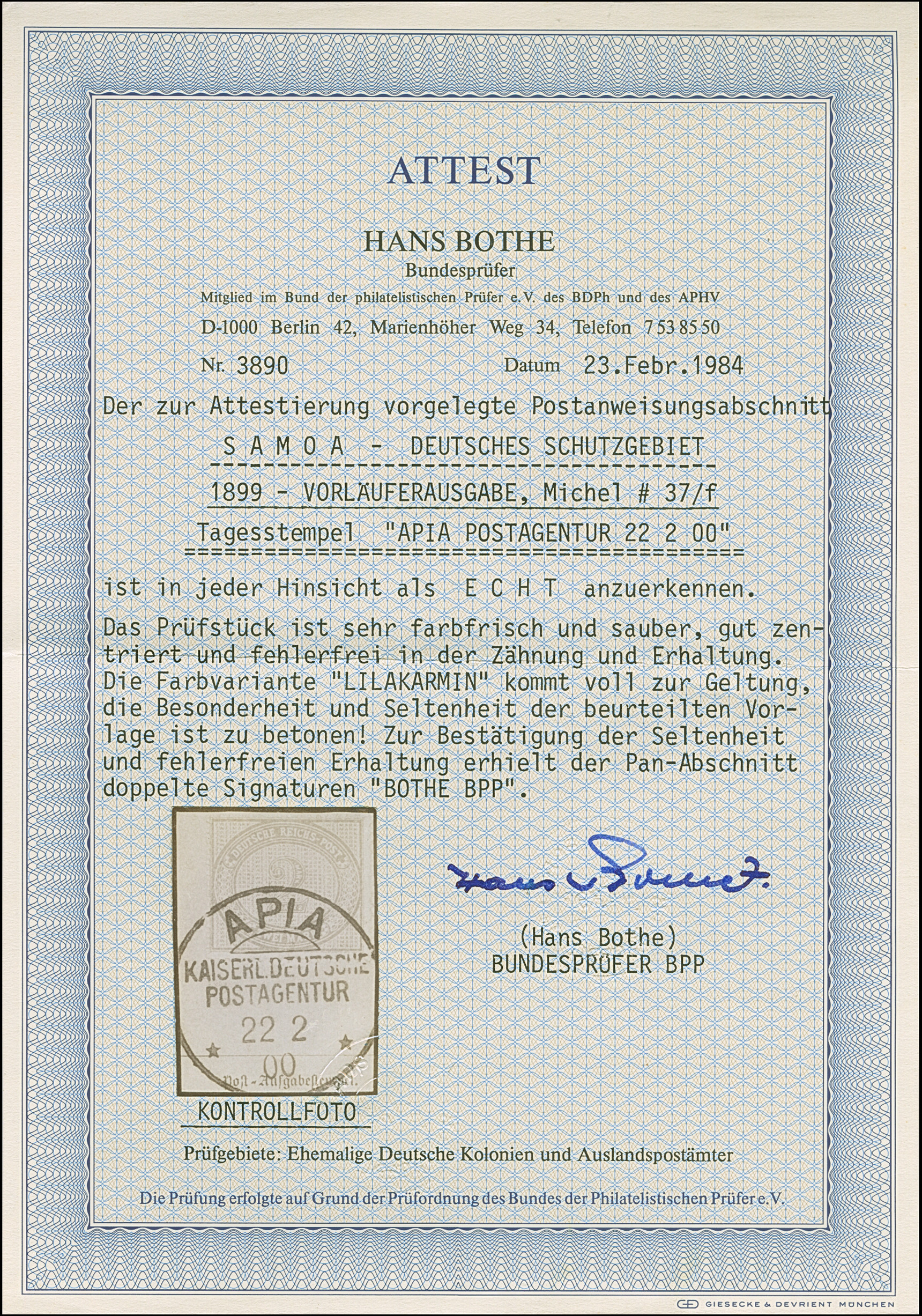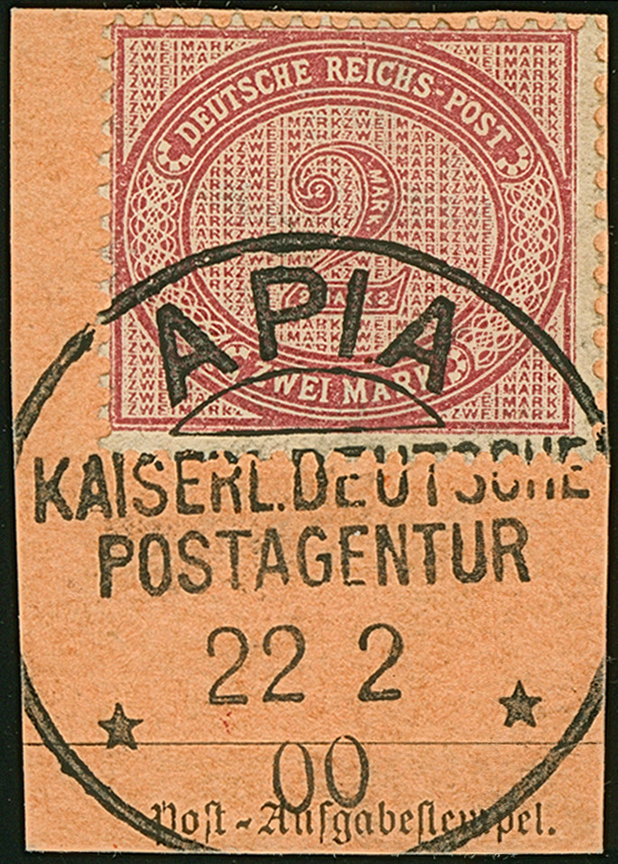 1899, 2 M. rötlichkarmin mit klarem Stempel “APIA KDPAg 22.2.00” auf Postanweisungs-Briefstück. Die farbfrische Marke ist gut gezähnt und in einwandfreier Erhaltung, doppelt signiert Bothe BPP mit Fotoattest (1984)
