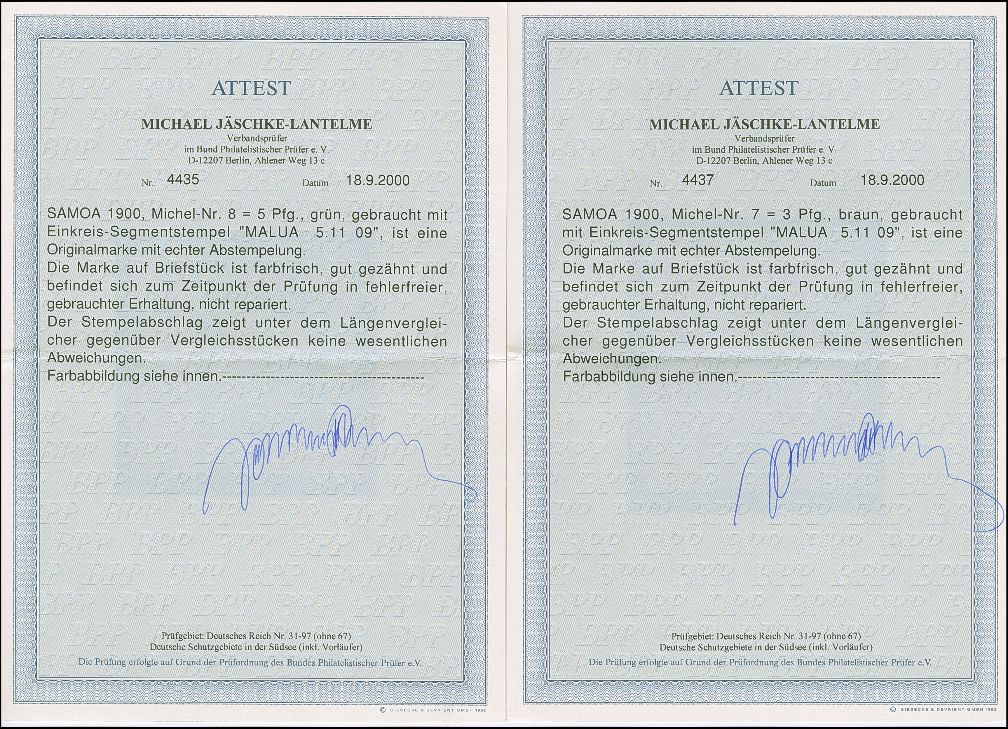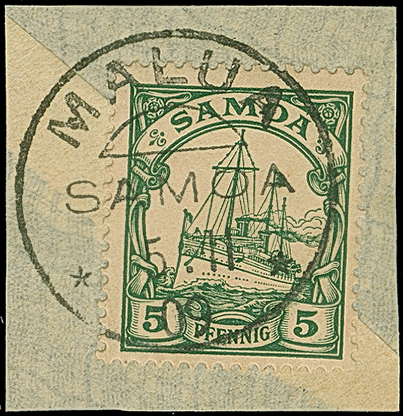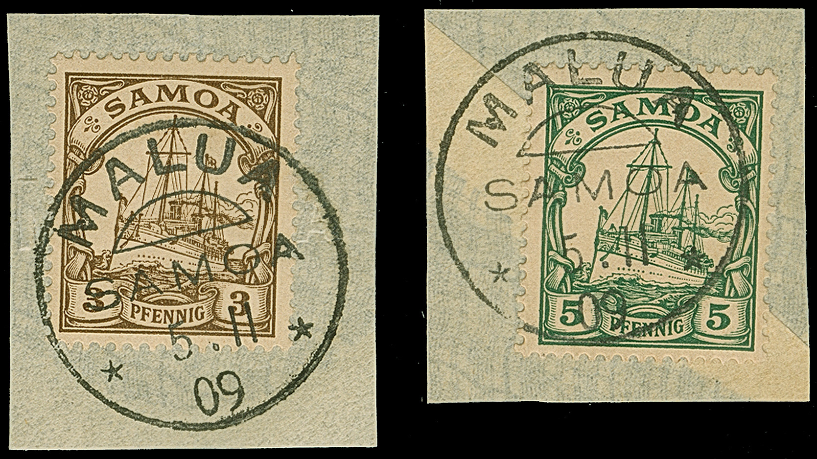 “MALUA SAMOA 5.11.09” zweimal klar auf Kaiseryacht 3 und 5 Pfg. auf zwei Briefstücken, in einwandfreier Erhaltung, jeweils mit Fotoattest Jäschke-L. BPP (2000)