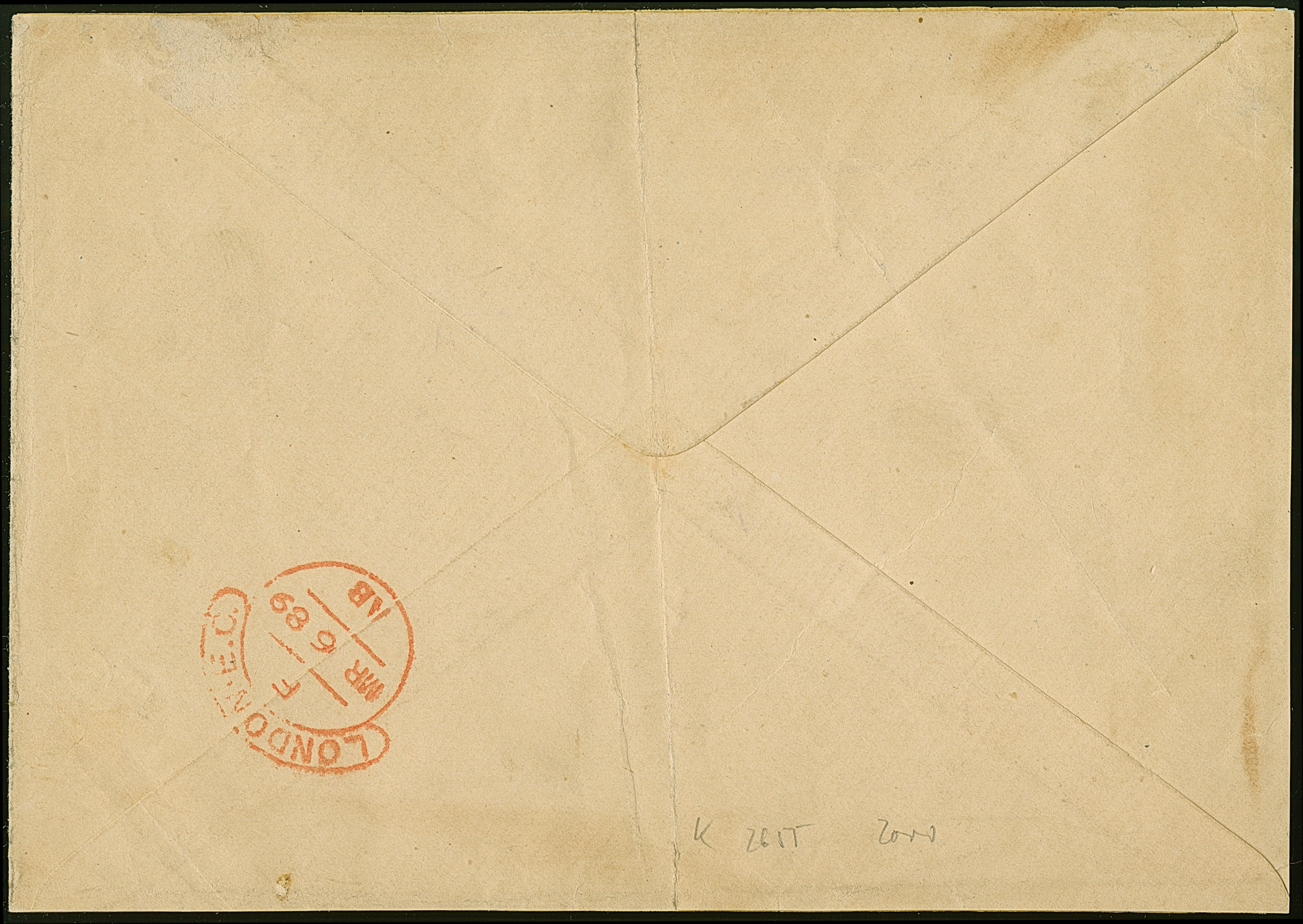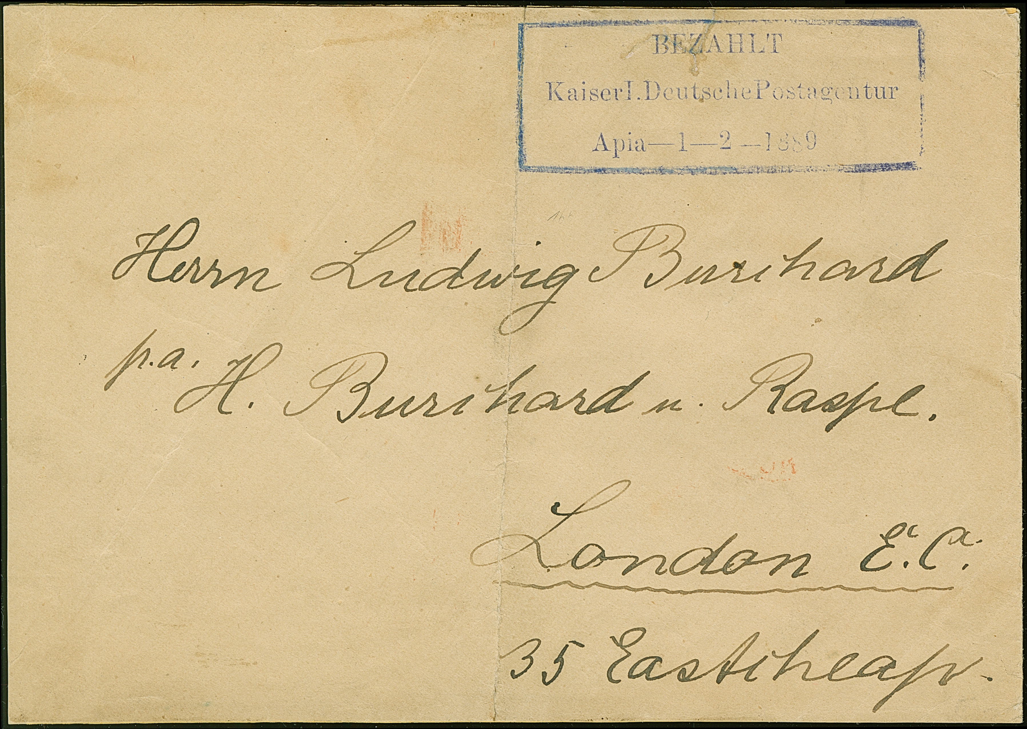 1889, “BEZAHLT Kaiserl. Deutsche Postagentur Apia-1-2-1889” klar vom Ersttag, ohne handschriftlichen Vermerk der Wertstufe auf Briefumschlag nach London mit Ankunftsstempel. Der Umschlag mit senkrechter Faltung (rückseitig zum Teil angetrennt), ansonsten in guter Erhaltung. Trotz der kleinen Einschränkungen ein seltener Brief vom Ersttag für die Barfreimachung mit Destiniation England