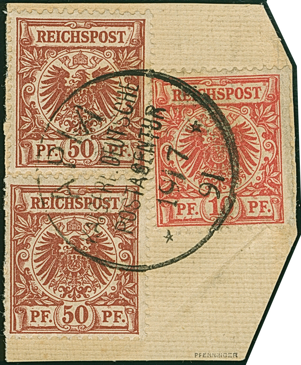1890, Krone/Adler 50 Pfg. (lebhaft)braunrot, zwei Einzelmarken und 10 Pfg. lebhaftrosarot mit klarem Stempel “APIA KDPAg 19.7.91” auf Briefstück. Die beiden 50 Pfg.-Marken mit wenigen leicht verkürzten Zahnspitzen durch Randklebung, die 10 Pfg.-Marke rechts mit Bügen und Druckspuren. Trotz der kleinen Einschränkungen ein dekoratives Briefstück, signiert Pfenninger und Bothe BPP mit Fotoattest (1981)