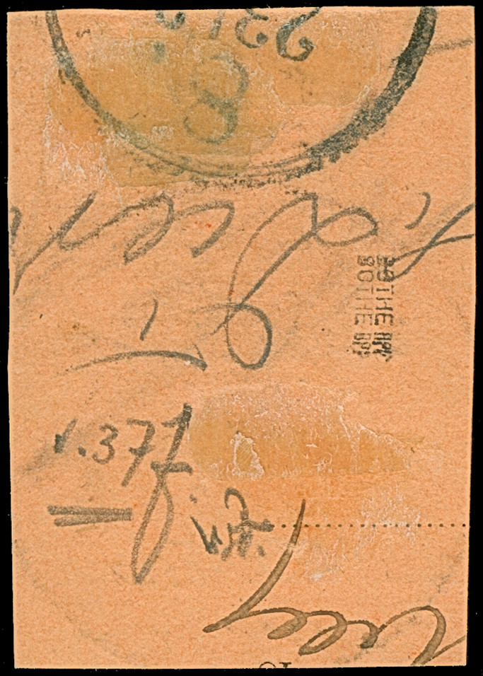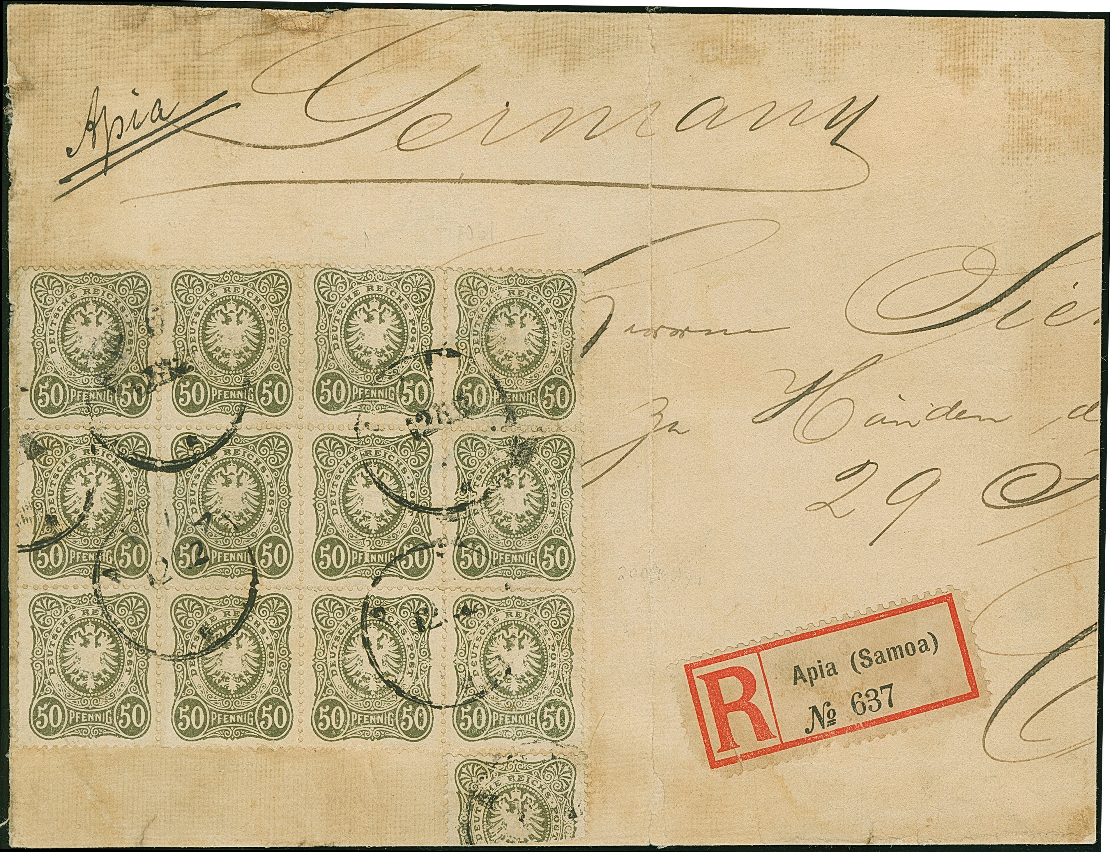 1887, 50 Pfg. (dunkel)oliv im 12er-Block und eine halbierte Marke je mit Stempel “APIA 12.12.” (ohne Jahreszahl vom Ersttag) auf großem Leinen-Briefstück mit R-Zettel. Die Marken zum Teil mit kleinen Zahnfehlern bzw. Schürfstellen und das Briefstück mit senkrechter Faltung und Patina, ansonsten in guter Gesamterhaltung, Interessante Einheit mit dieser seltenen Entwertung vom ERSTTAG