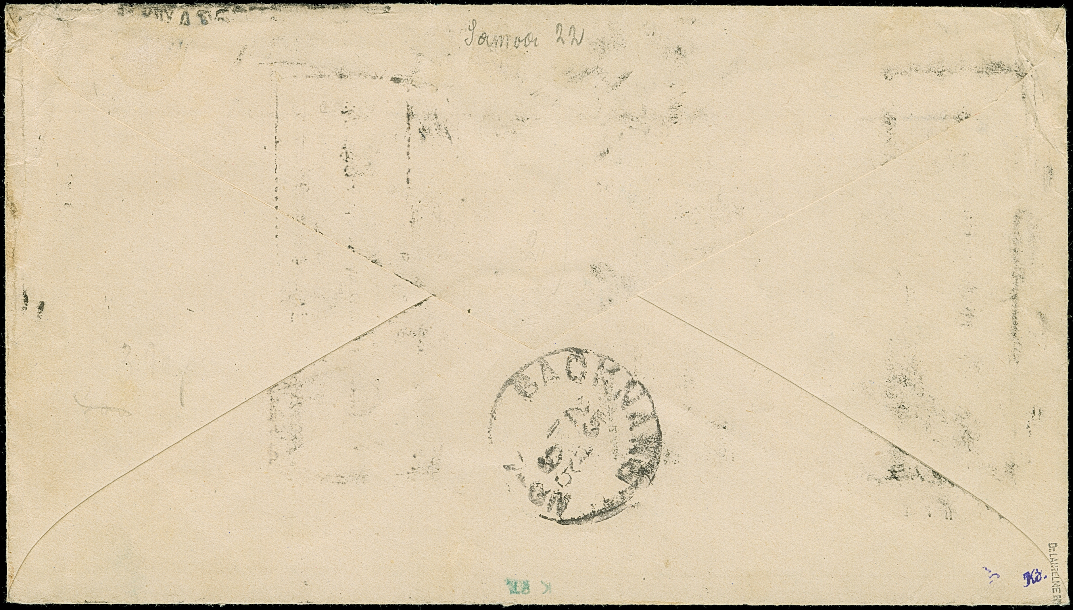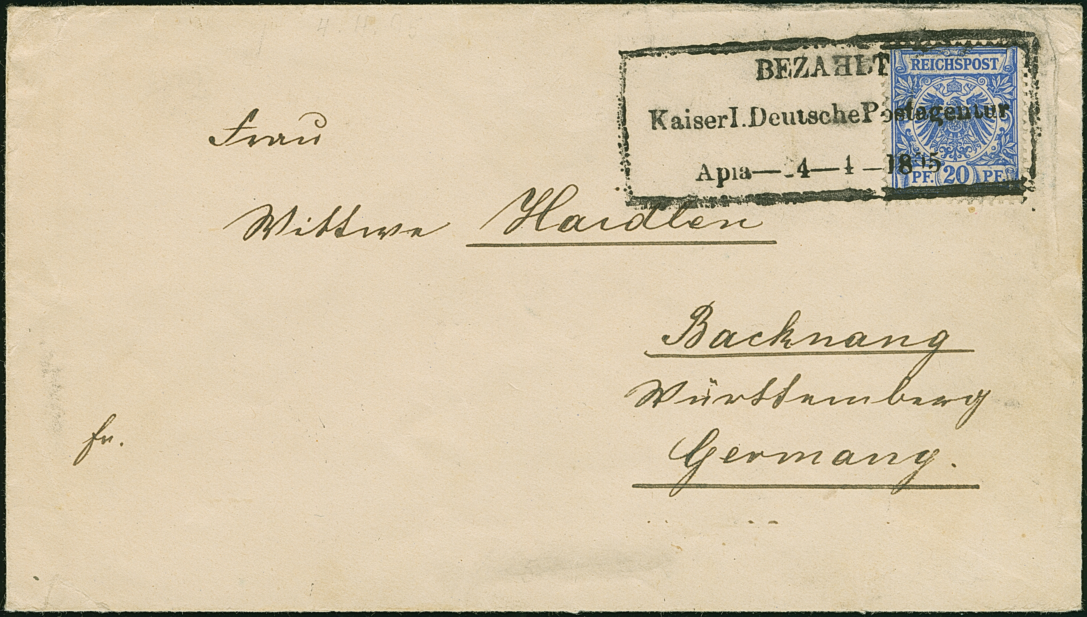1890, Krone/Adler 20 Pfg. mittelultramarin mit Rahmenstempel “BEZAHLT Kaiserl. Deutsche Postagentur Apia-24-4-1895” auf Brief nach Backnang mit Ankunftsstempel. Der Umschlag mit Randspuren, die farbfrische Marke ist in einwandfreier Erhaltung, signiert Dr. Lantelme BPP
