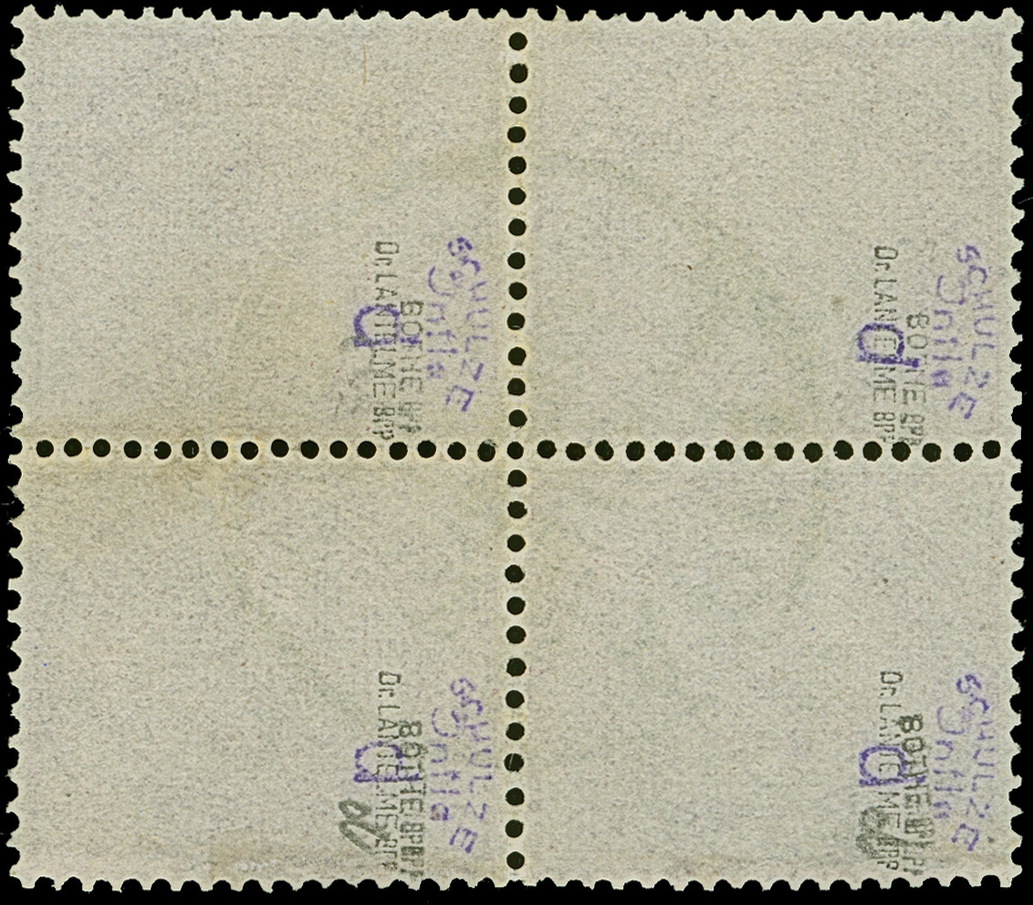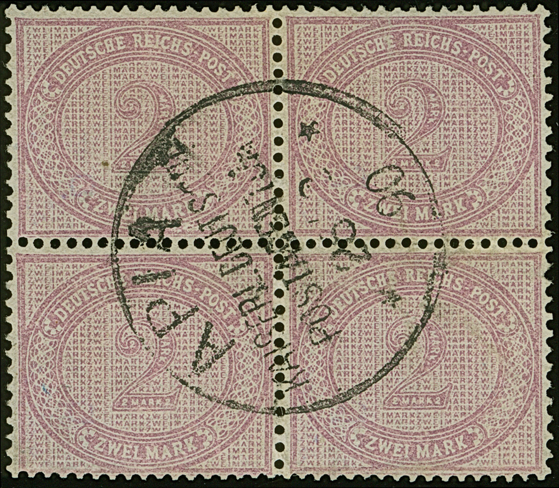 1886/90, 2 M. lebhaftgraulila im Viererblock mit zentrischem Stempel “APIA KDPAg ** 26.2.90”. Die farbfrischen Marken sind gut gezähnt, die linke untere Marke hat ein winziges Nadelloch und die linke obere Marke ein winziges Holz-Einschlussstück, ansonsten in einwandfreier Erhaltung. Ein dekorativer Viererblock dieser seltenen Marke, sign. Schulze Infla d, Bothe BPP und Dr. Lantelme BPP