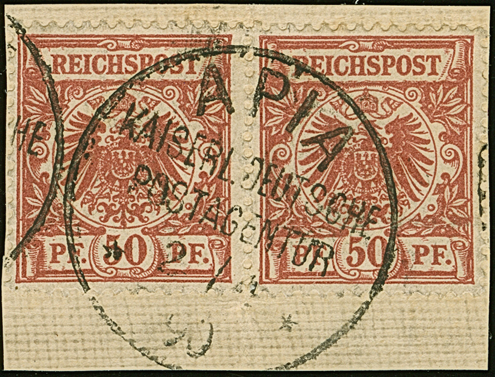 1890, Krone/Adler 50 Pfg. bräunlichrot (dunkelrosarot quarzend) im waagerechten Paar mit klarem Stempel “APIA KDPAg ** 2.4.90” auf Briefstück. Das Briefstück mit senkrechter Faltung zwischen der senkrechten Zähnung der beiden Marken, diese sind farbfrisch und gut gezähnt, in einwandfreier Erhaltung, doppelt sign. Pfenninger und Bothe BPP