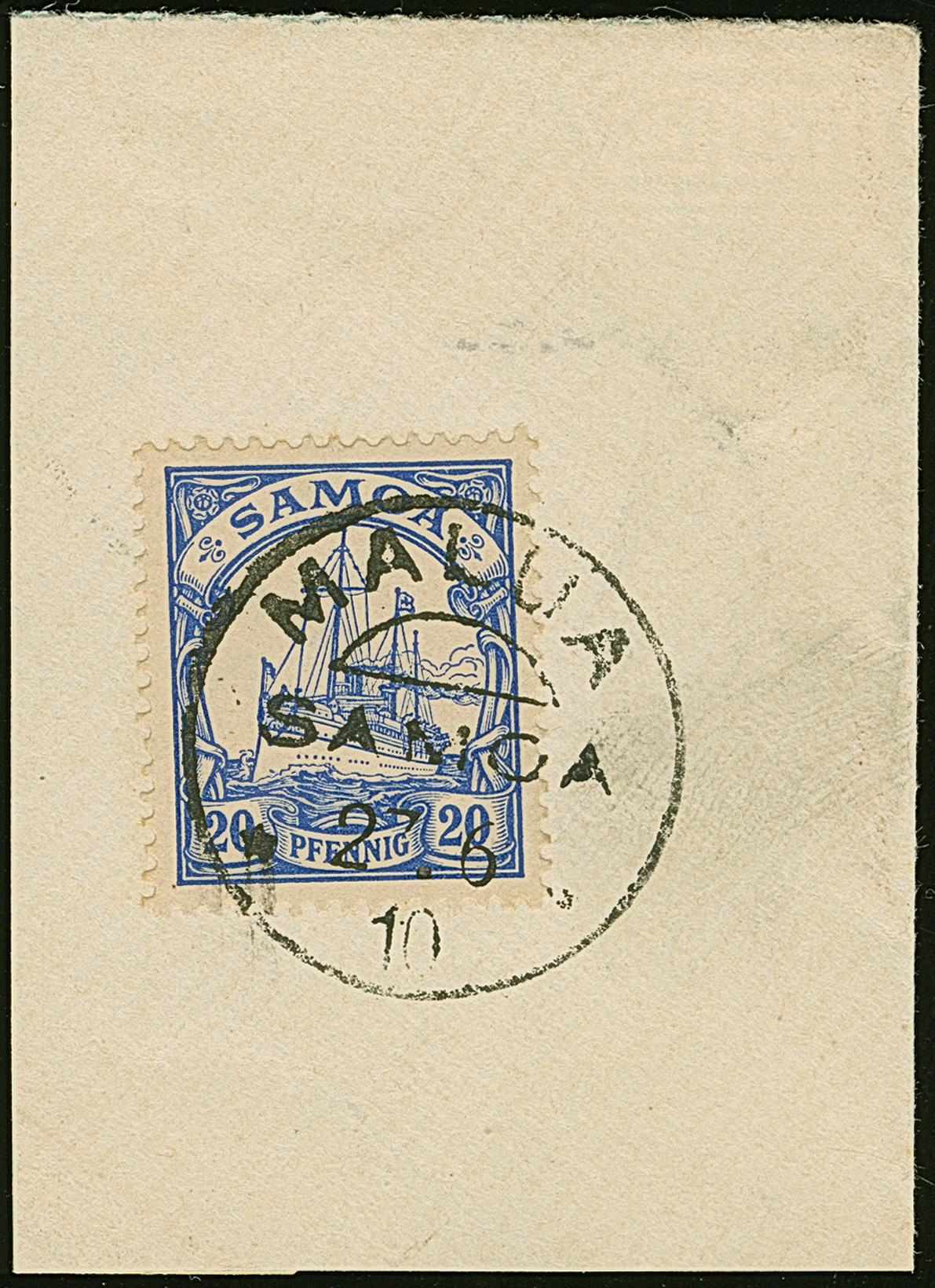 “MALUA SAMOA 2.6.10” klar auf Kaiseryacht 20 Pfg. auf Briefstück in einwandfreier Erhaltung, sign. Dr. Lantelme BPP