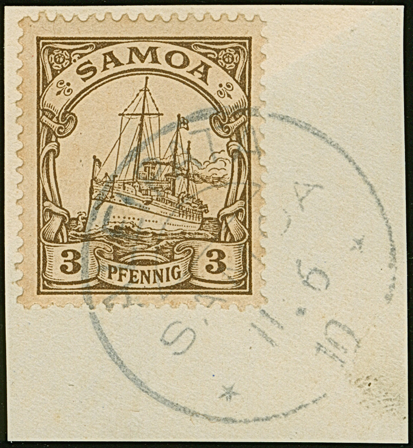 “ALEIPATA SAMOA 11.6.10” üblicher Abschlag auf Kaiseryacht 3 Pfg. auf Briefstück, in einwandfreier Erhaltung, doppelt sign. Bothe BPP
