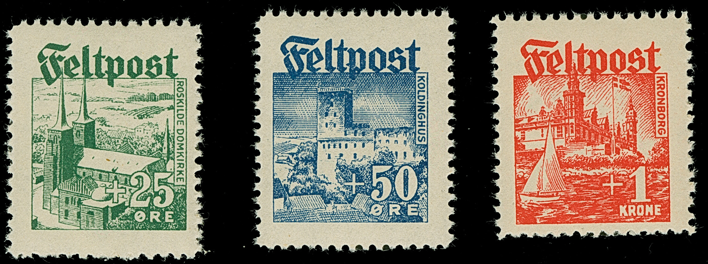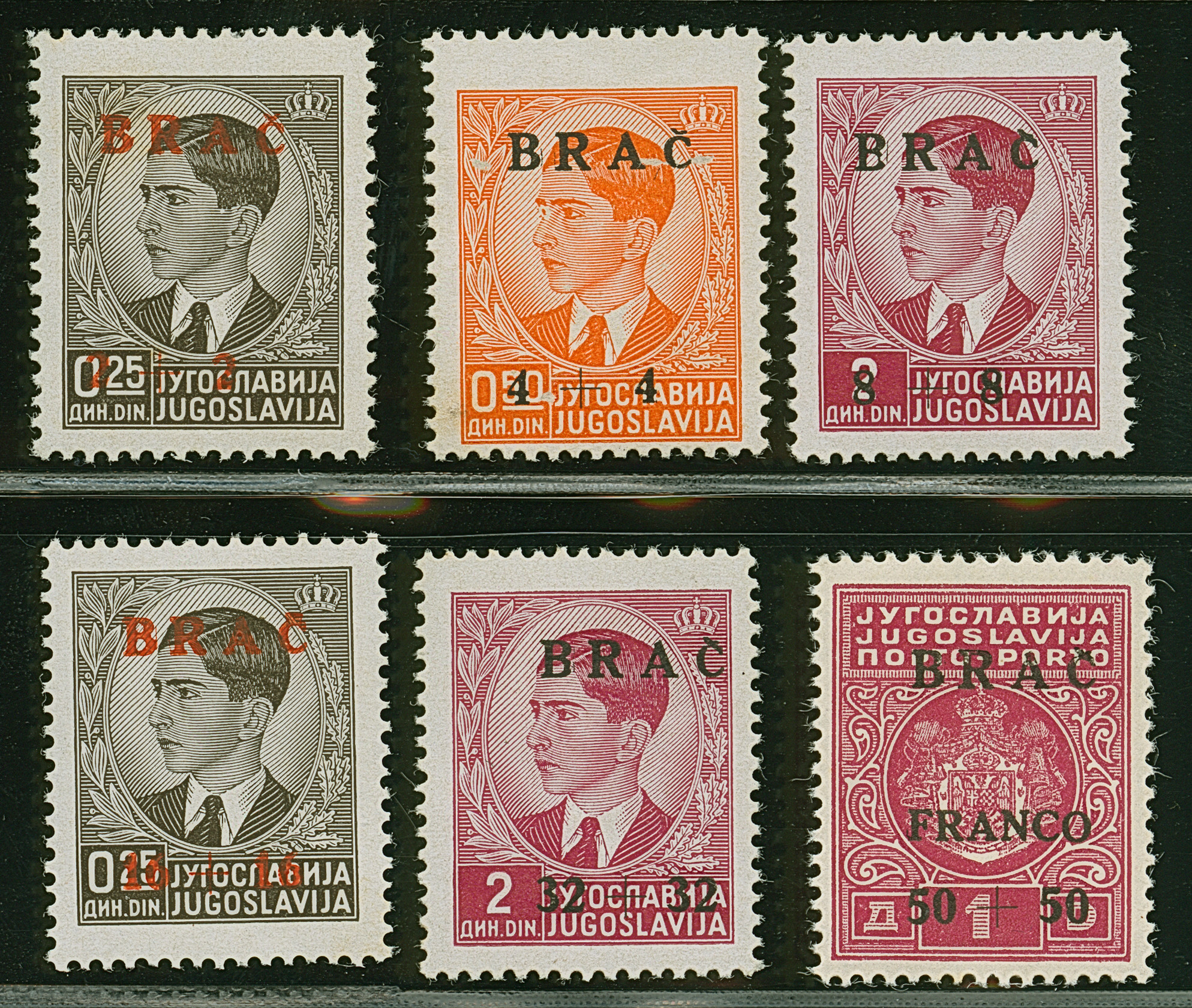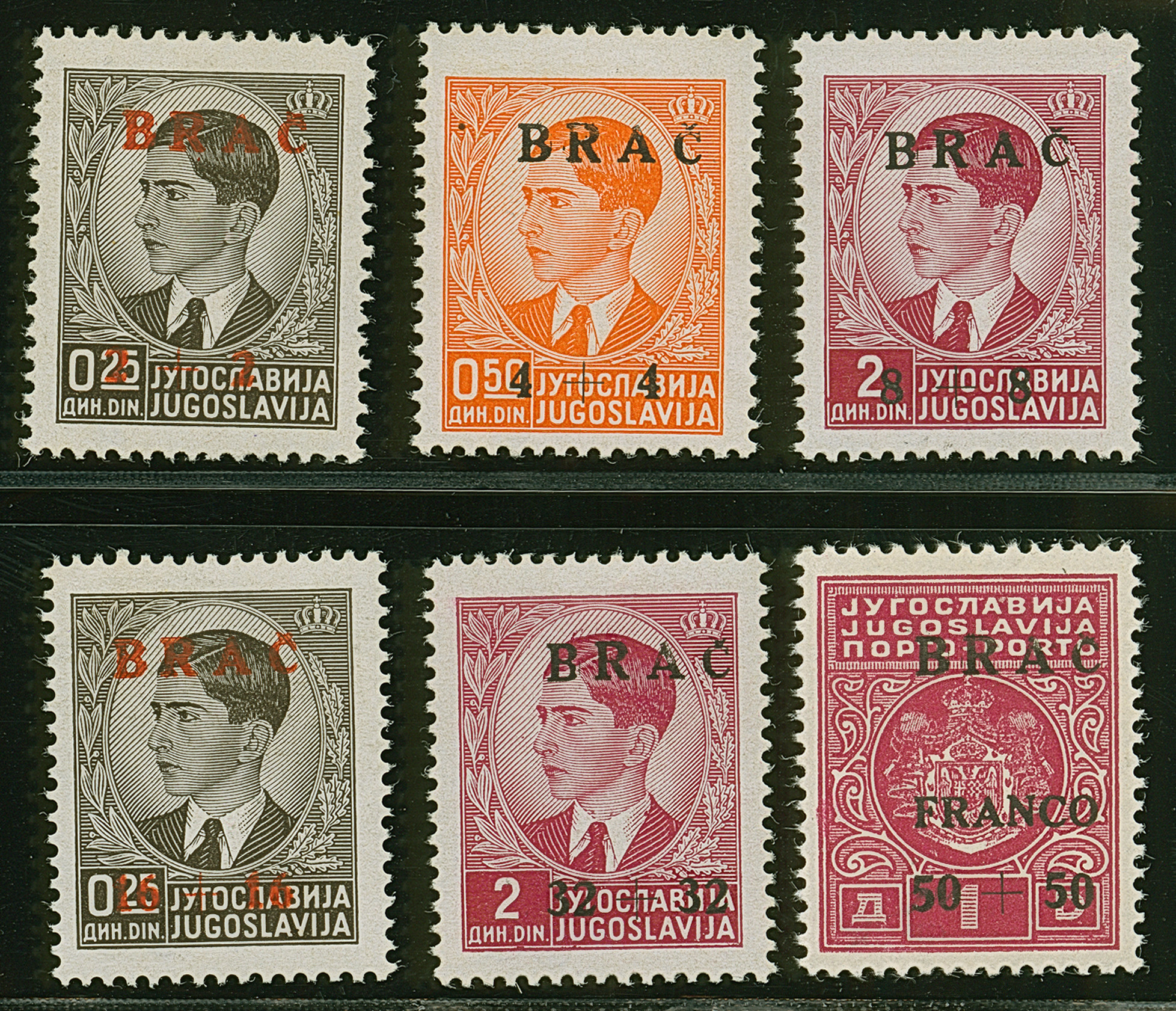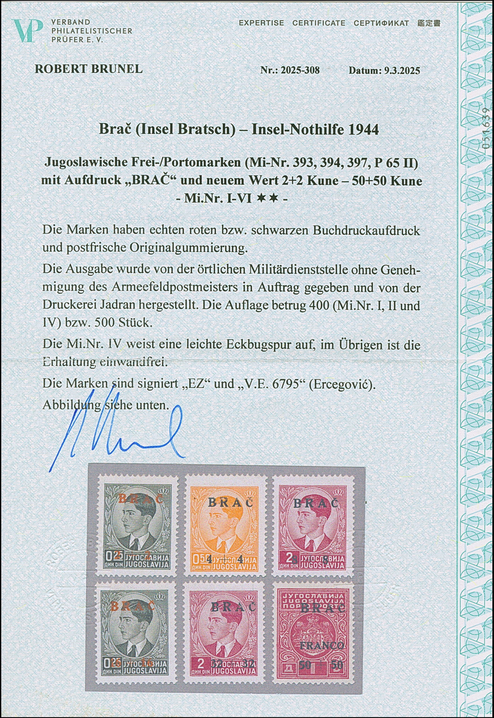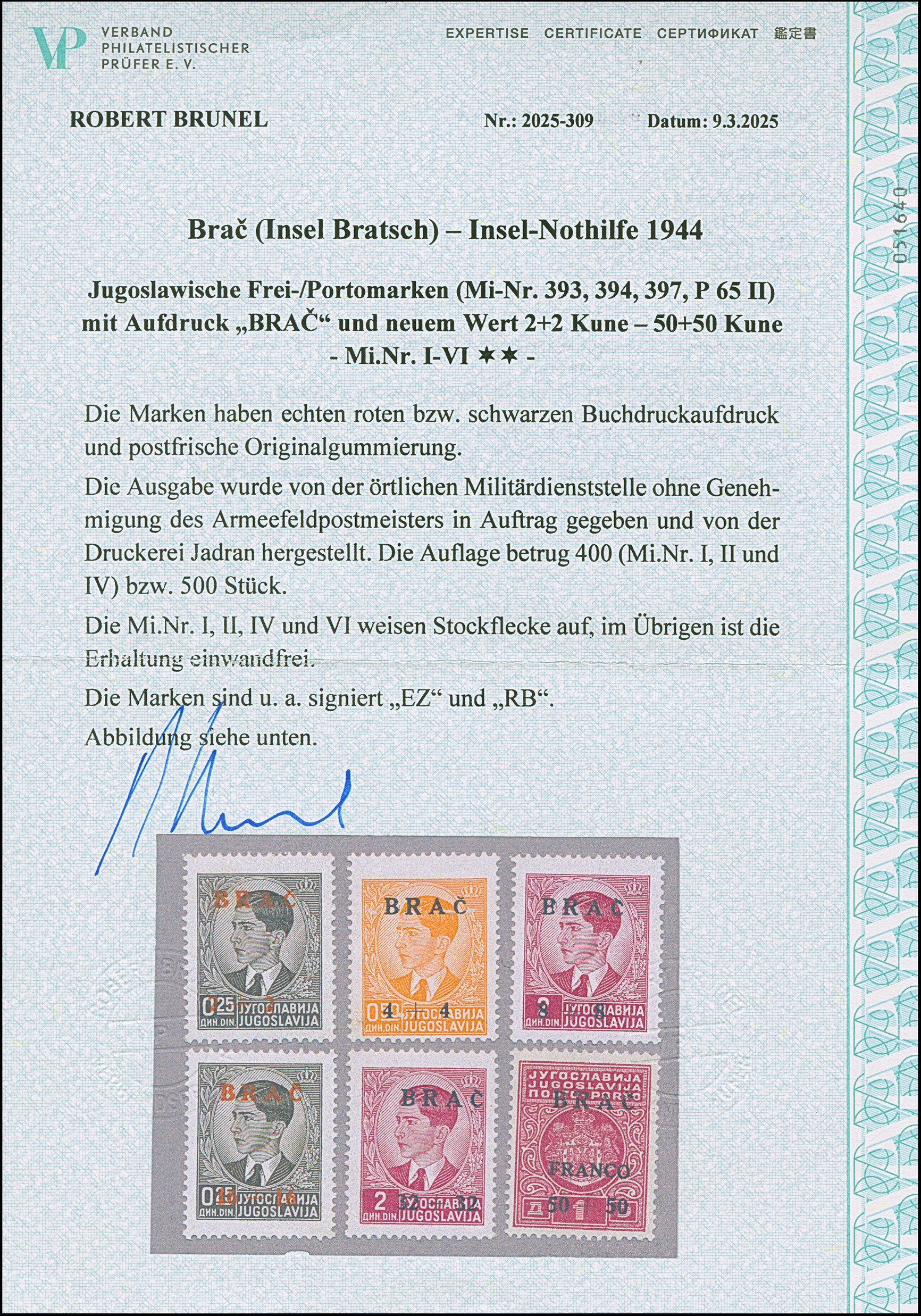 1944, Insel-Nothilfe 2-50 K., postfrisch, 16+16 K. kleiner Eckbug, sonst tadellos, teils sign. sowie Fotoattest Brunel (2025)