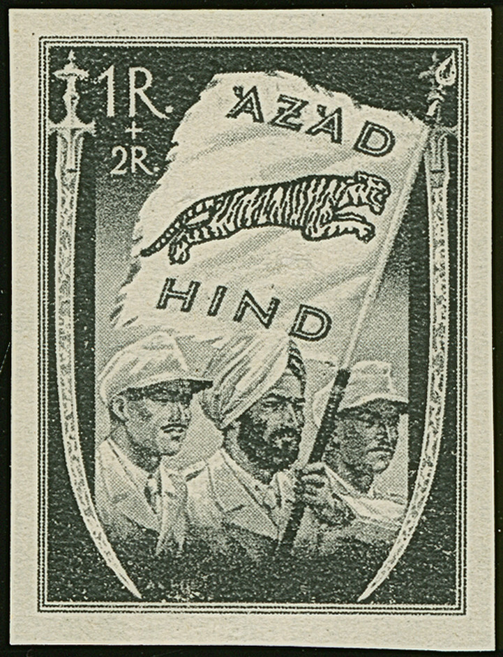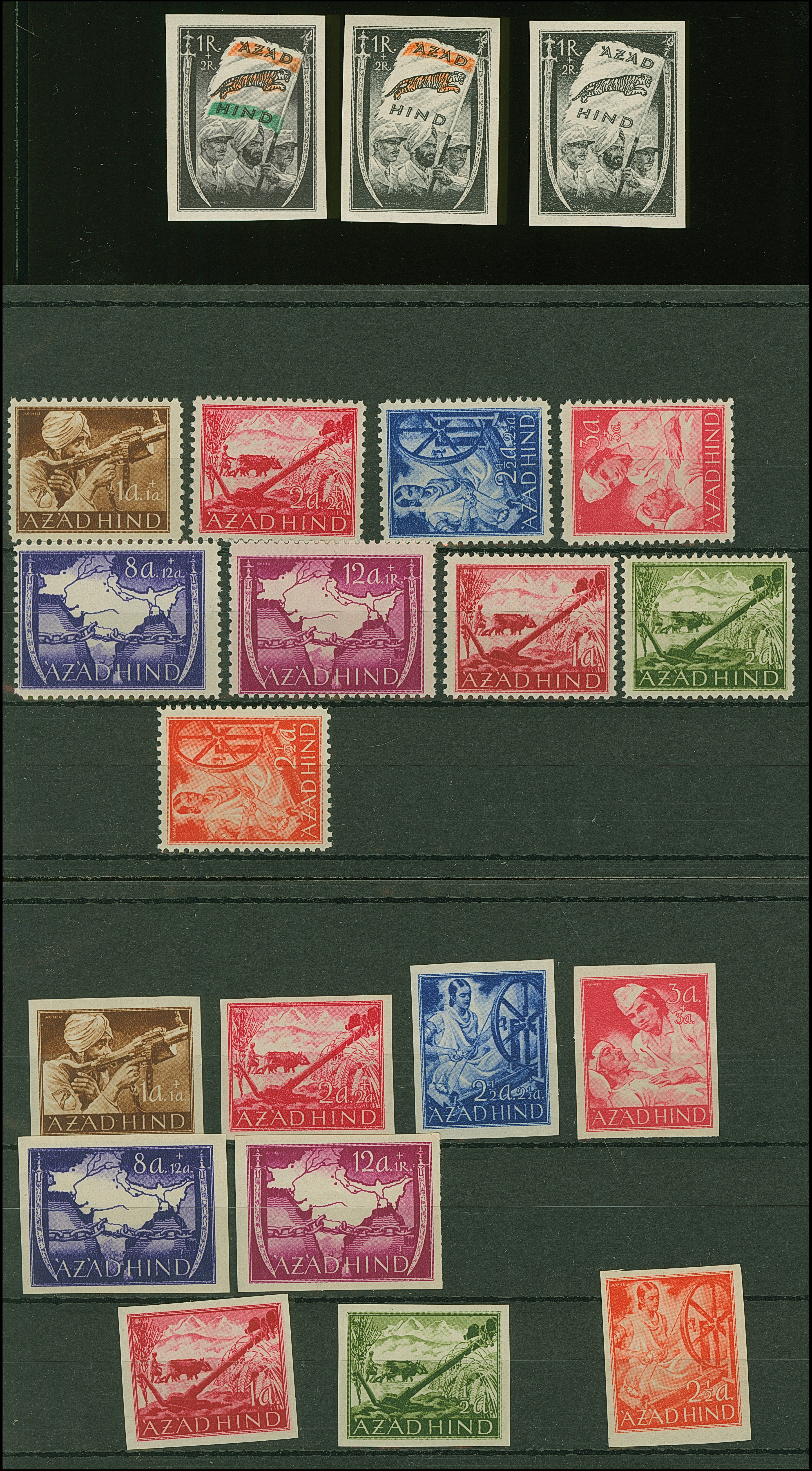 1943, Azad Hind 1-12 A. gezähnt und geschnitten, sowie 1 R., alle drei verschiedenen, postfrisch, tadellos