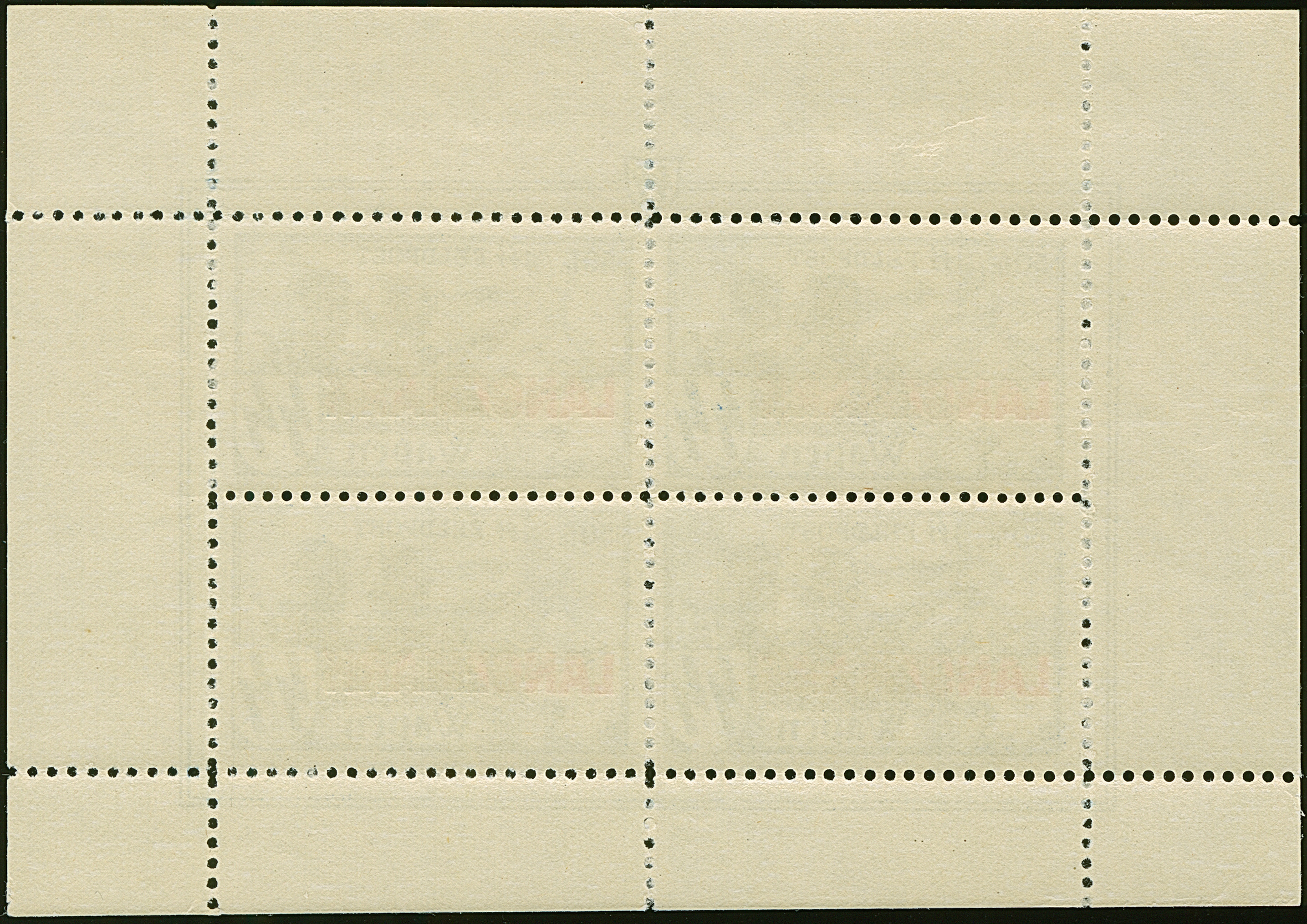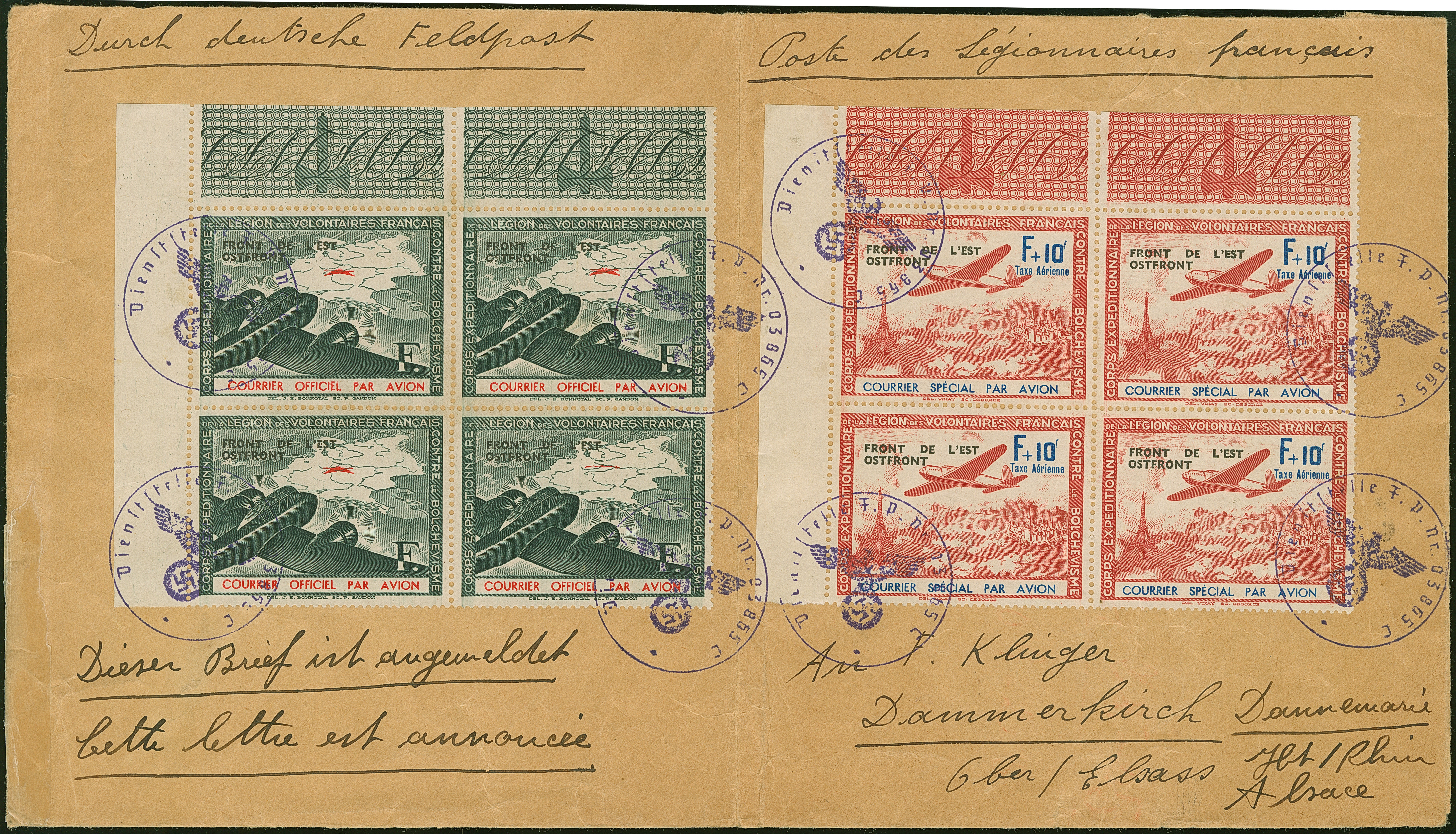 1941, Flugpostvignette F+10F. schwarzopalgrün und dunkelbräunlichrot, je im Eckrand-4er-Block auf Feldpostbrief-Vorderseite in den Elsaß, dabei Mi.-Nr. V mit Plattenfehler III auf Feld 1, Mi.-Nr. IV mit markanter Abart “rote Farbe des Sterns fast völlig fehlend” auf Feld 7, Vorderseite senkrecht gefaltet sowie etwas knittrig und links mit Falzrest, Marken einwandfrei, ein attraktives Stück.