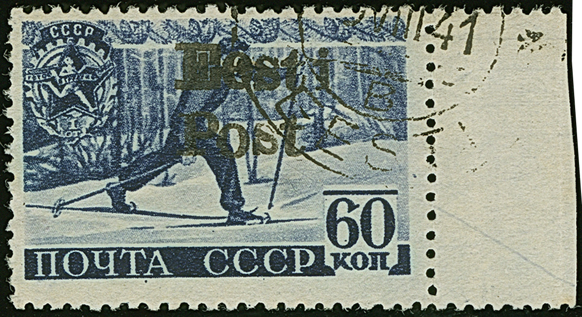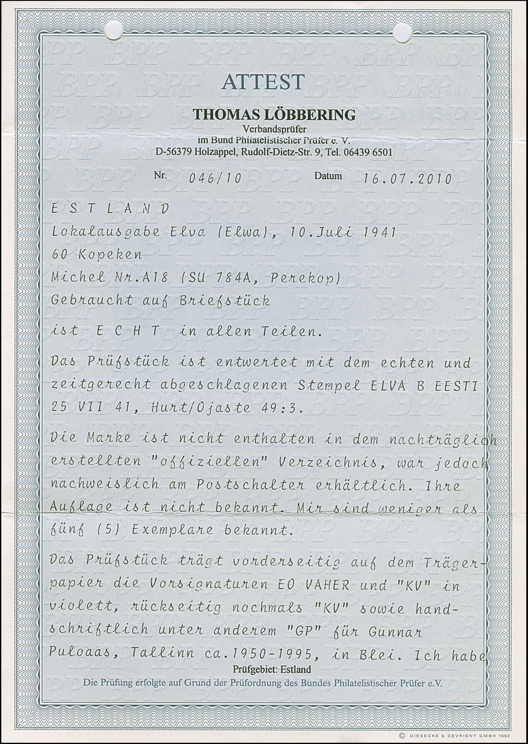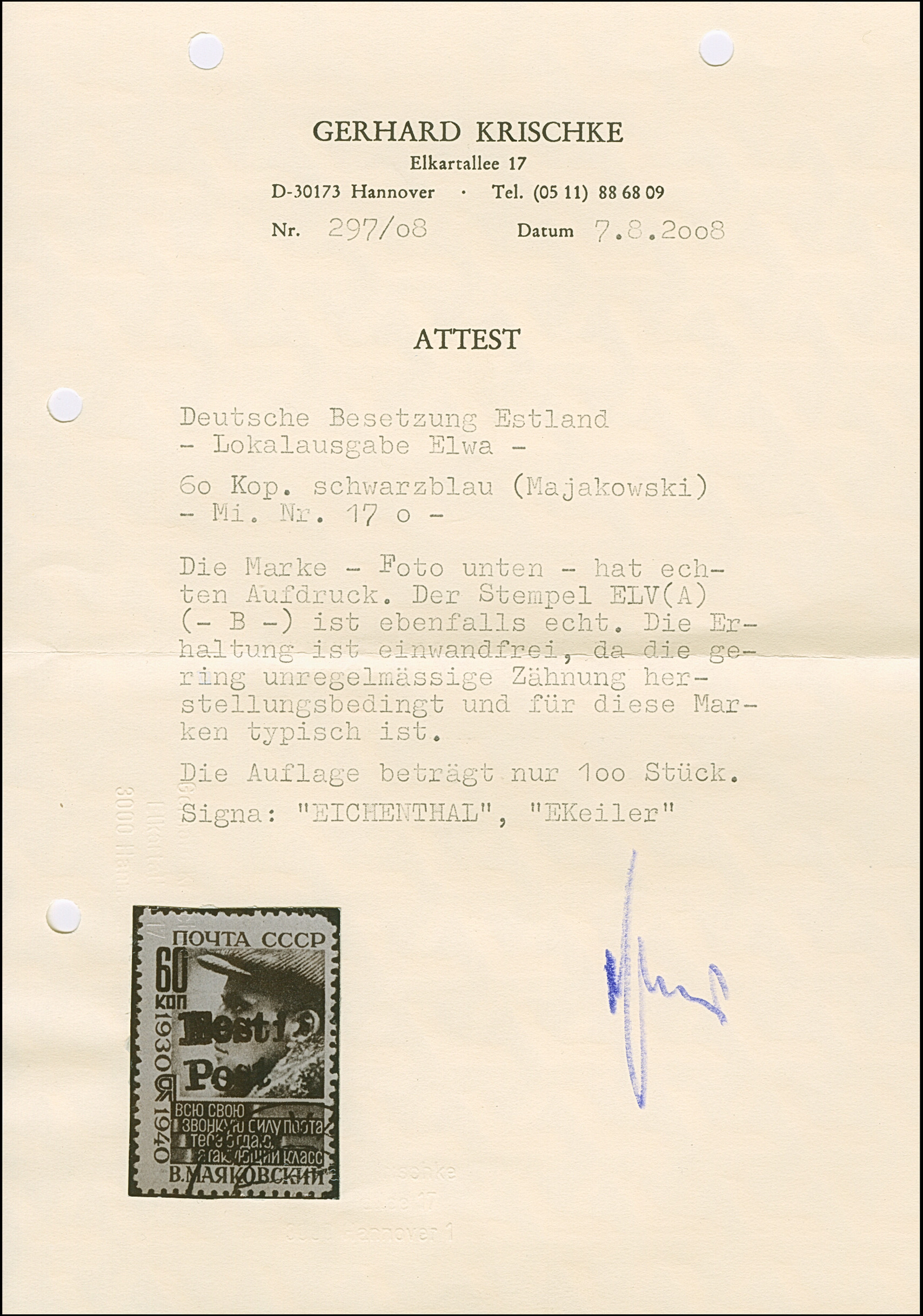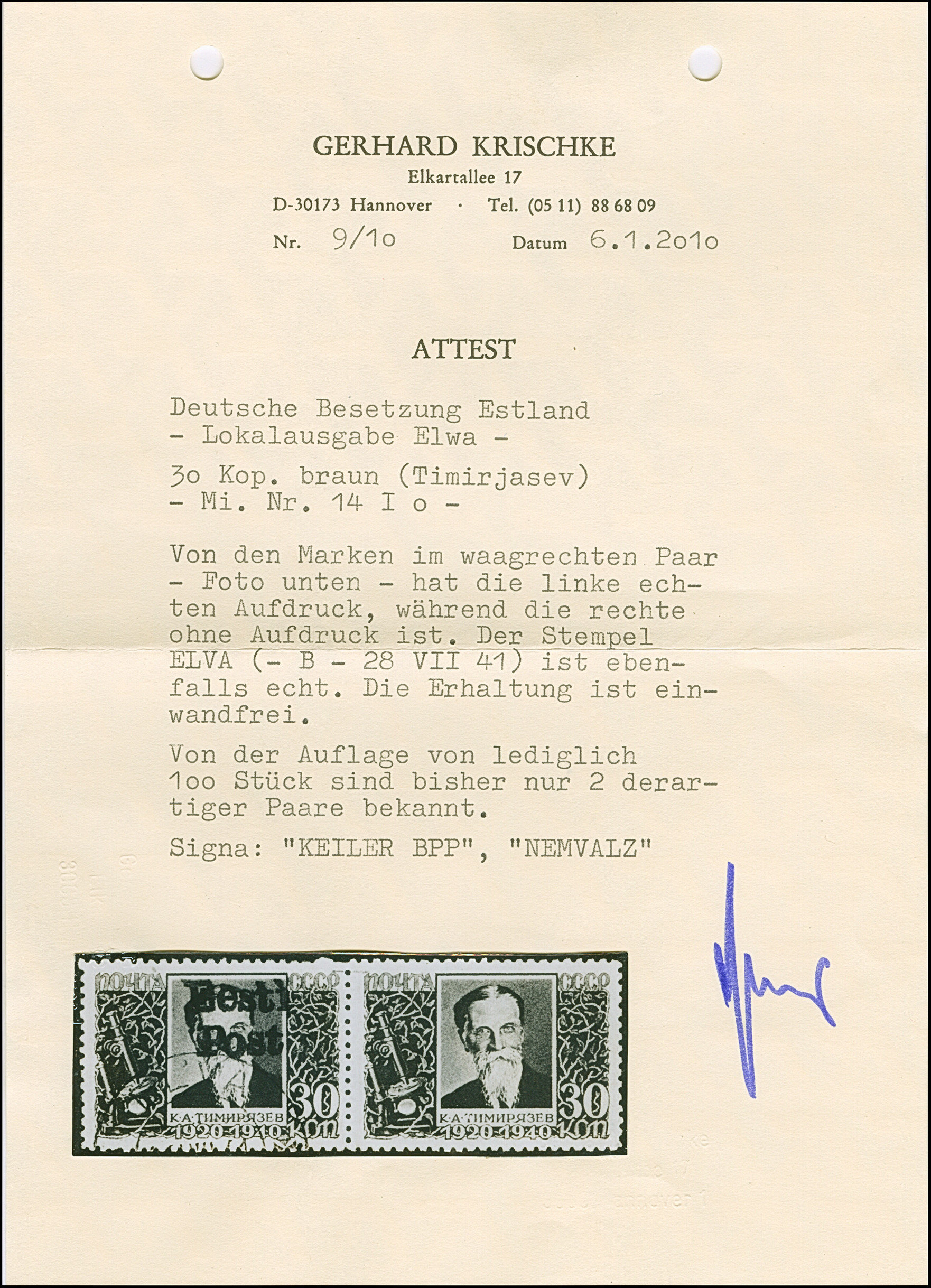 1941, 4 Kopeken, waagerechter Dreierstreifen mit rechtem Seitenrand, die mittlere Marke mit kopfstehendem Aufdruck, sauber mit Stempel “ELVA 13 VII 41” auf Blanko-Karte, umseitig bestätigt der Elwaer Postmeister R. Poll mit Unterschrift, Dienst- und Poststempel, dass die umseitige Marke echt und zeitgerecht entwertet ist, linker Wert der Normalmarke ein verkürzter Zahn, völlig belanglos, ansonsten tadellos. Eine der großen Seltenheiten, ProFi hat kein weiteres Stück dieser Abart registriert, sign. Nemvalz und Fotoattest Krischke (2001)