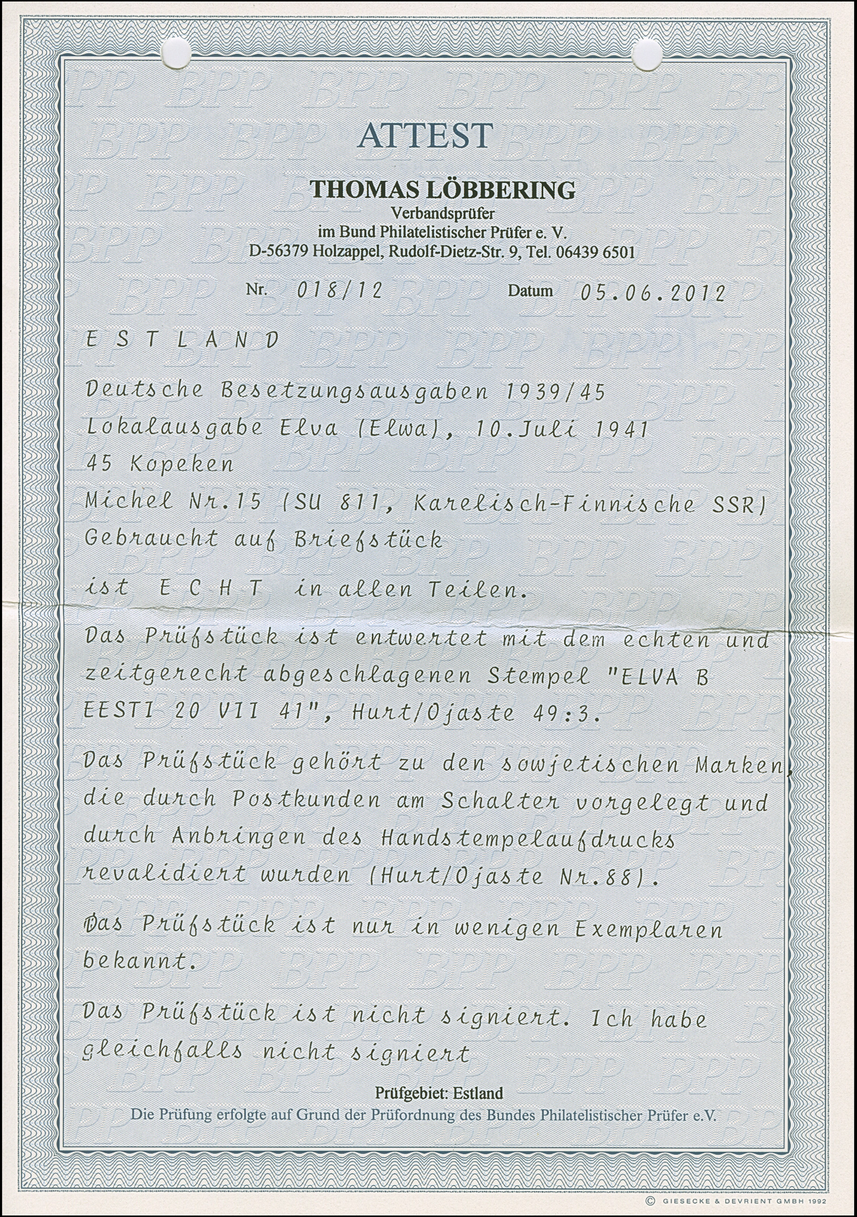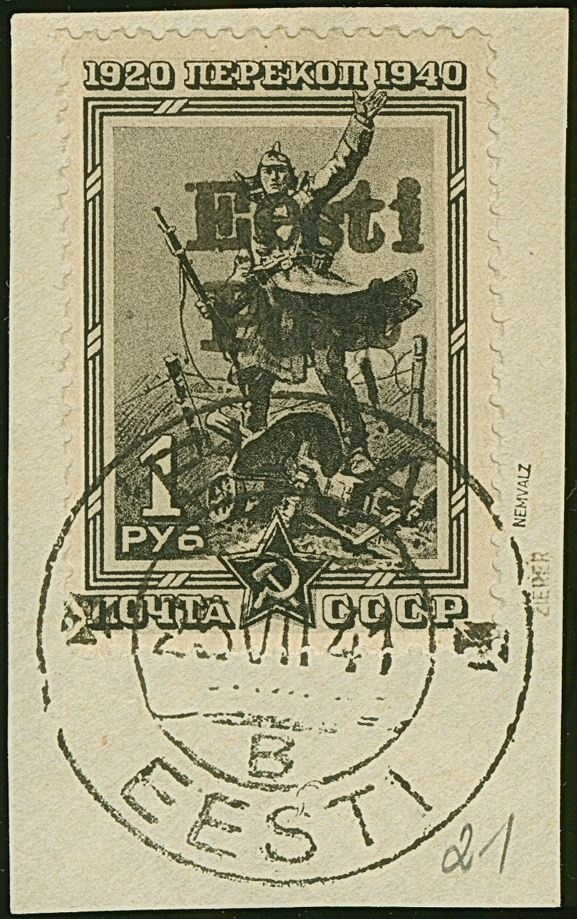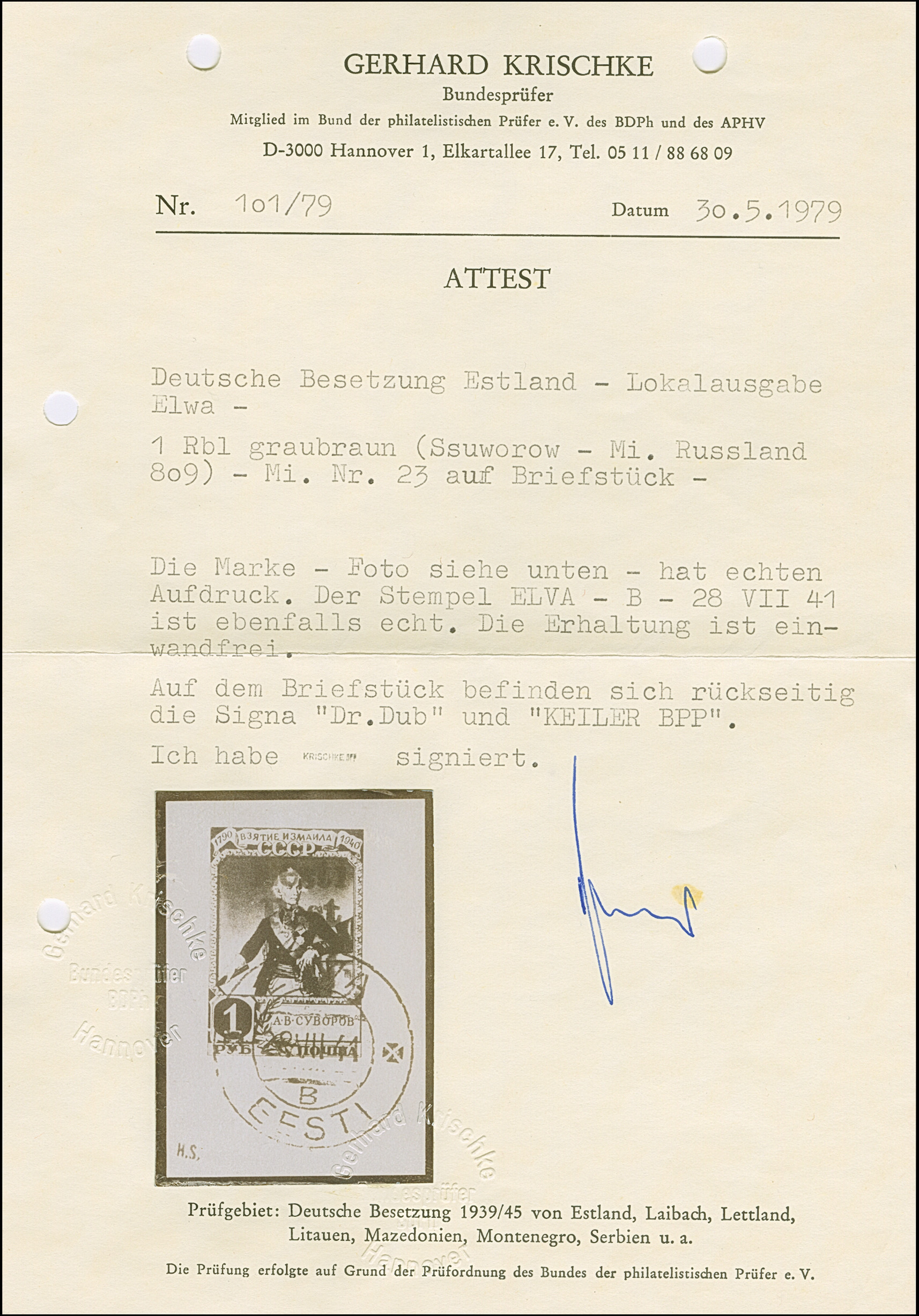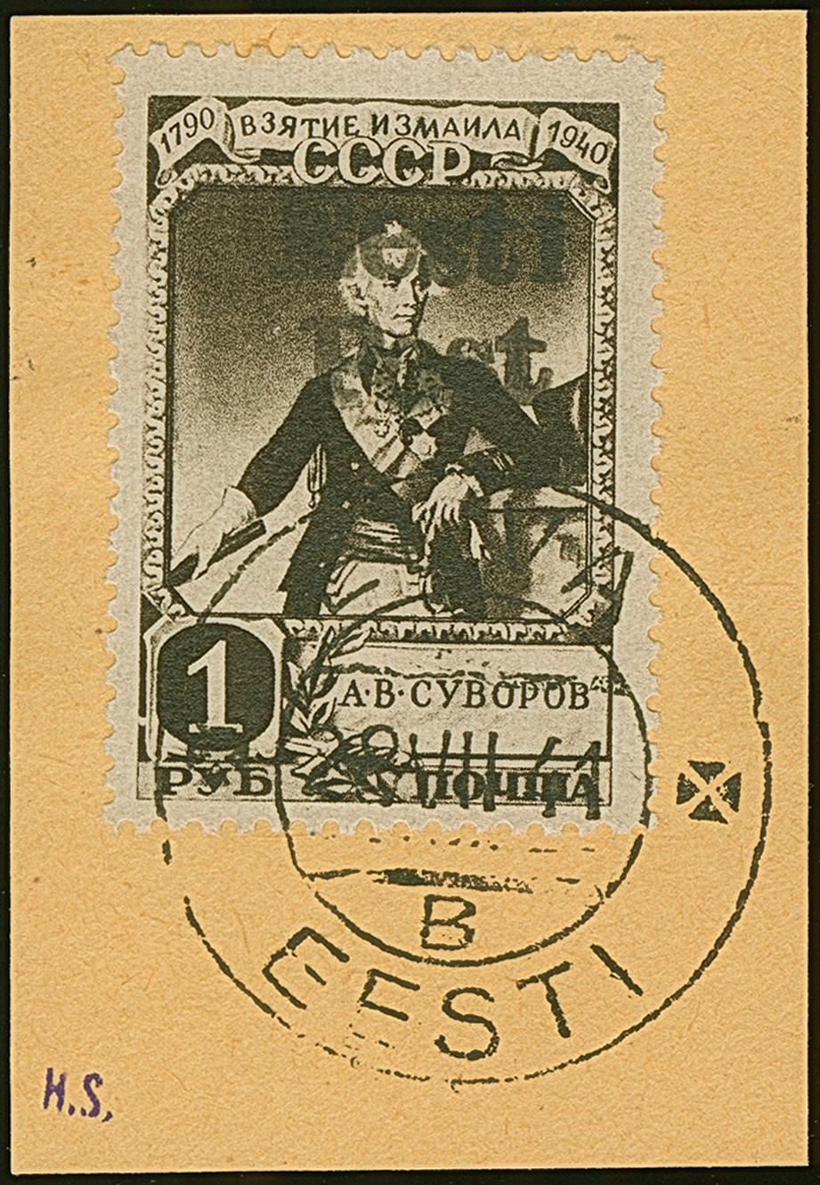 1941, Ssuworow 1 Rubel graubraun, farbfrisch und gut gezähnt, sauber mit Stempel “ELVA 28 VII 41” auf Briefstück, tadellos, u.a. sign. Dr. Dub und Keiler BPP sowie Fotoattets Krischke (1979)