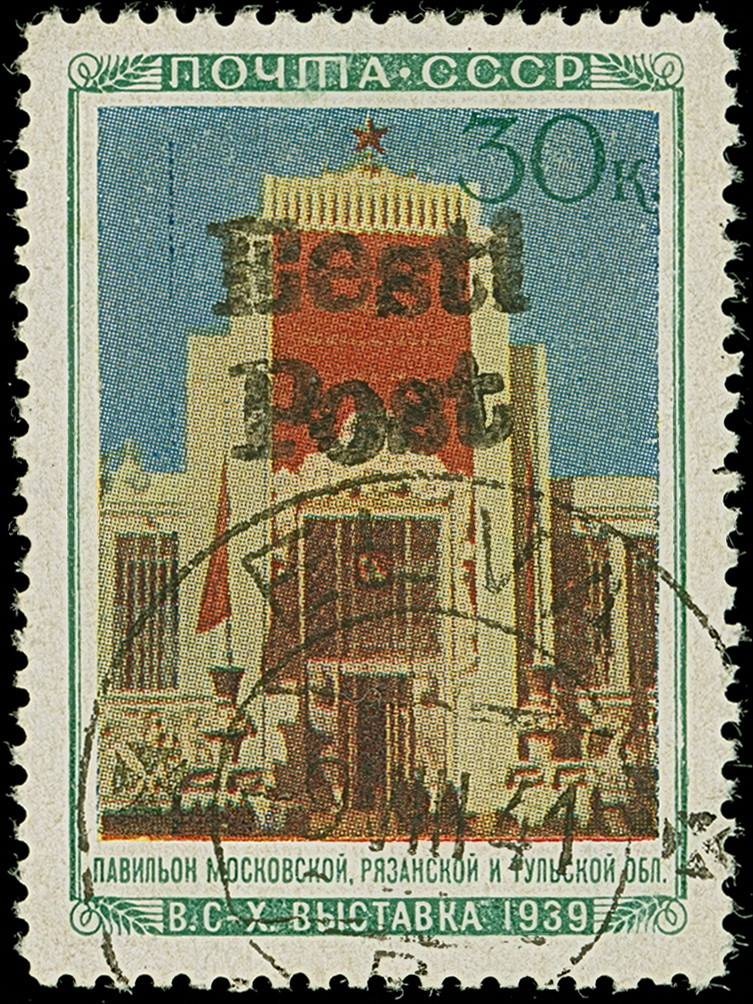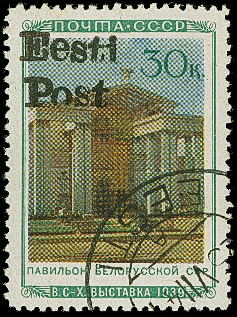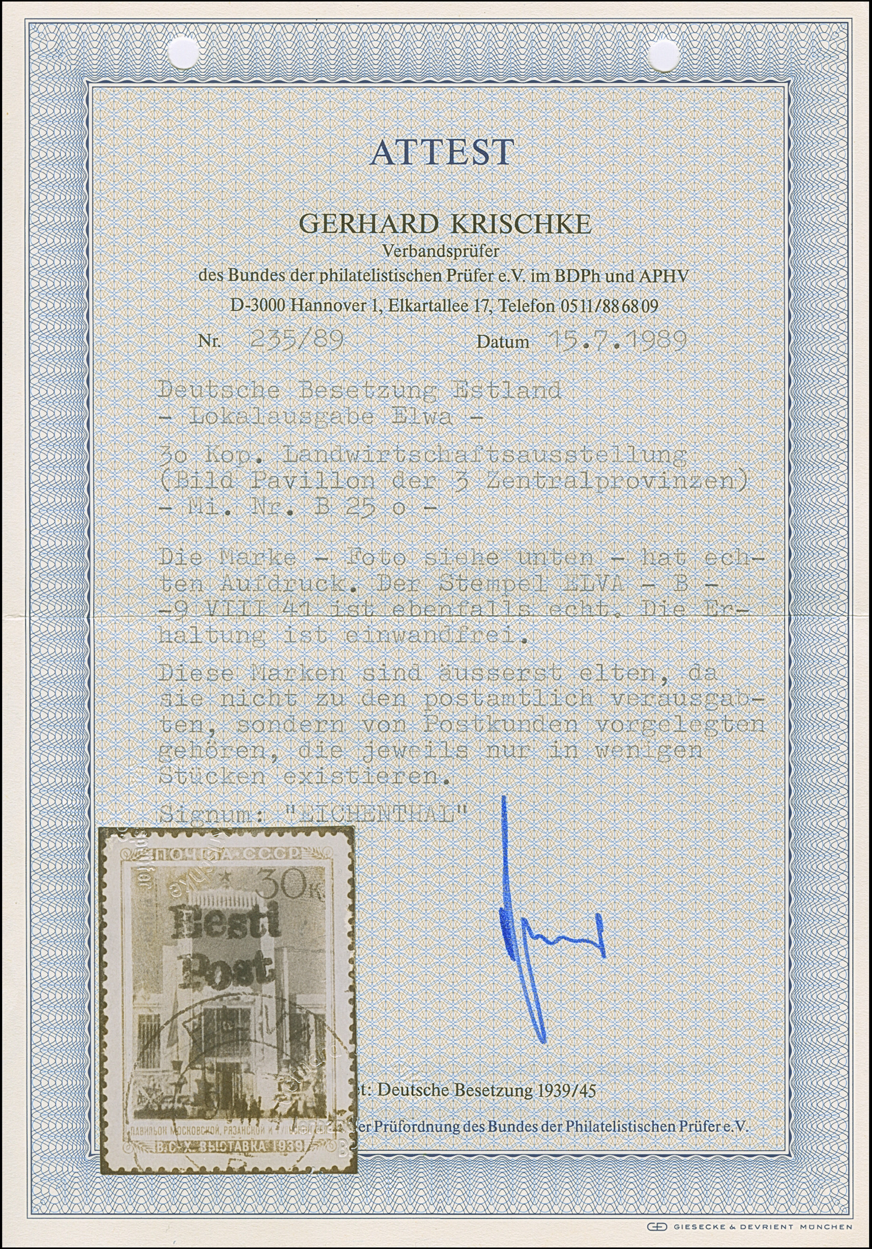 1941, Pavillon der 3 Zentralprovinzen 30 Kopeken mehrfarbig, farbfrisch und gut gezähnt, sauber gestempelt “ELVA -9 VIII 41”, tadellos. Eine der ganz großen Seltenheiten, ProFi hat lediglich 4 Stücke registriert, sign. Eichenthal sowie Fotoattest Löbbering BPP (1989)