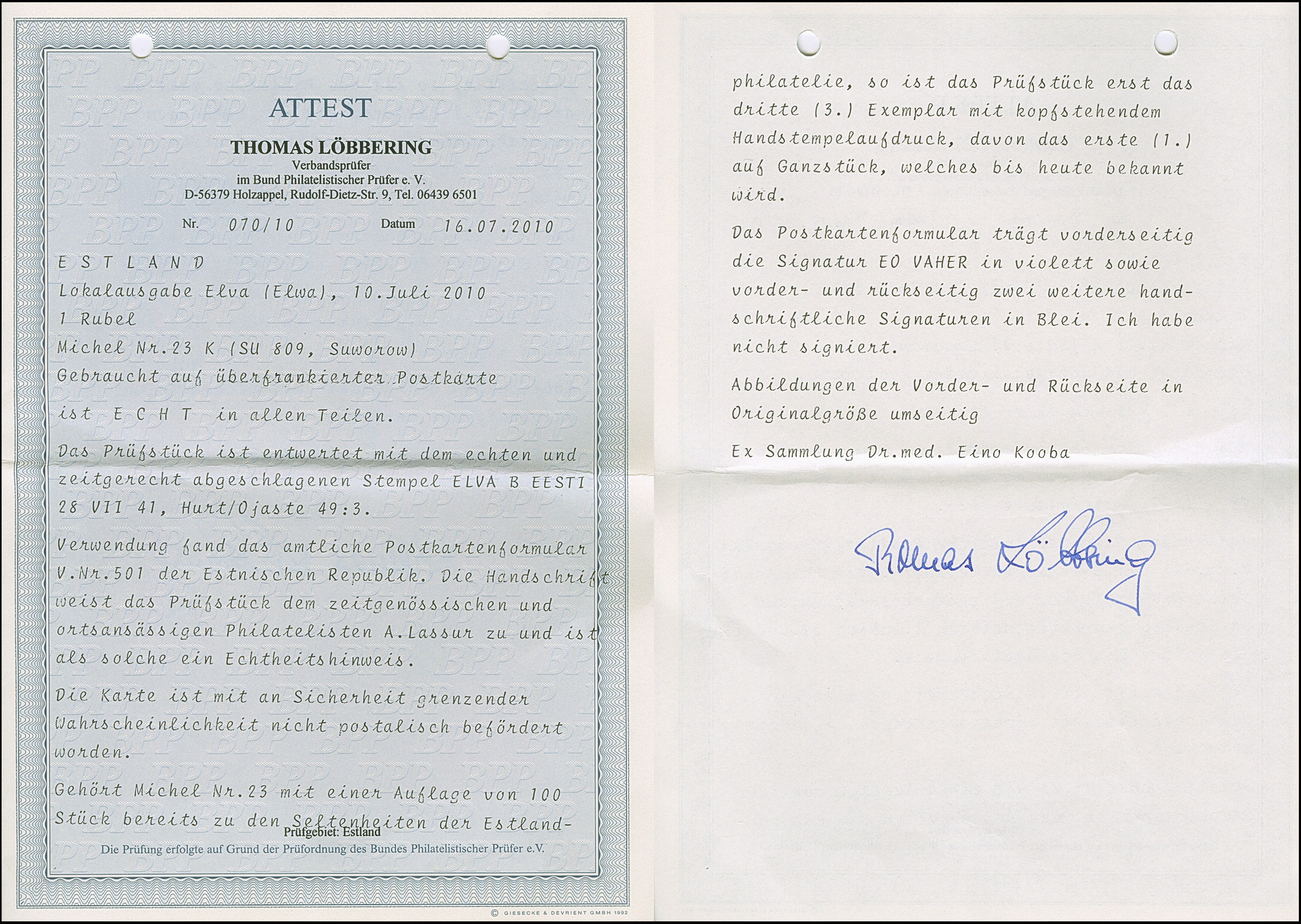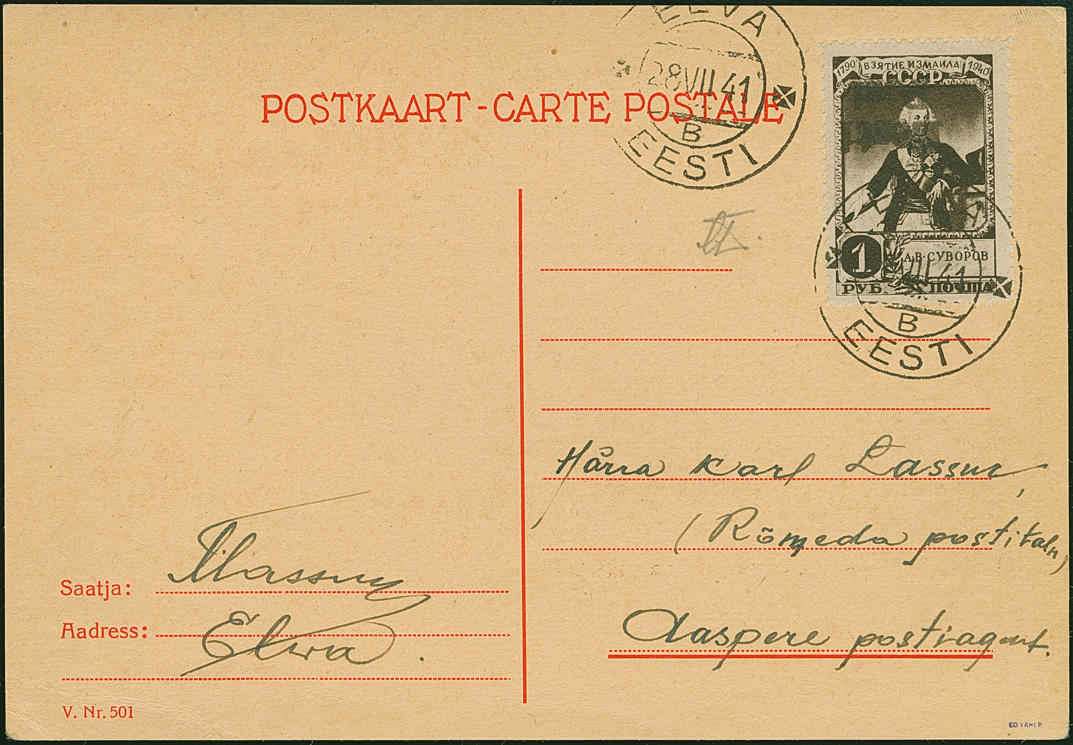 Suworow 1 Rubel mit kopfstehendem Aufdruck mit Stempel "ELVA B 28 VII 41" auf Postkartenformular, adressiert an den ortsansässigen Philatelisten A. Lassur, bereits die Normalmarke ist mit einer Auflage von 100 Stück selten, von kopfstehenden Aufdrucken hat ProFi lediglich 3 Stück registriert, keines davon ungebraucht, wobei dieses das einzige Ganzstück ist, tadellos, sign. Vaher und Fotoattest Löbbering BPP (2010)