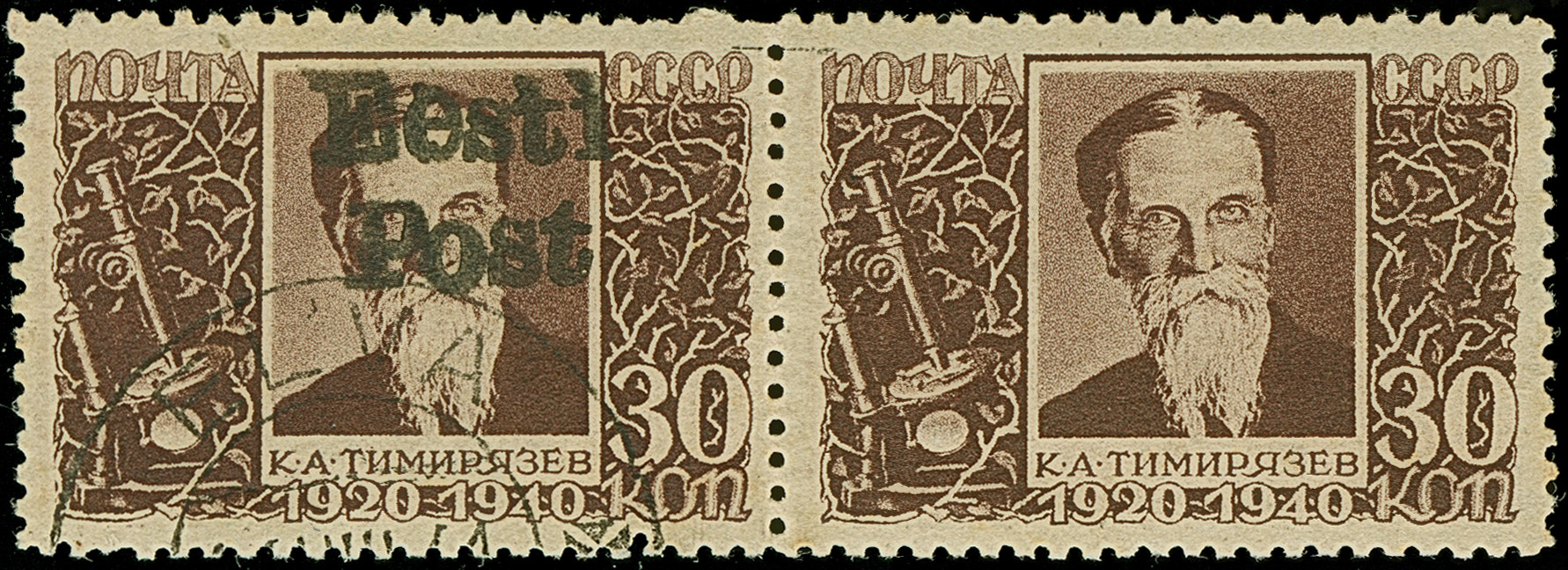 1941, Timirjasev 30 Kopeken schwarzrotbraun, waagerechtes Paar, dabei die rechte Marke ohne Aufdruck, farbfrisch und gut gezähnt, sauber gestempelt, tadellos. Eine große Seltenheit, ProFi hat lediglich ein weiteres Stück registriert, u.a. sign. Puloaas und Nemvalz sowie Fotoattest Krischke (2010)