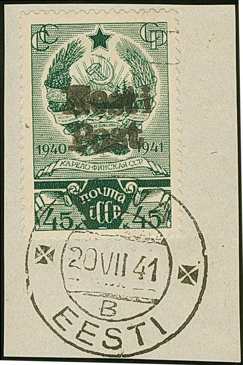 1941, Karelo-Finnische SSR 45 Kopeken dunkelblaugrün, farbfrisch und gut gezähnt, sauber mit Stempel “ELVA 20 VII 41” auf Briefstück, tadellos. Eine der ganz großen Seltenheiten, ProFi hat lediglich 5 Stück registriert, Fotoattest Löbbering BPP (2012)