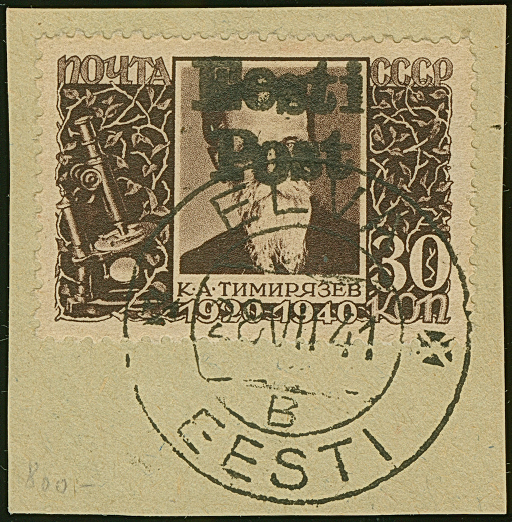 1941, Timirjasev 30 Kopeken schwarzrotbraun, farbfrisch und gut gezähnt, sauber mit Stempel “ELVA 28 VII 41” auf Briefstück, tadellos, sign. Krischke BPP