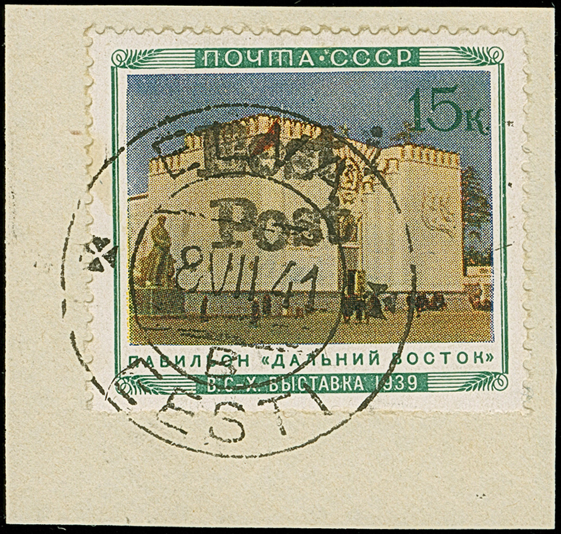 1941, Pavillon des Fernen Ostens 15 Kopeken mehrfarbig, farbfrisch und üblich gezähnt, sauber mit Stempel “ELVA 18 VII 41” auf Briefstück, tadellos. Eine seltene Marke, ProFi hat lediglich 12 Stücke registriert, u.a. sign. Vaher sowie Fotoattest Löbbering BPP (2010)