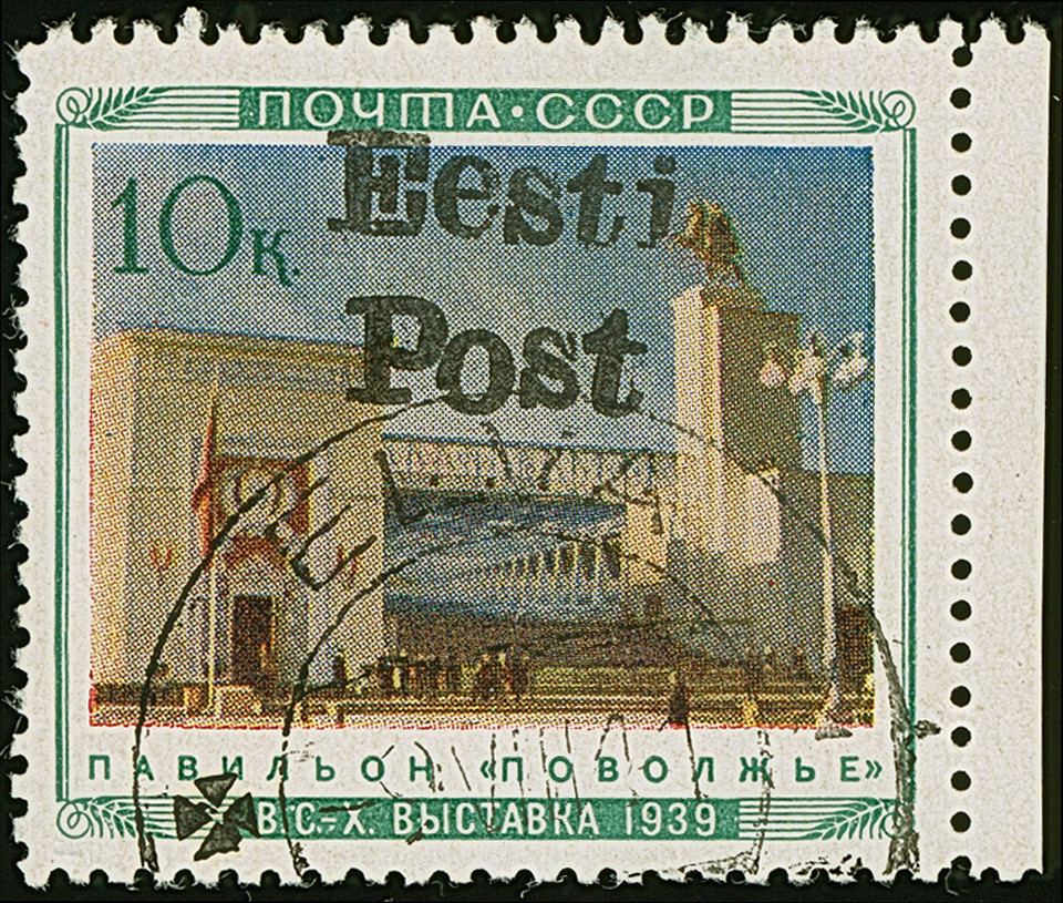 1941, Erdölbohrturm 1 Rubel schwärzlichgrün, rechte untere Bogenecke, farbfrisch und gut gezähnt, sauber gestempelt “ELVA -9.VIII.41”, tadellos, in dieser Form besonders dekorativ, sign. Nemvalz sowie Klein BPP