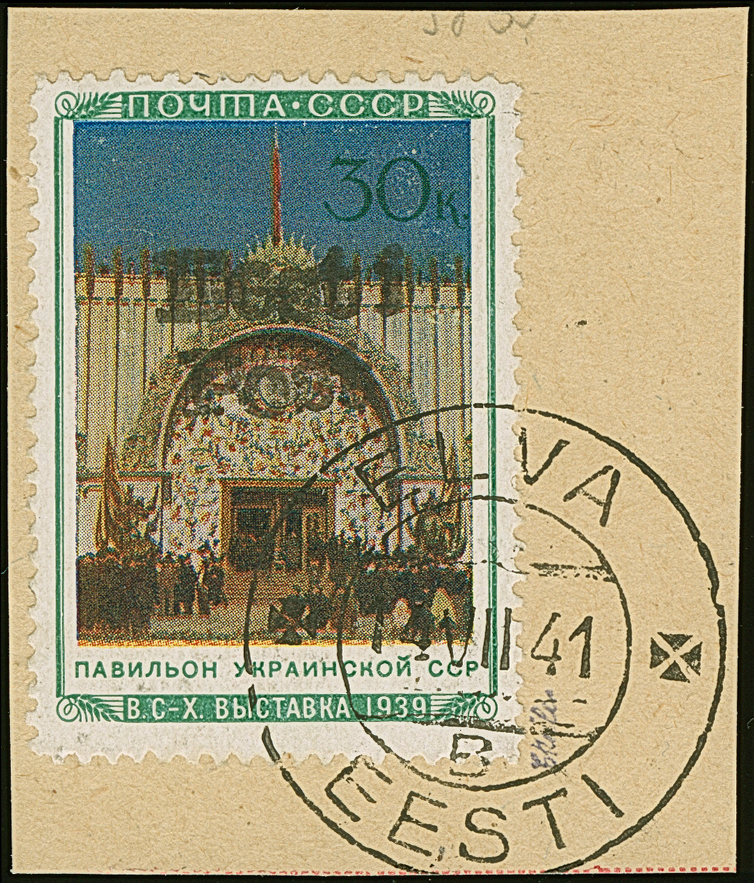 1941, Ukrainische SSR 30 Kopeken mehrfarbig, farbfrisch und gut gezähnt, sauber mit Stempel “ELVA 14.VII.41” auf Briefstück, tadellos, u.a. sign. EKeiler und Nemvalz