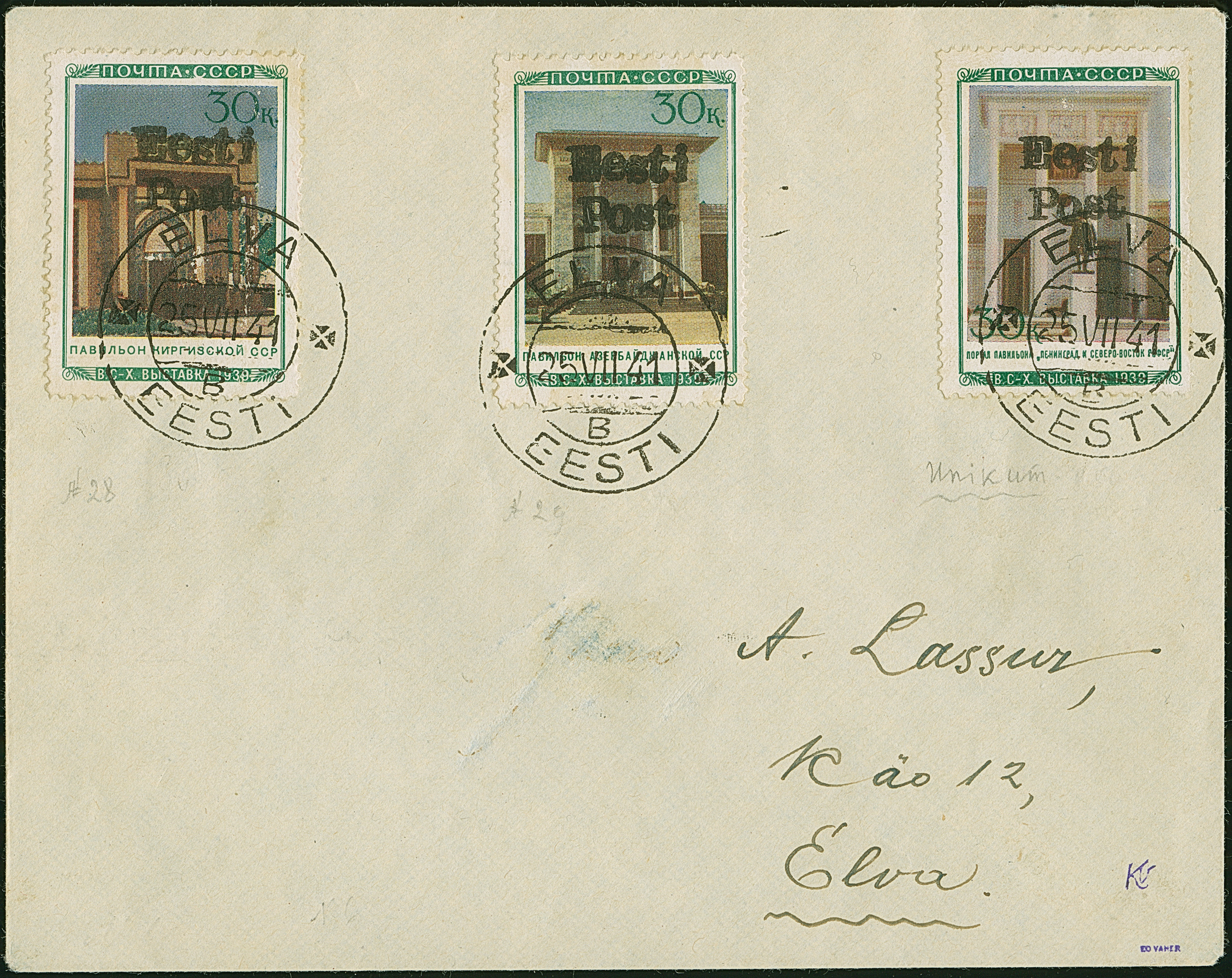 Leningrad 30 Kopeken, Kirgisische SSR 30 Kopeken und Aserbeidschanische SSR 30 Kopeken, sauber mit Stempel "ELVA B 25 VII 41" auf beschriftetem Umschlag an den ortsansässigen Philatelisten A. Lassur, der Umschlag mit einigen leichten dünnen Stellen die Marken in einwandfreier Erhaltung. Von Michel.-Nr. A25 sind bisher nur sehr wenige Exemplare registriert, von Michel.-Nr. 28 sind bis heute lediglich 15 Exemplaren bekannt, Michel.-Nr. 30 ist bisher lediglich in 9 Exemplaren bekannt, eine der großen Seltenheiten, u.a. sign. Vaher sowie Puloaas und Fotoattest Löbbering BPP (2010)