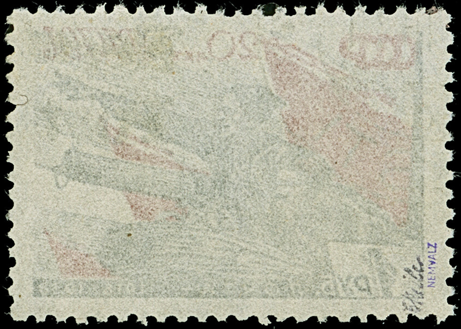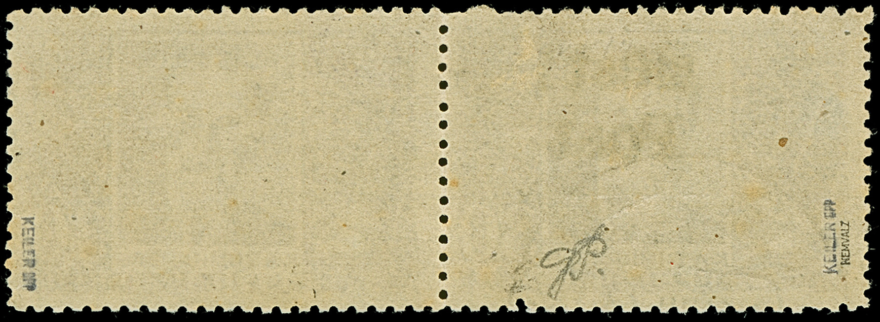 1941, 20 Kopeken schwarzgelbgrün, senkrechtes Kehrdruckpaar mit rechtem Seitenrand, die obere Marke mit schrägem, normalstehenden, die untere Marke mit schräg kopfstehendem Aufdruck, farbfrisch und gut gezähnt, sauber gestempelt, tadellos. Eine große Seltenheit, ProFi hat kein weiteres derartiges Paar registriert, sign. Keiler BPP sowie Fotoattest Krischke BPP (1986)