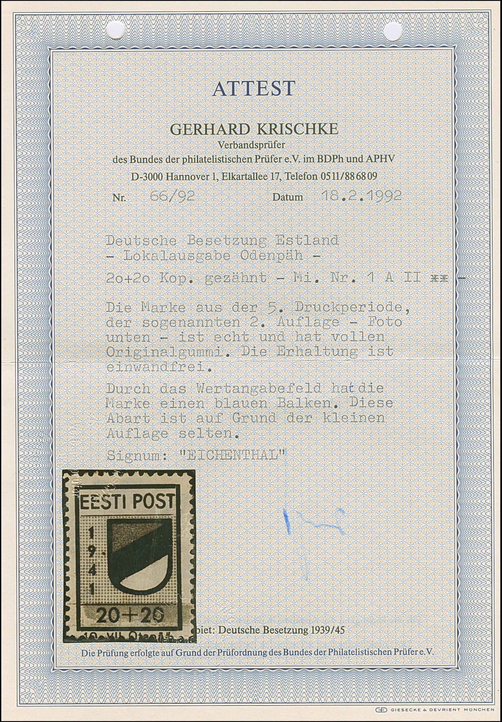 1941, Wappenschild 20 Kopeken, gezähnt, Type II, farbfrisch und gut gezähnt, mit Abart “blauer Balken durch Wertangabe”, postfrisch, tadellos, sign. Eichenthal sowie Fotoattest Krischke BPP (1992)