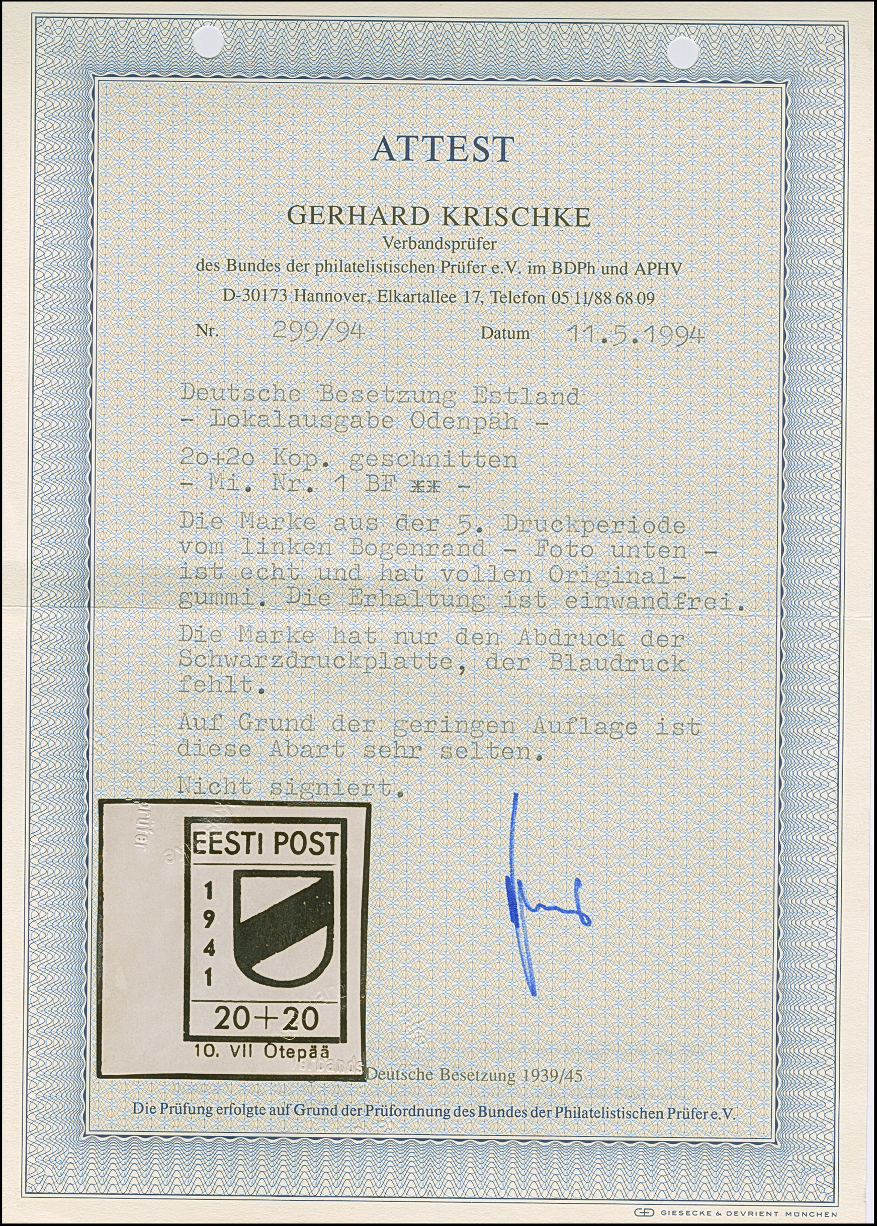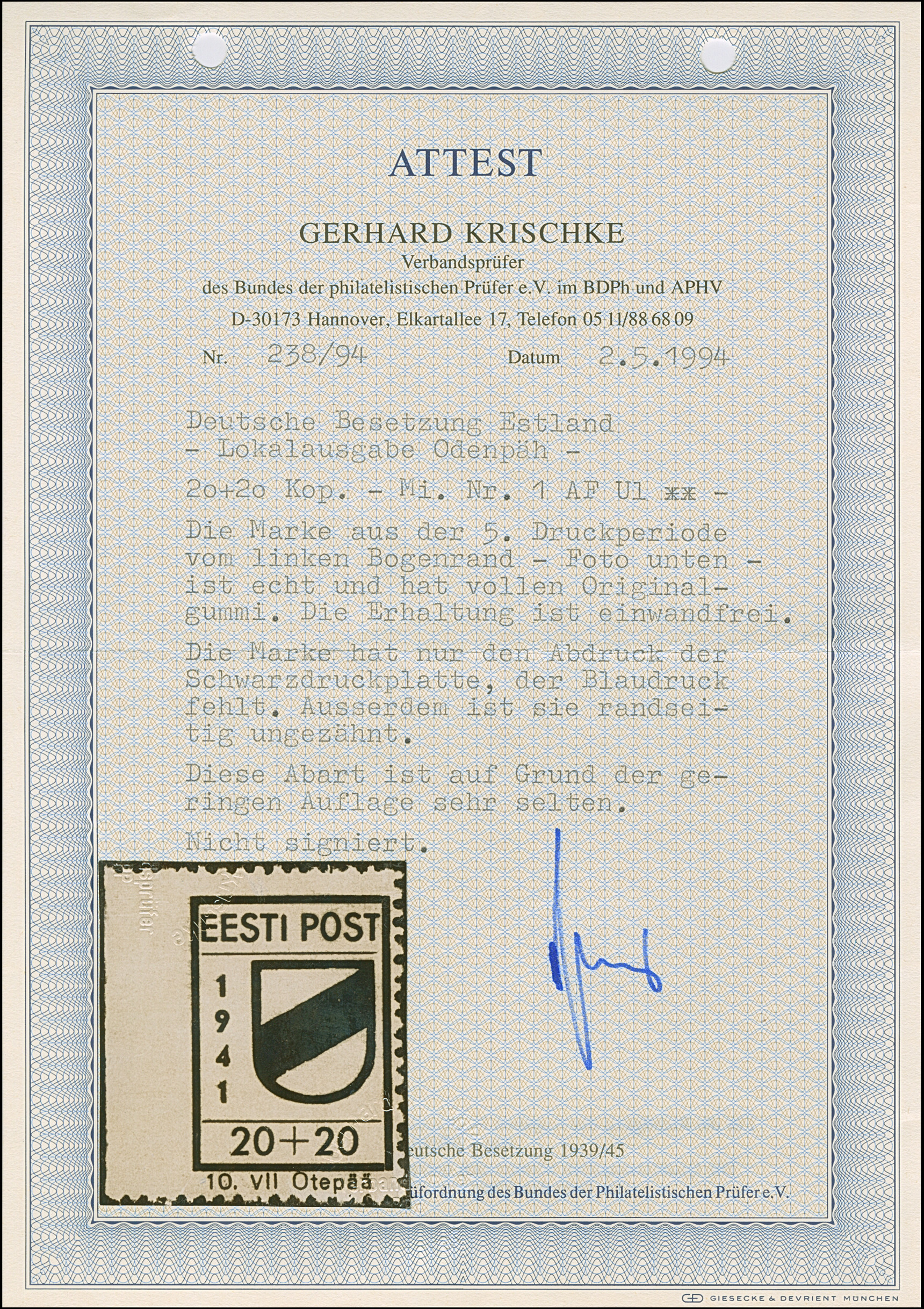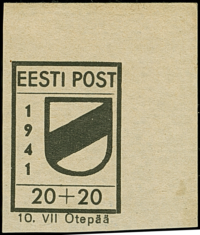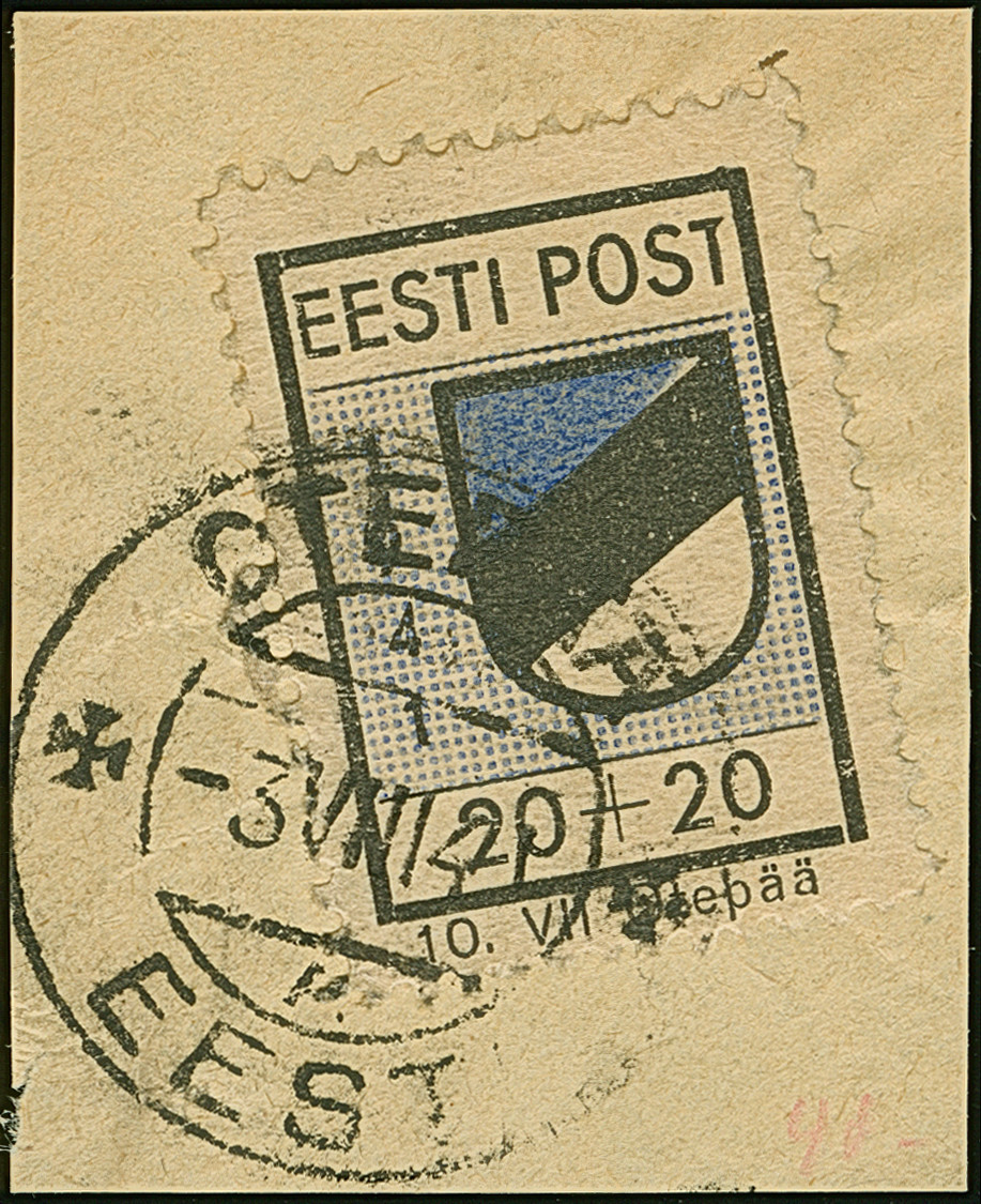 1941, Wappenschild 20 Kopeken, gezähnt, Type II, mit Plattenfehler “T von POST ohne Querbalken”, farbfrisch und gut gezähnt, sauber mit Stempel “OTEPÄÄ -3.VIII-41” auf Briefstück, tadellos, u.a. sign. Krischke
