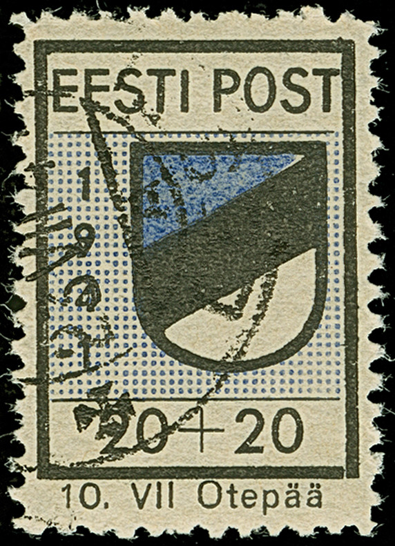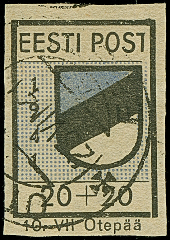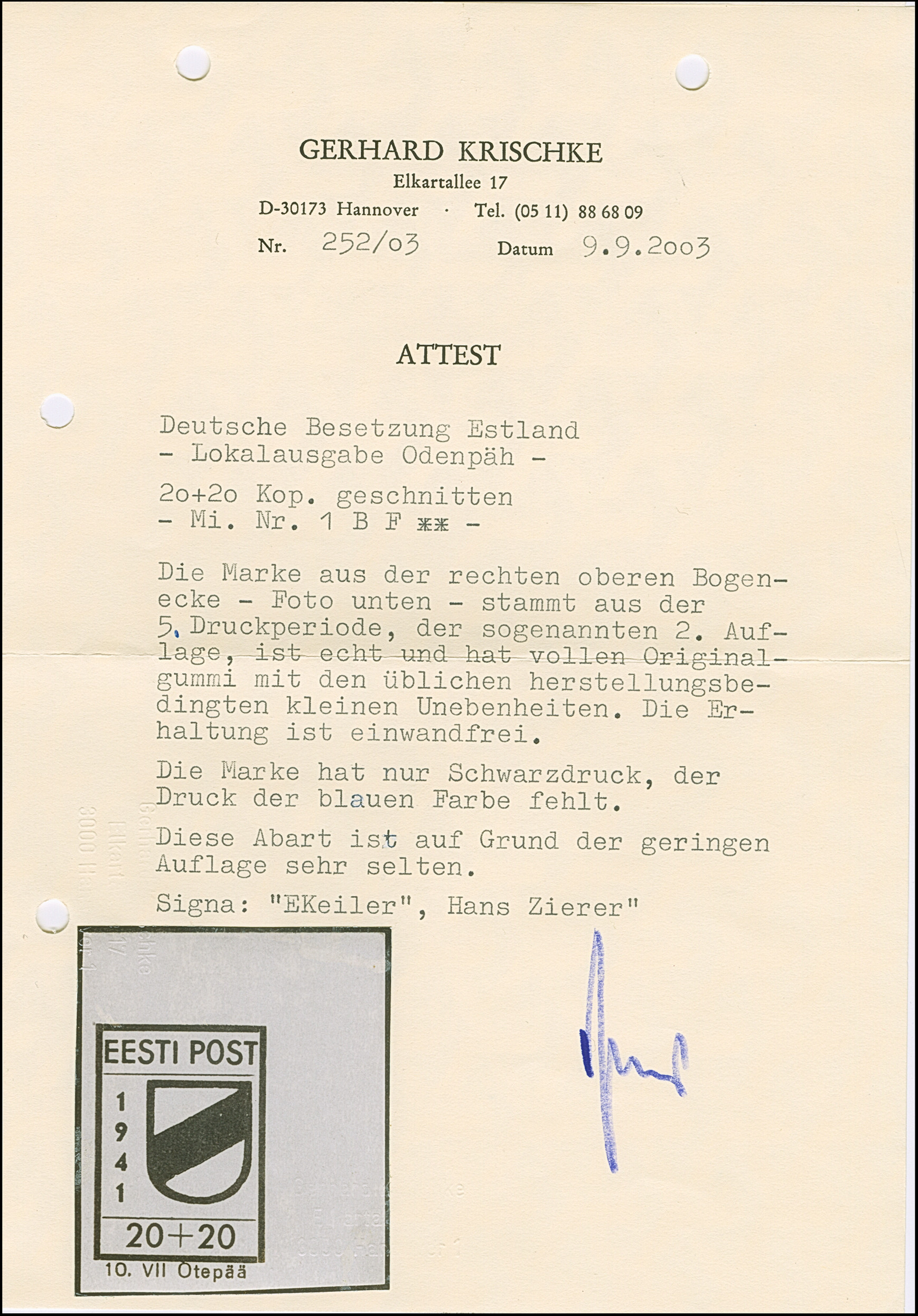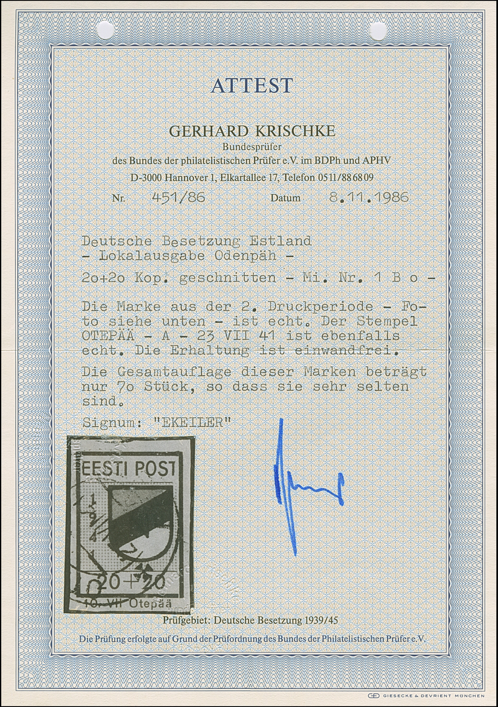 1941, Wappenschild 20 Kopeken, gezähnt, Type II, mit Plattenfehler “T von POST ohne Querbalken”, farbfrisch und gut gezähnt, sauber mit Stempel “OTEPÄÄ -3.VIII-41” auf Briefstück, tadellos, u.a. sign. Krischke