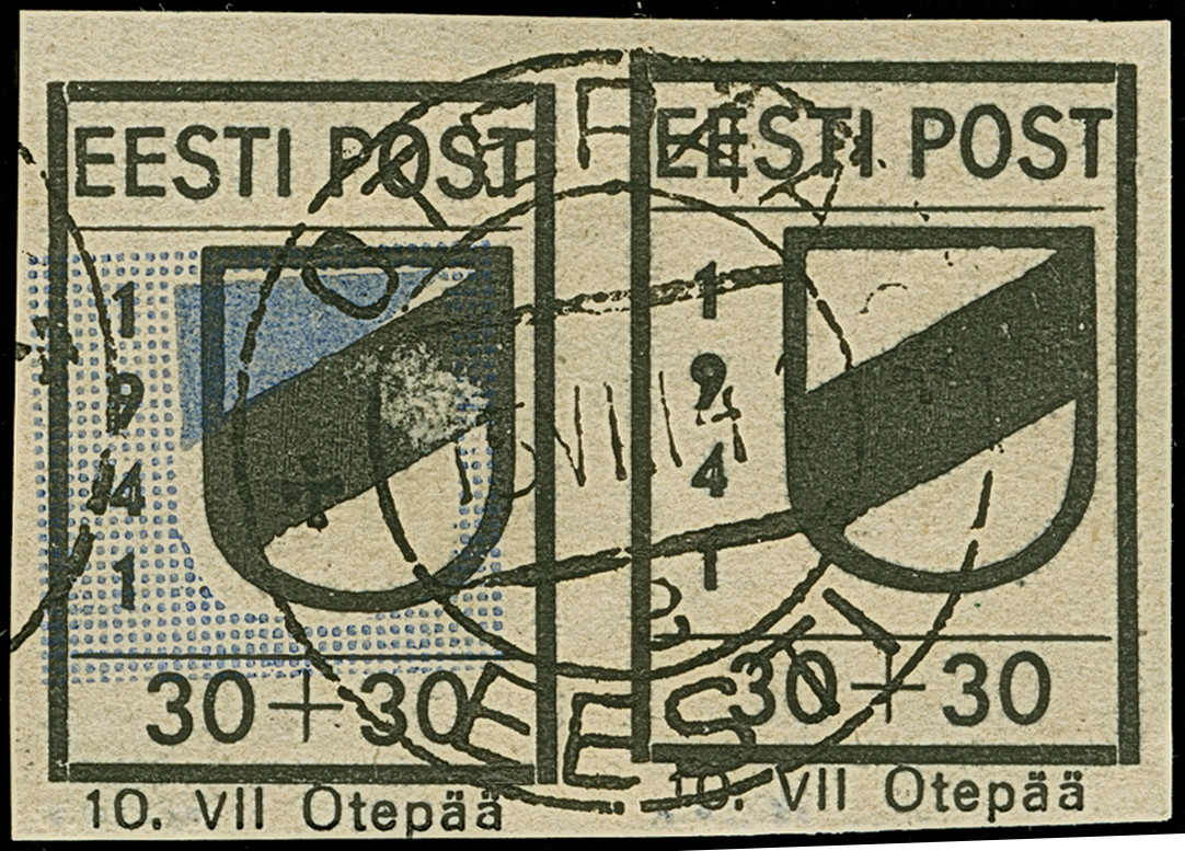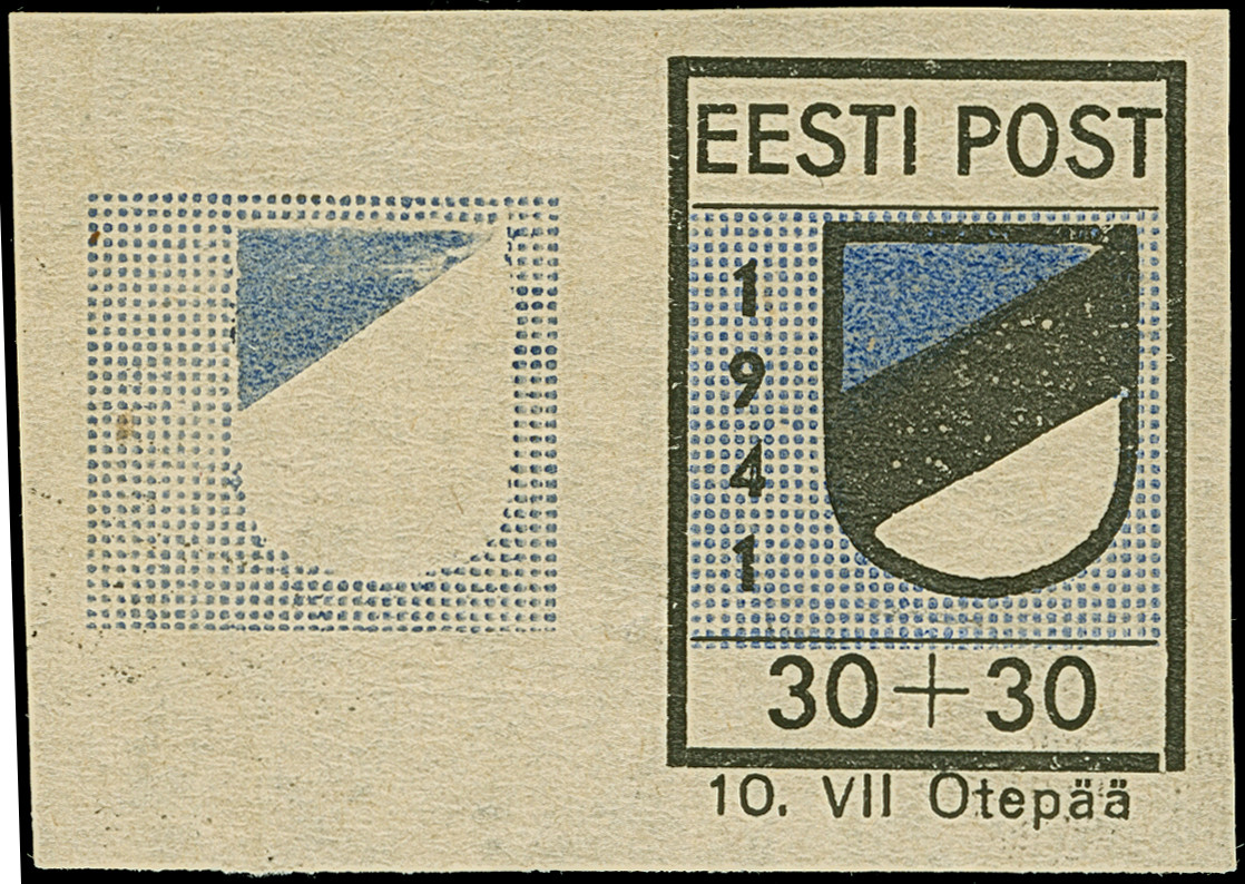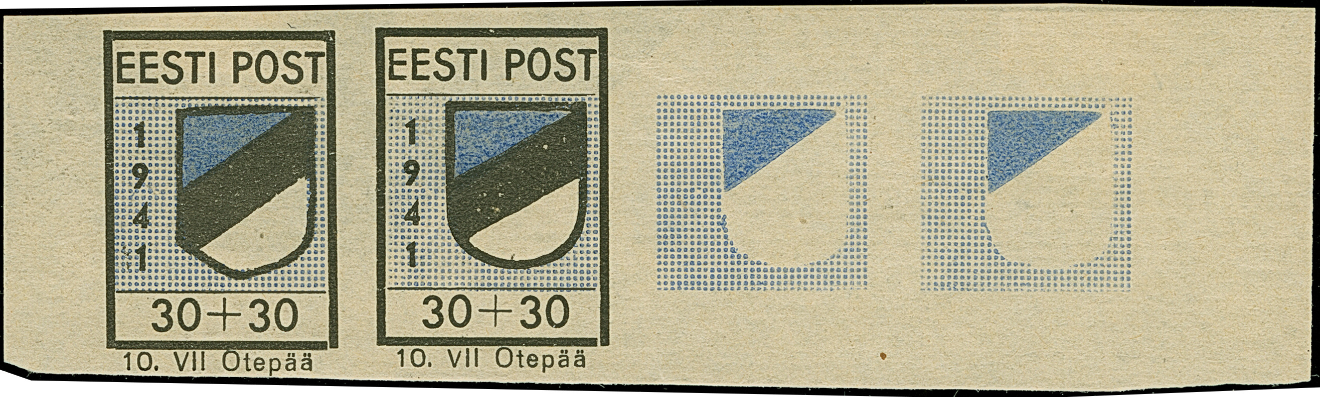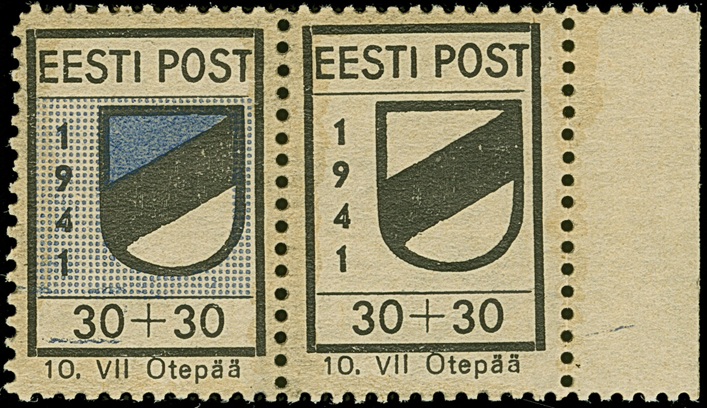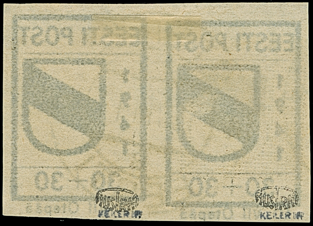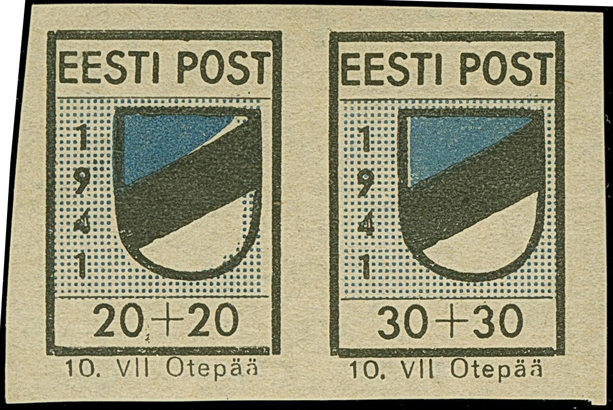 1941, Wappenschild 20 und 30 Kopeken im waagerechten Paar, ohne Gummi, die 20 Kopeken aus der 2. Druckperiode, Feld 1, die 30 Kopeken aus der 3. Druckperiode, Feld 2. Es gab insgesamt 7 Schalterbogen mit dieser Kombination, welche ungezähnt und ungummiert blieben. Die Mehrheit dieser Paare wurde später mit der nicht amtlichen Hinno-Zähnung L 11½ nachgezähnt, sodass das vorliegende Paar zu den größten Seltenheiten der Estlandphilatelie überhaupt gezählt werden darf; sign. Eichenthal und Fotoatteste Krischke BPP (1986) bzw. Löbbering BPP (2010)