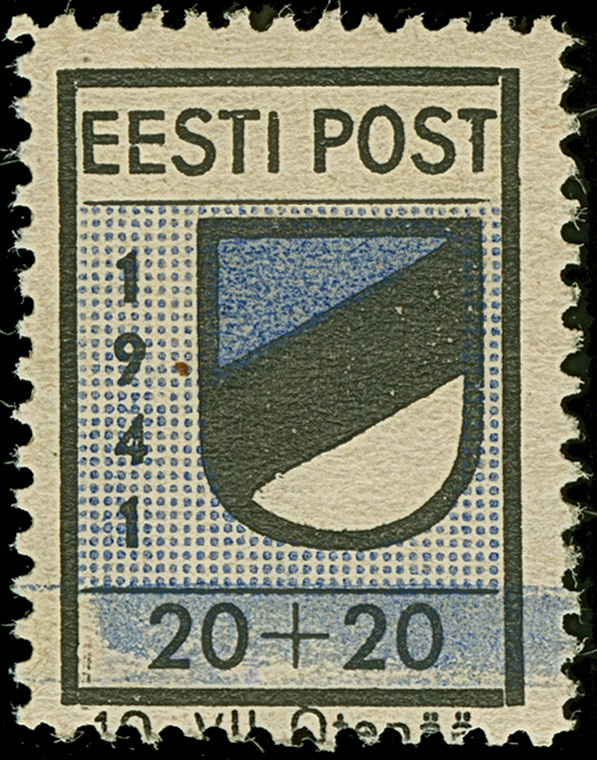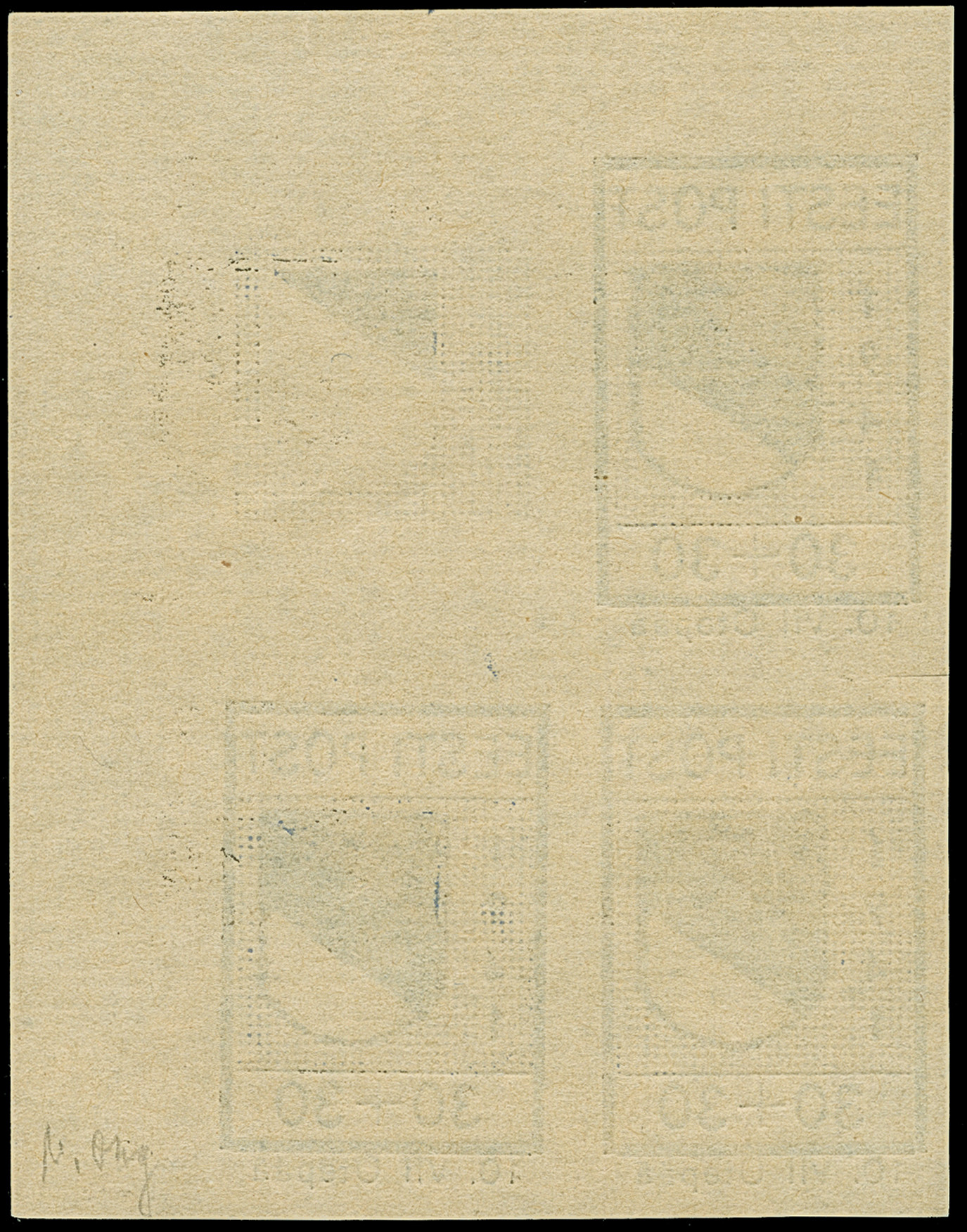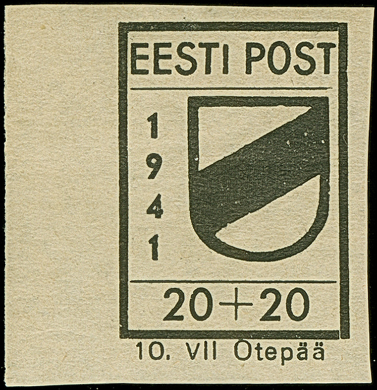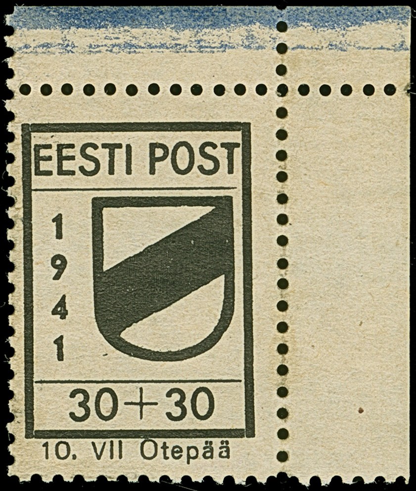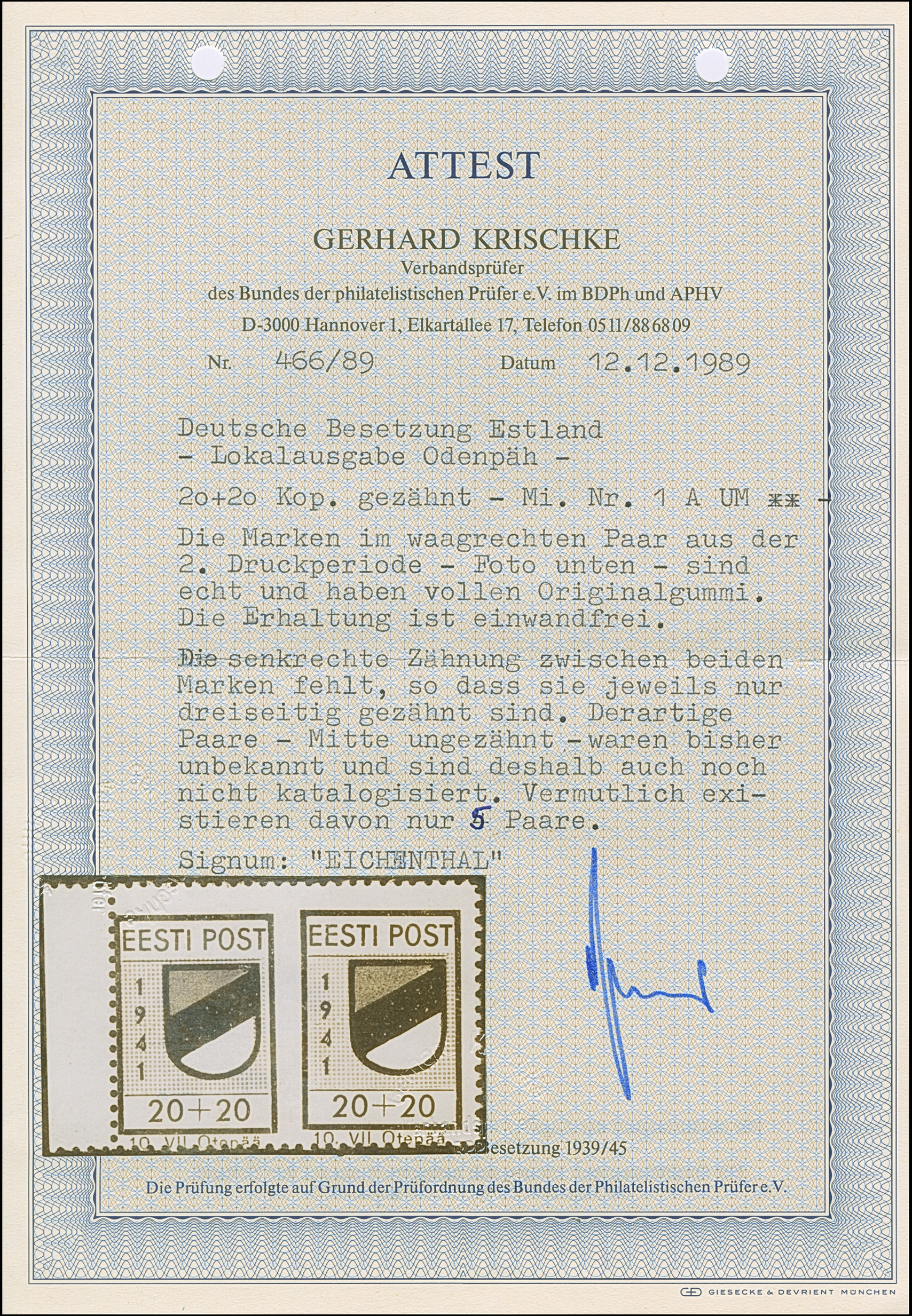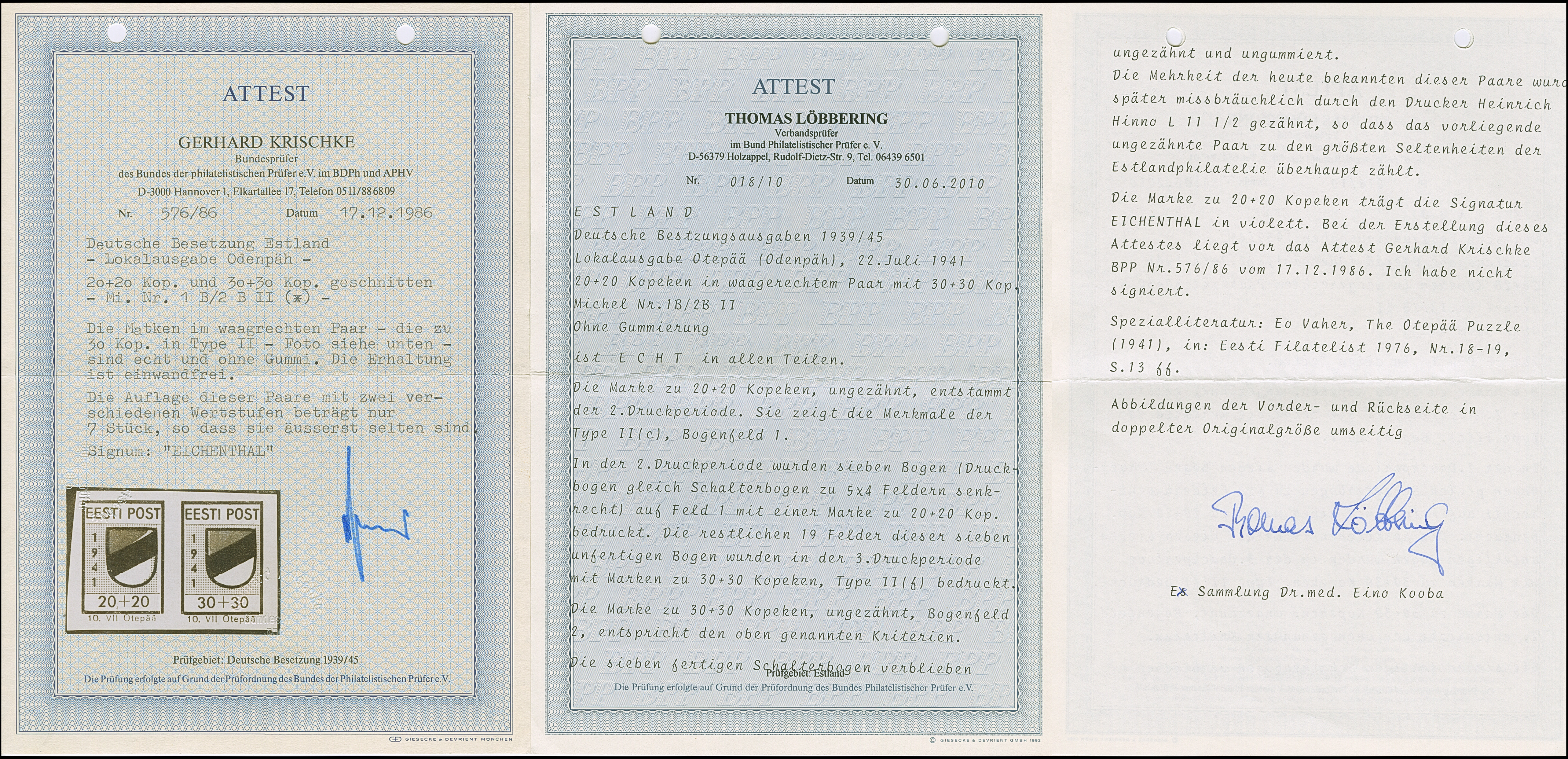 1941, Wappenschild 20 und 30 Kopeken im waagerechten Paar, ohne Gummi, die 20 Kopeken aus der 2. Druckperiode, Feld 1, die 30 Kopeken aus der 3. Druckperiode, Feld 2. Es gab insgesamt 7 Schalterbogen mit dieser Kombination, welche ungezähnt und ungummiert blieben. Die Mehrheit dieser Paare wurde später mit der nicht amtlichen Hinno-Zähnung L 11½ nachgezähnt, sodass das vorliegende Paar zu den größten Seltenheiten der Estlandphilatelie überhaupt gezählt werden darf; sign. Eichenthal und Fotoatteste Krischke BPP (1986) bzw. Löbbering BPP (2010)