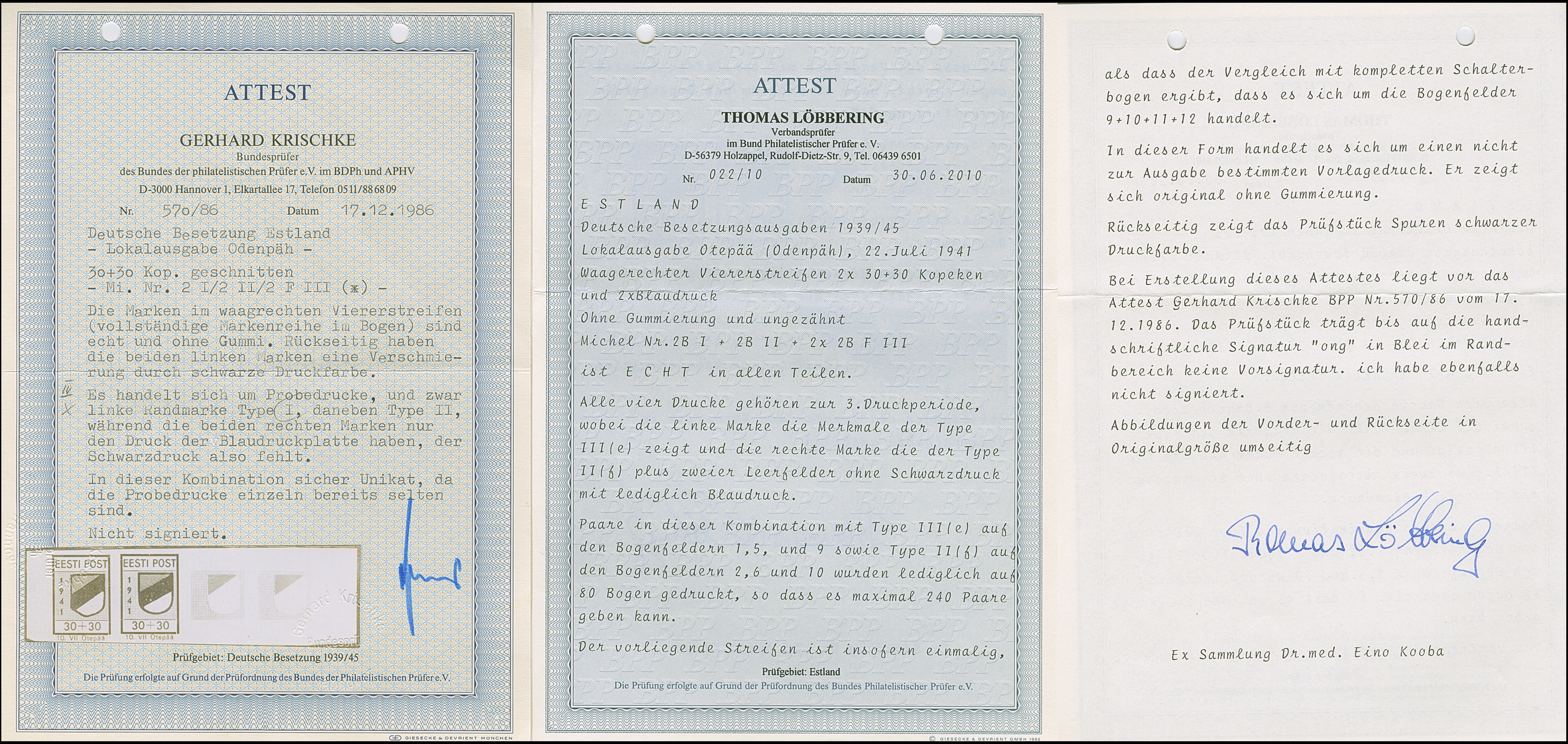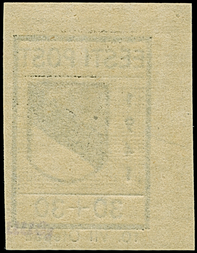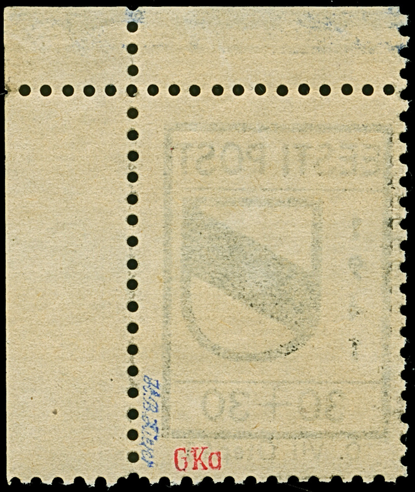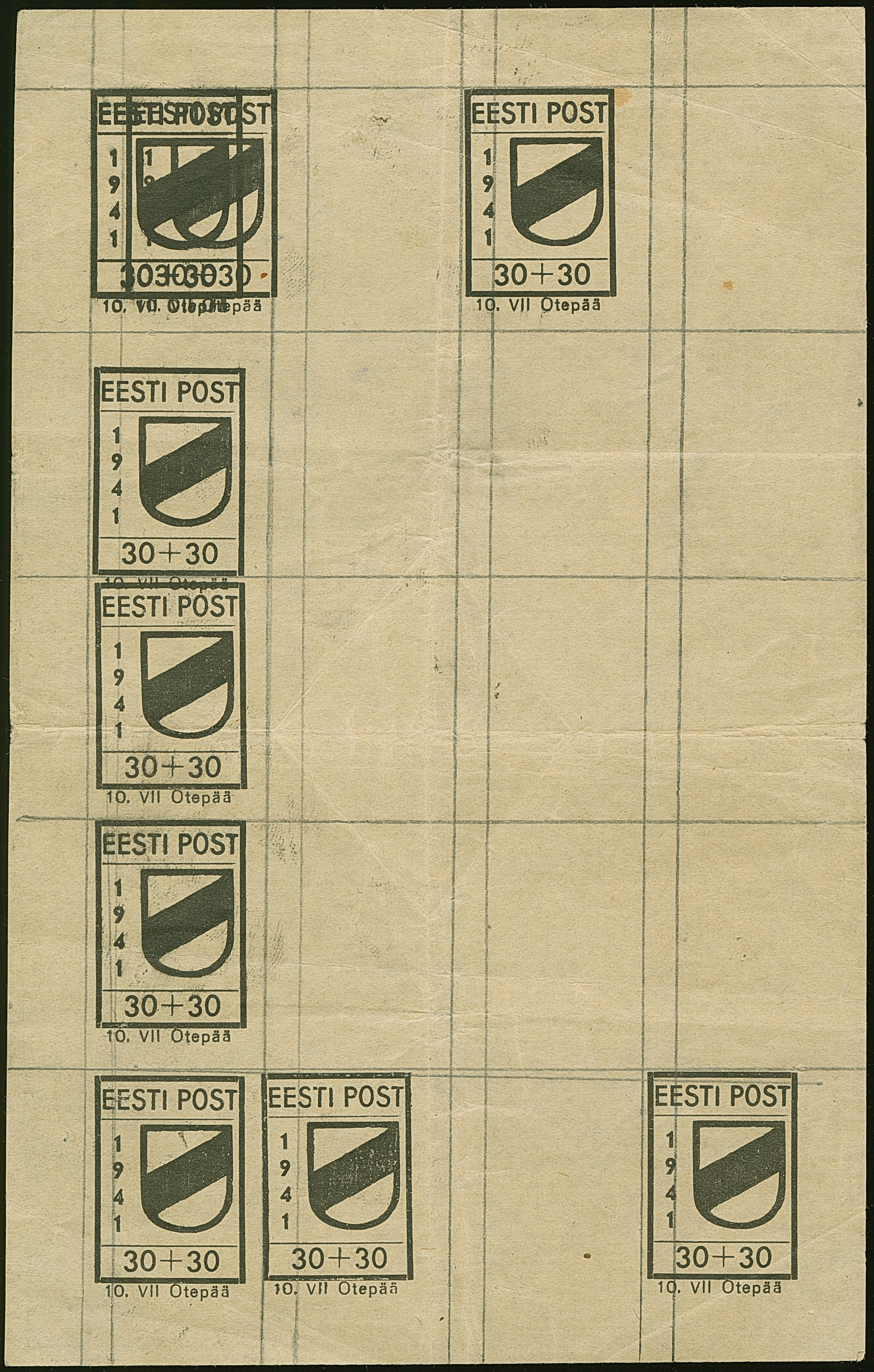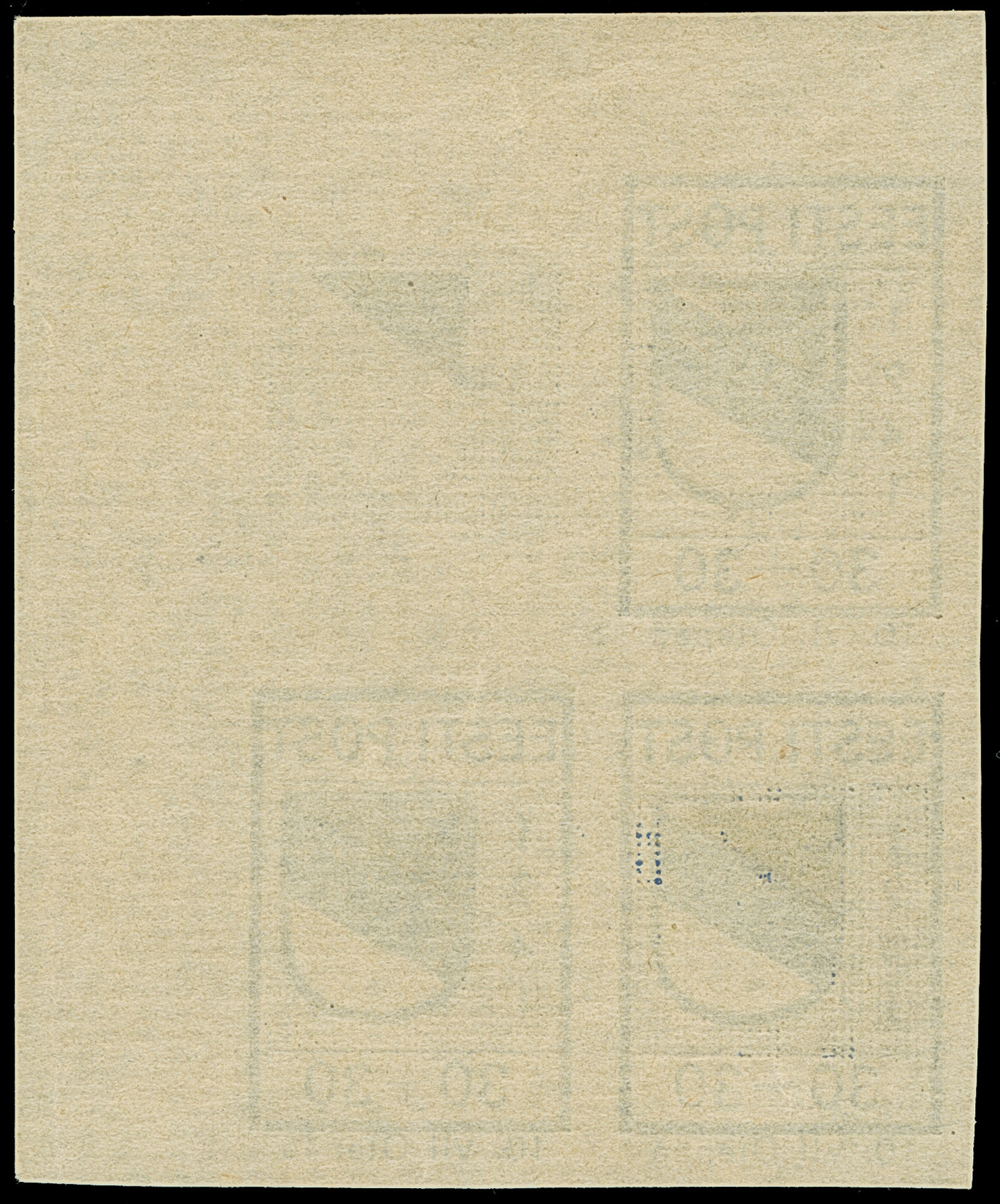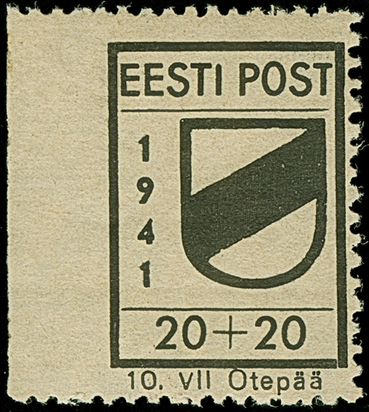1941, Wappenschild 20 und 30 Kopeken im waagerechten Paar, ohne Gummi, die 20 Kopeken aus der 2. Druckperiode, Feld 1, die 30 Kopeken aus der 3. Druckperiode, Feld 2. Es gab insgesamt 7 Schalterbogen mit dieser Kombination, welche ungezähnt und ungummiert blieben. Die Mehrheit dieser Paare wurde später mit der nicht amtlichen Hinno-Zähnung L 11½ nachgezähnt, sodass das vorliegende Paar zu den größten Seltenheiten der Estlandphilatelie überhaupt gezählt werden darf; sign. Eichenthal und Fotoatteste Krischke BPP (1986) bzw. Löbbering BPP (2010)