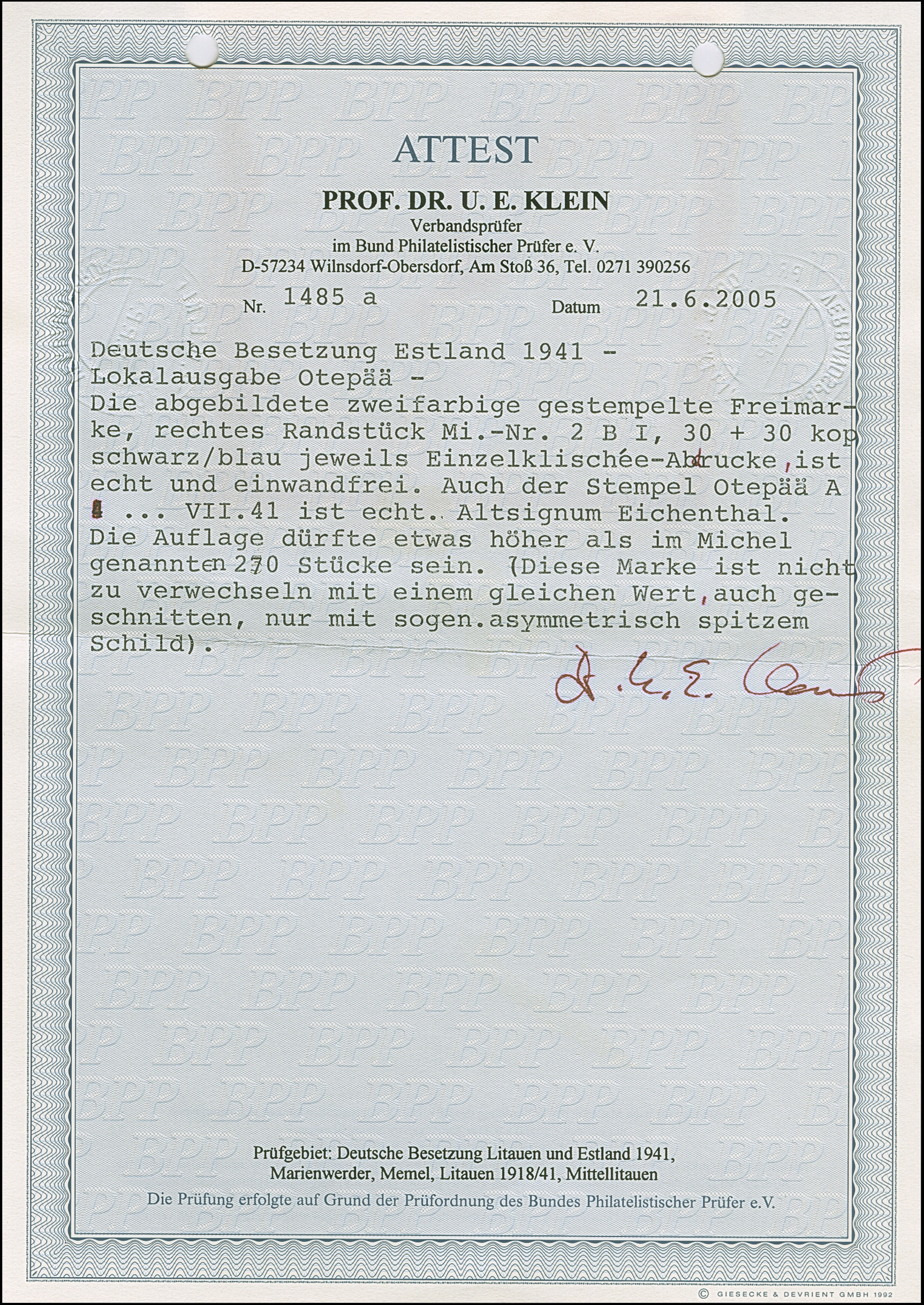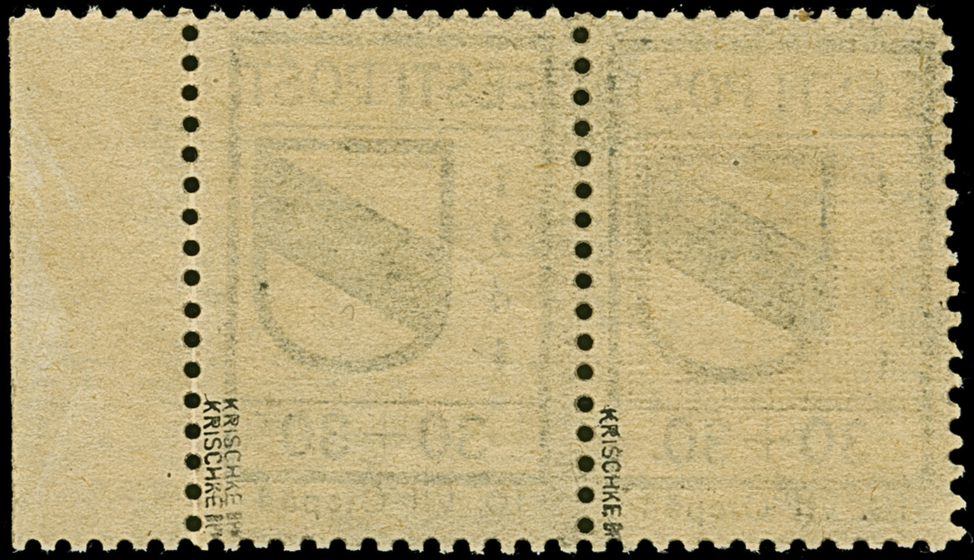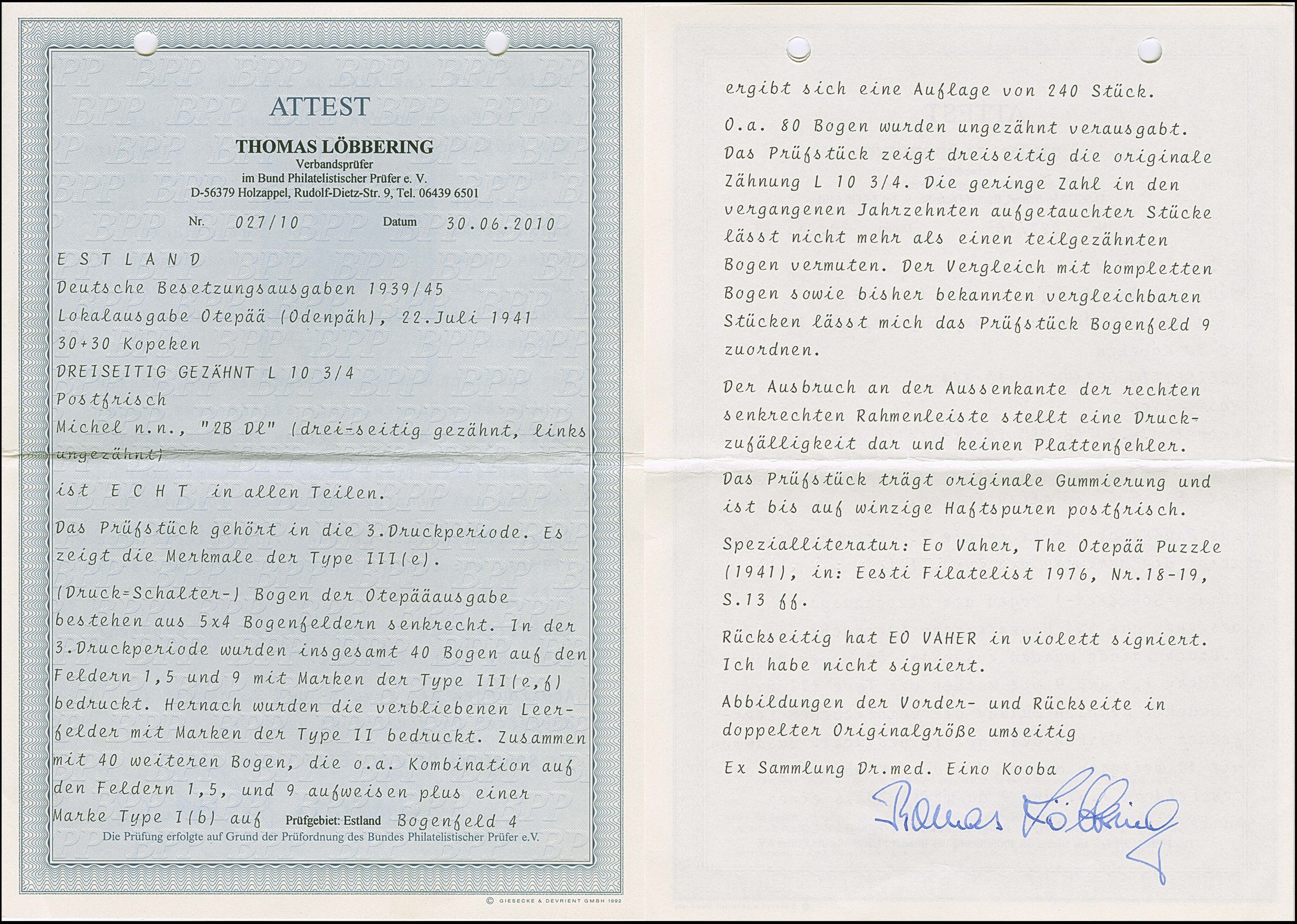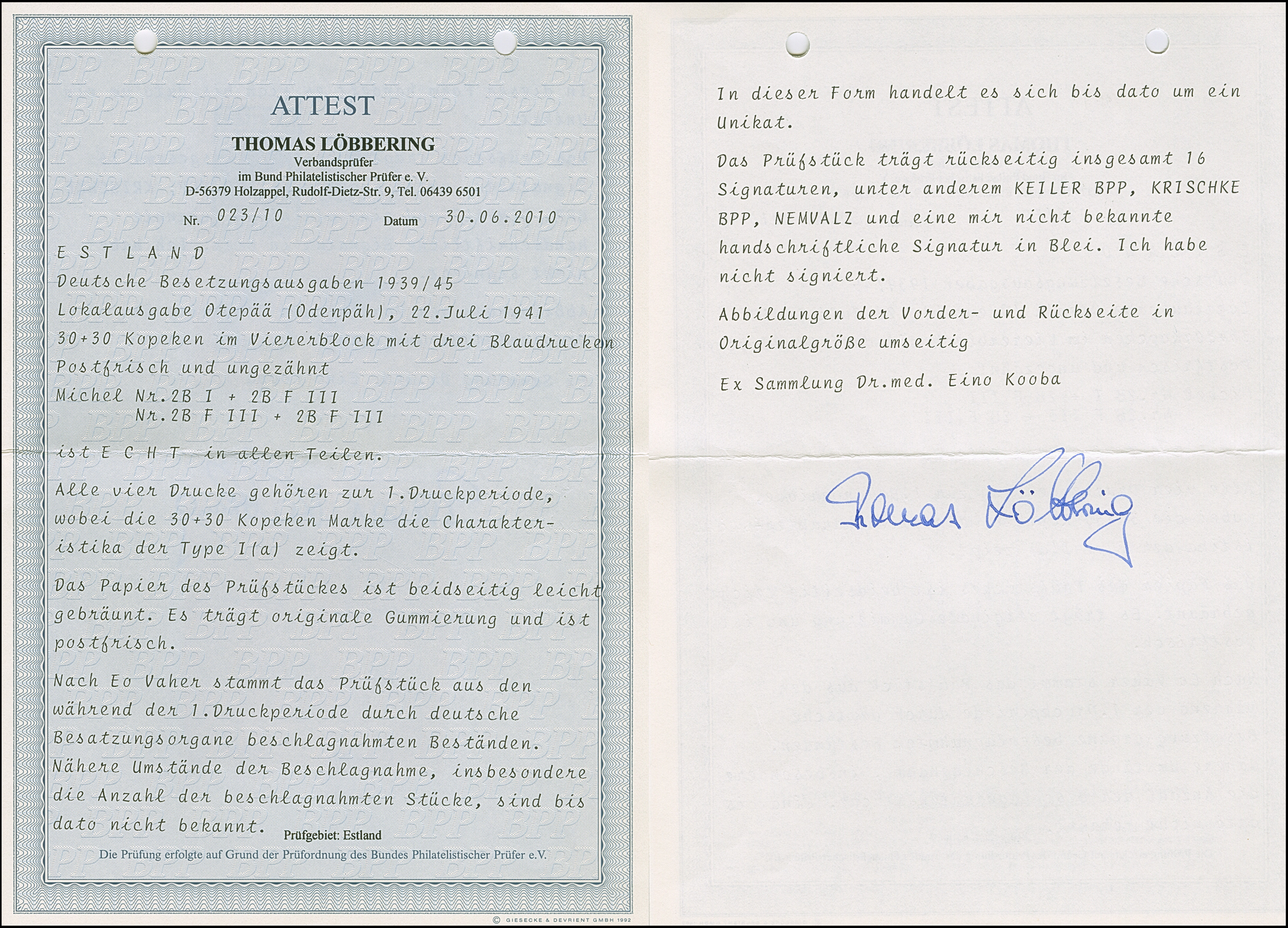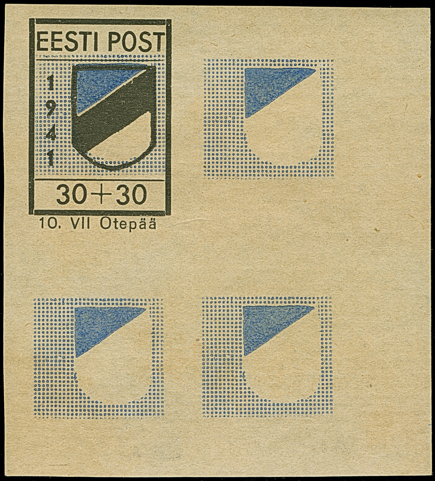 1941, Wappenschild 20 und 30 Kopeken im waagerechten Paar, ohne Gummi, die 20 Kopeken aus der 2. Druckperiode, Feld 1, die 30 Kopeken aus der 3. Druckperiode, Feld 2. Es gab insgesamt 7 Schalterbogen mit dieser Kombination, welche ungezähnt und ungummiert blieben. Die Mehrheit dieser Paare wurde später mit der nicht amtlichen Hinno-Zähnung L 11½ nachgezähnt, sodass das vorliegende Paar zu den größten Seltenheiten der Estlandphilatelie überhaupt gezählt werden darf; sign. Eichenthal und Fotoatteste Krischke BPP (1986) bzw. Löbbering BPP (2010)