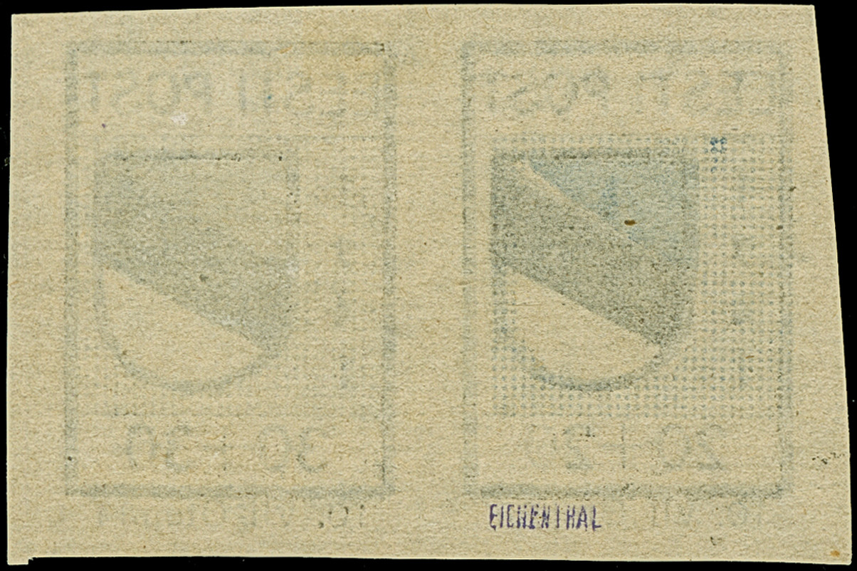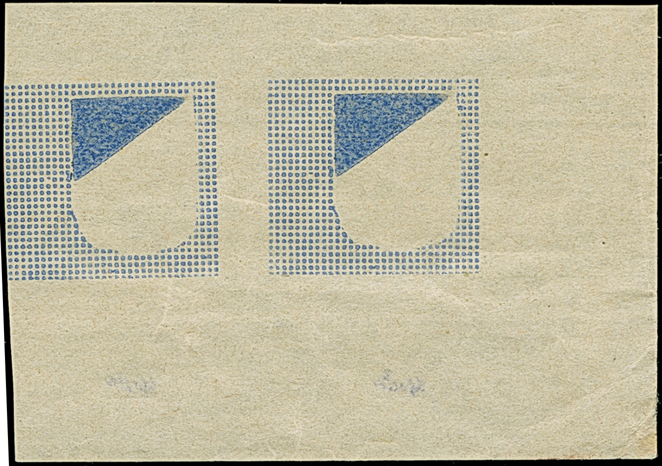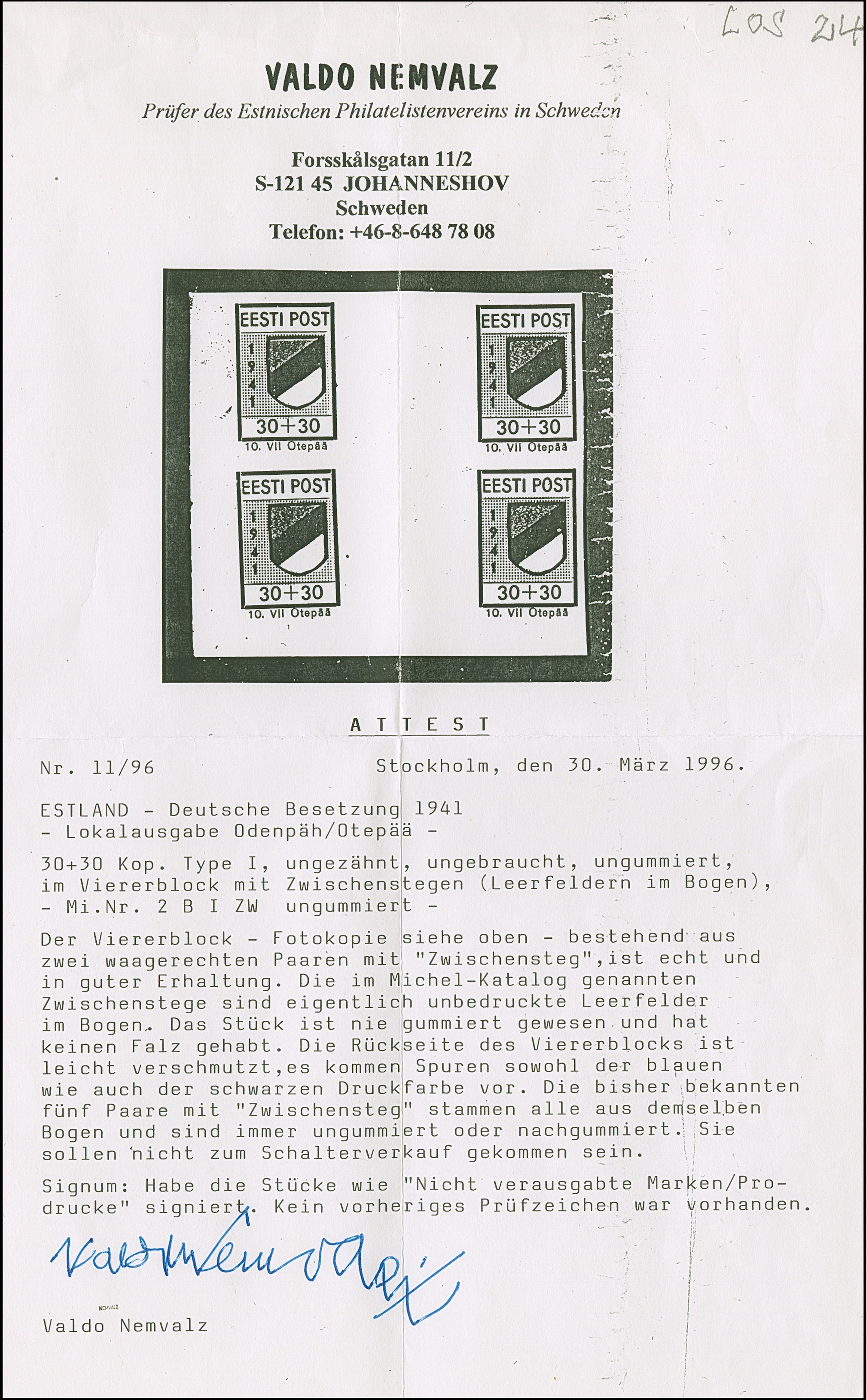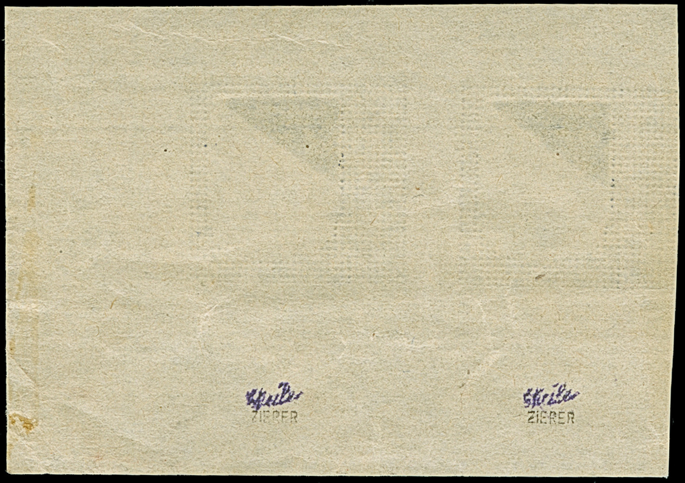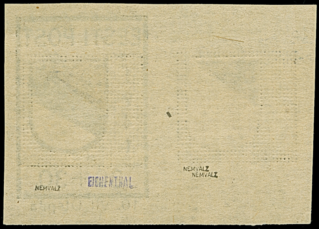 1941, Wappenschild 20 und 30 Kopeken im waagerechten Paar, ohne Gummi, die 20 Kopeken aus der 2. Druckperiode, Feld 1, die 30 Kopeken aus der 3. Druckperiode, Feld 2. Es gab insgesamt 7 Schalterbogen mit dieser Kombination, welche ungezähnt und ungummiert blieben. Die Mehrheit dieser Paare wurde später mit der nicht amtlichen Hinno-Zähnung L 11½ nachgezähnt, sodass das vorliegende Paar zu den größten Seltenheiten der Estlandphilatelie überhaupt gezählt werden darf; sign. Eichenthal und Fotoatteste Krischke BPP (1986) bzw. Löbbering BPP (2010)
