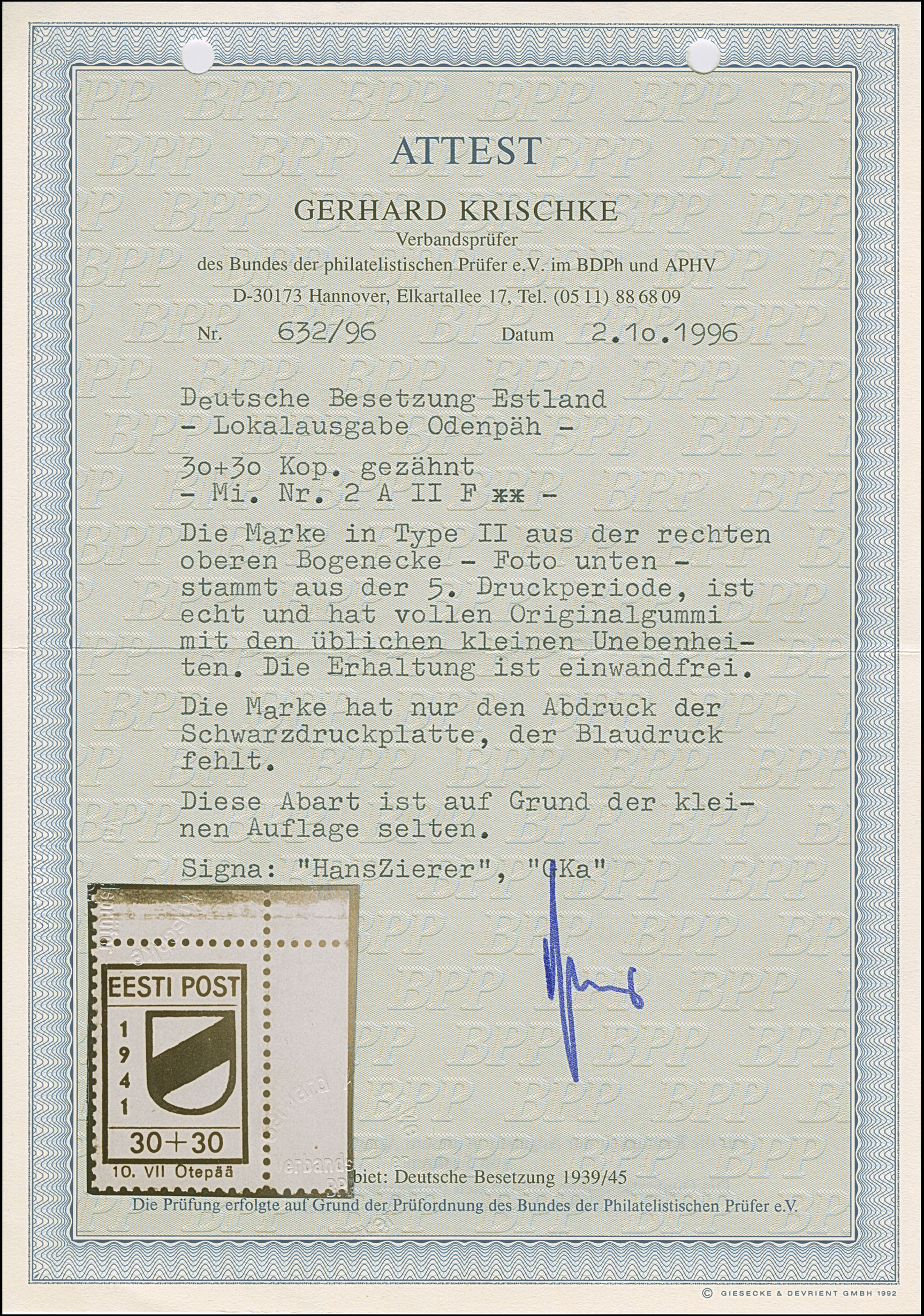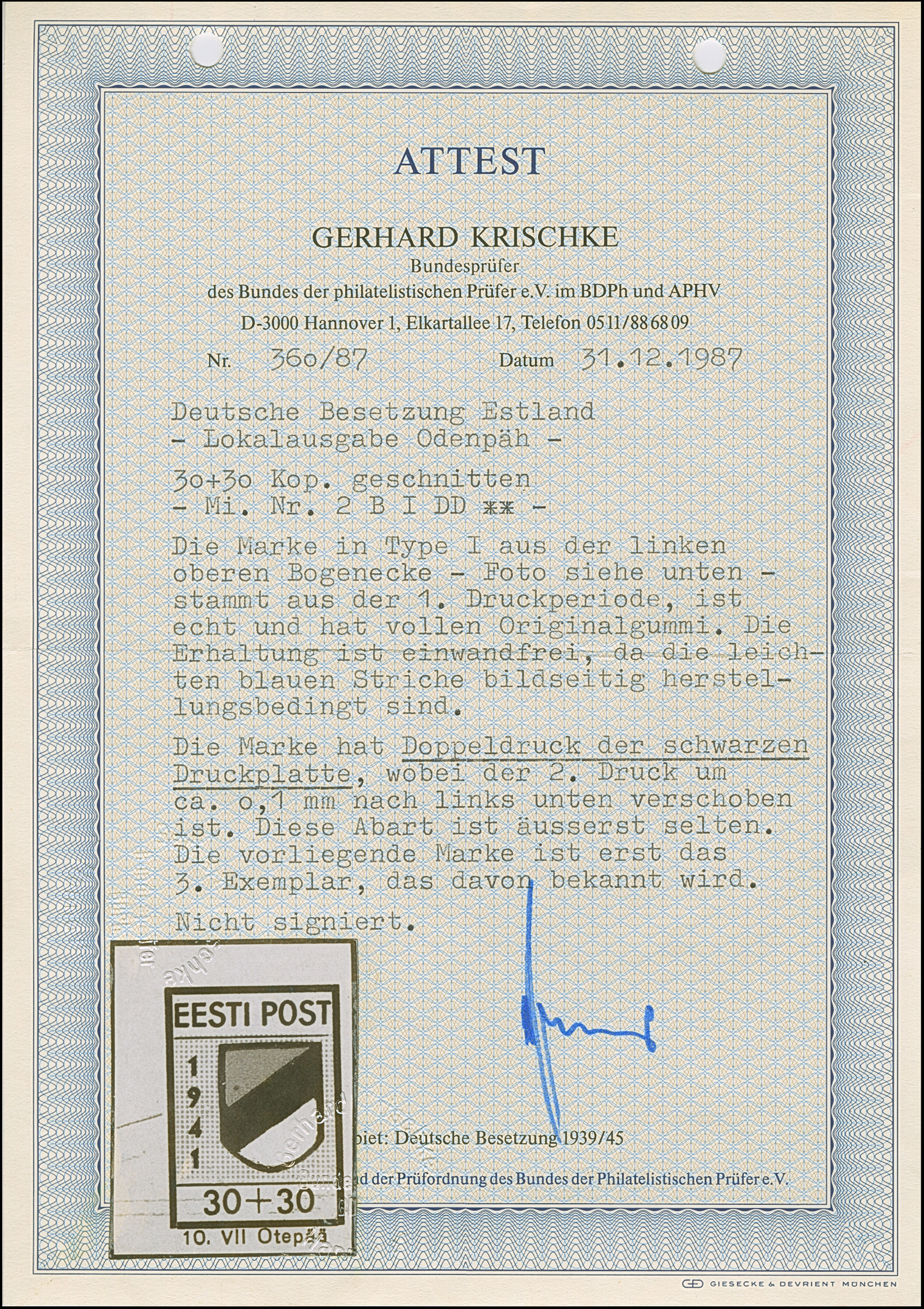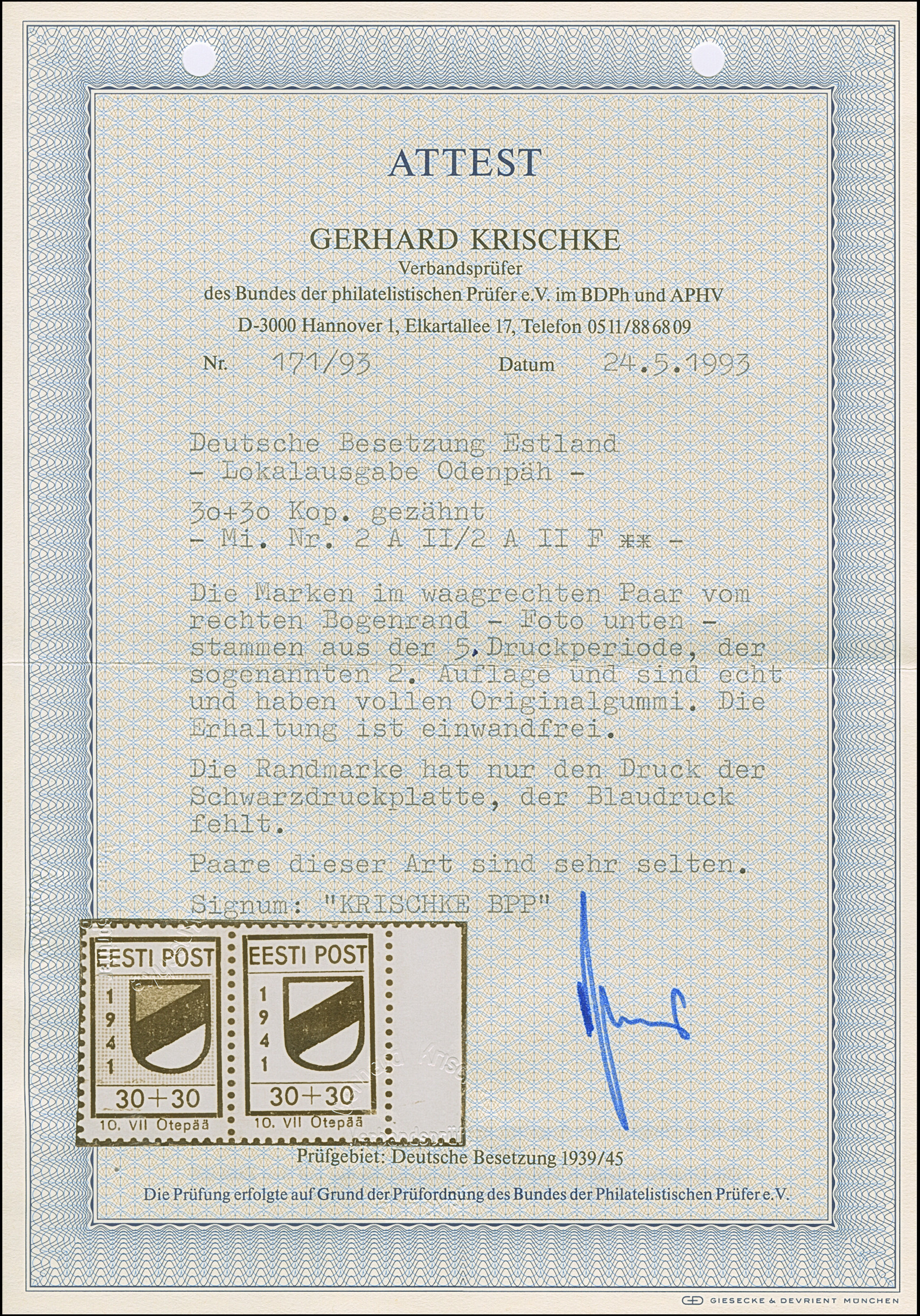 1941, Wappenschild 30 Kopeken, geschnitten, Type II, waagerechtes Paar aus der 5. Druckperiode, dabei die rechte Marke mit fehlendem Blaudruck, sauber gestempelt "OTEPÄÄ 15 VIII 41", die linke Marke mit kleinem Druckausfall, tadellos. Eine der großen Seltenheiten, ProFi hat kein weiteres gestempeltes Paar registriert, u.a. sign. Keiler BPP sowie Fotoattest Krischke BPP (2010)