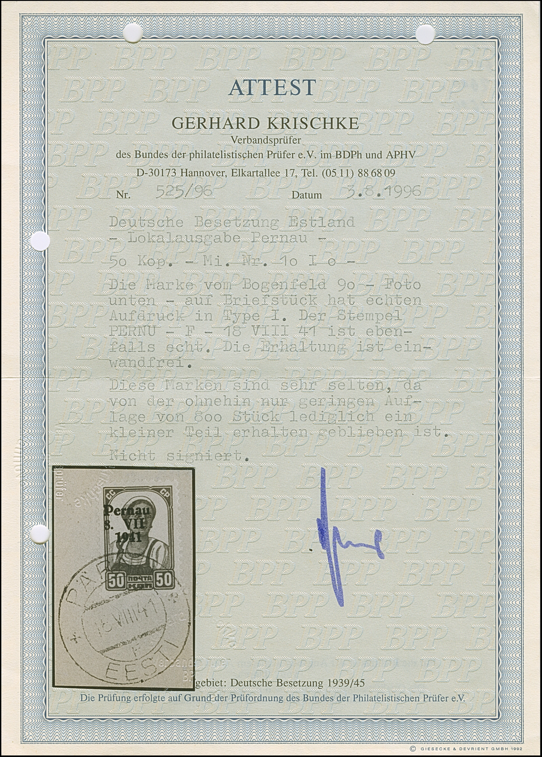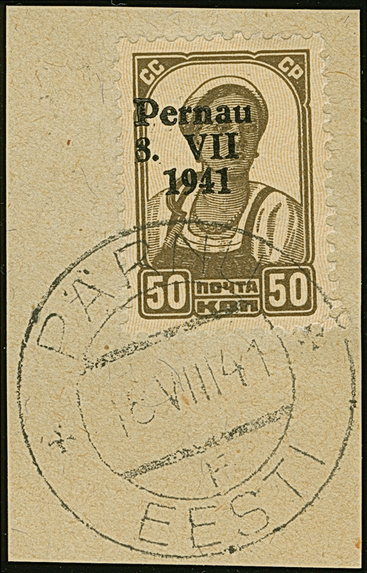 1941, 50 Kopeken braun, farbfrisch und gut gezähnt, sauber mit Stempel “PÄRNAU 18 VIII 41” auf Briefstück, tadellos, eine, besonders in gestempelter Erhaltung, sehr seltene Marke, Fotoattest Krischke BPP (1996)