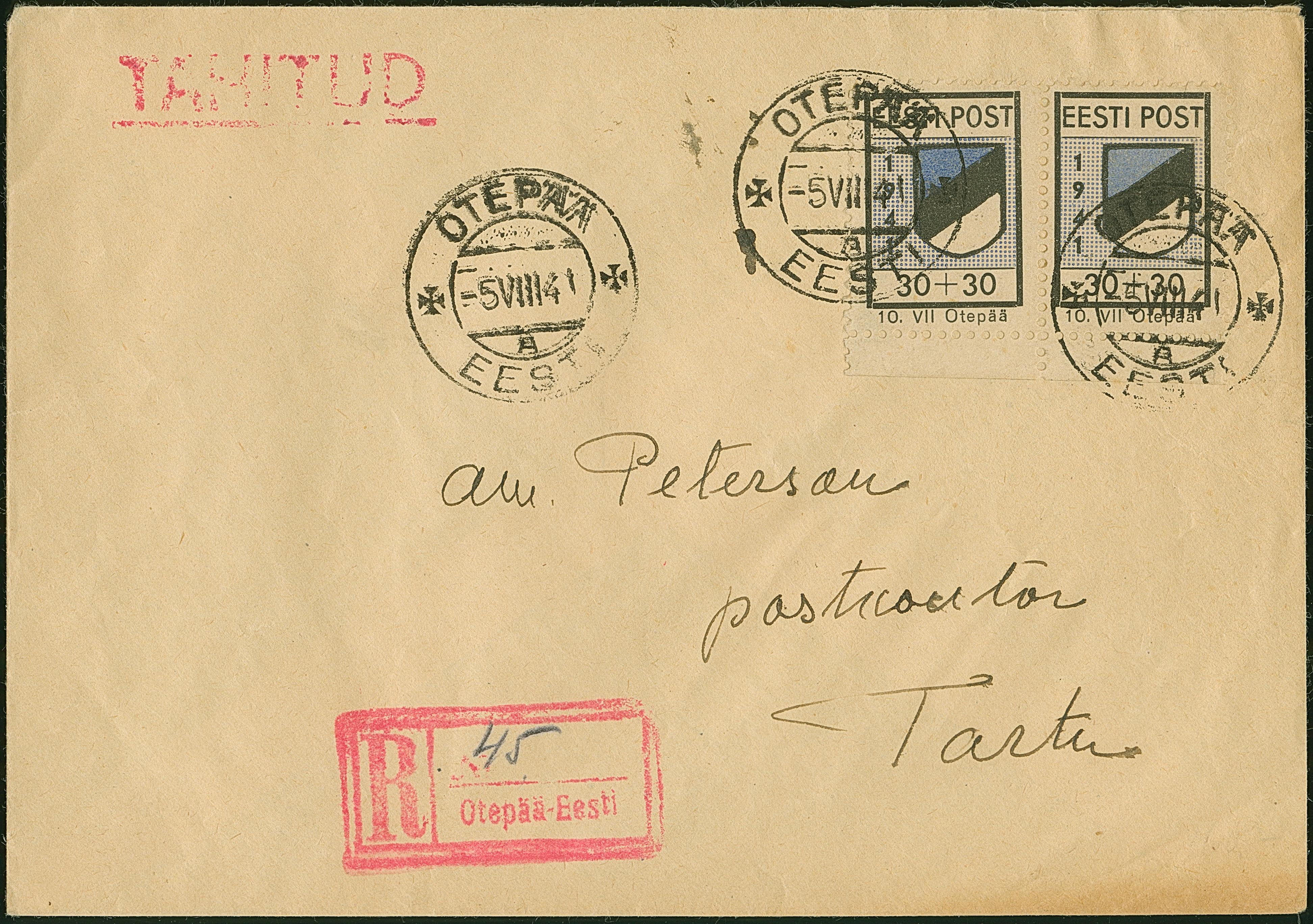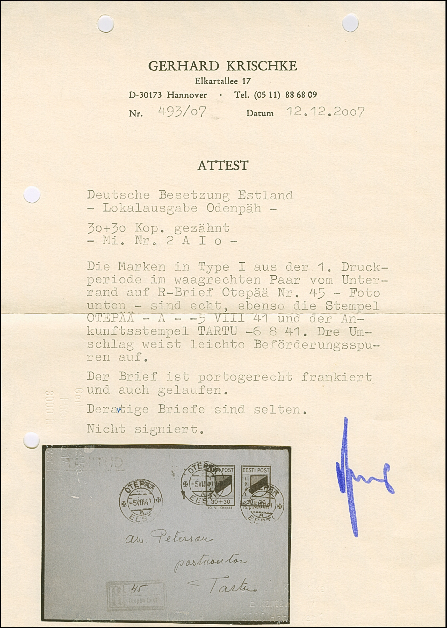 1941, Wappenschild 30 Kopeken, gezähnt, Type I, waagerechtes Unterrandpaar, sauber mit auf- und nebengesetztem Stempel “OTEPÄÄ -5 VIII 41” auf portogerechtem R-Brief nach Tartu mit Ankunftsstempel, tadellos, ein sehr seltener und attraktiver Brief, Fotoattest Krischke (2007)
