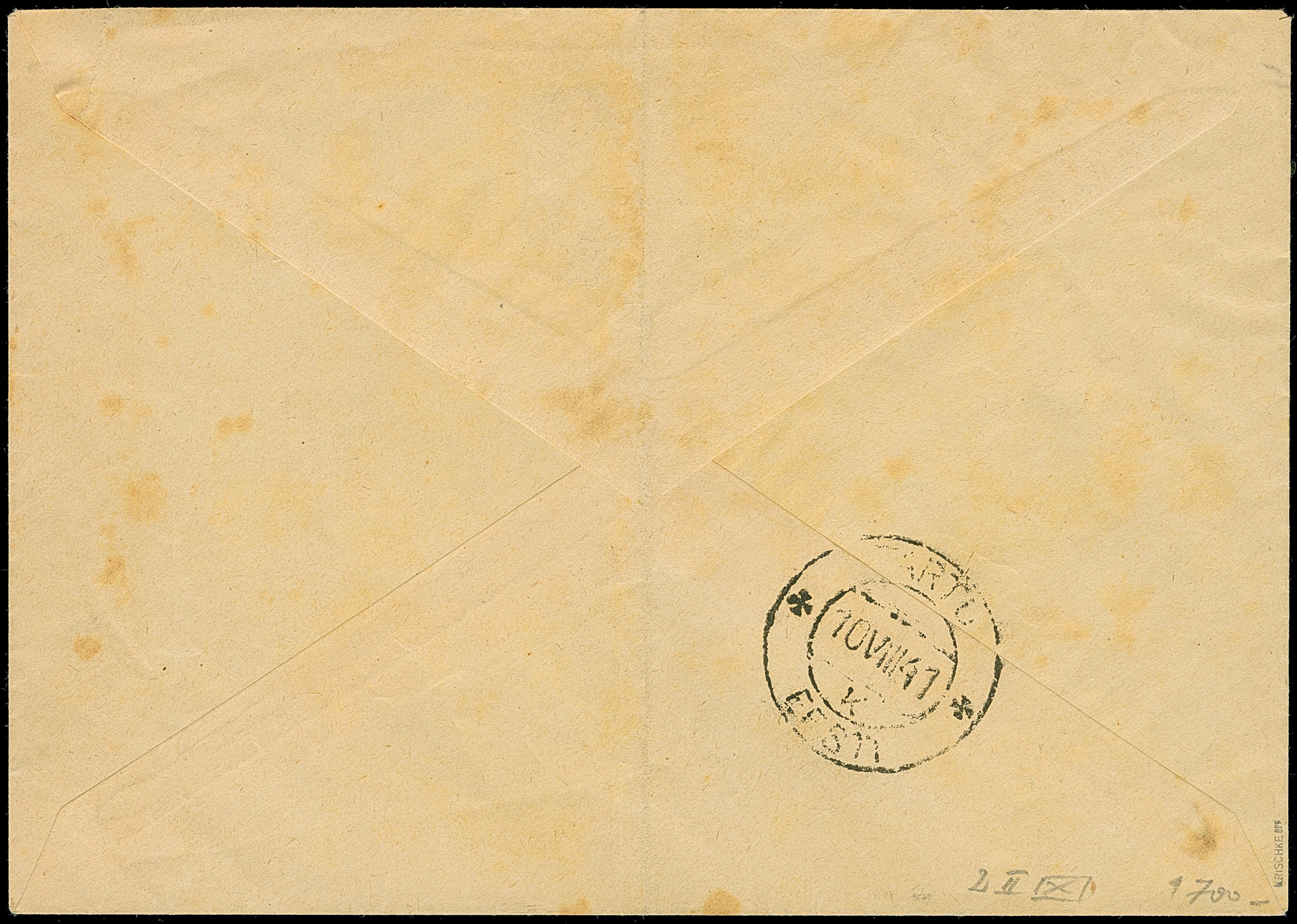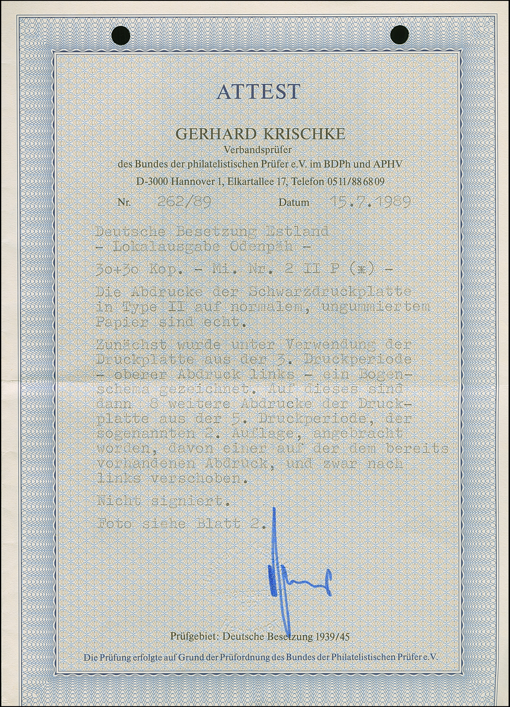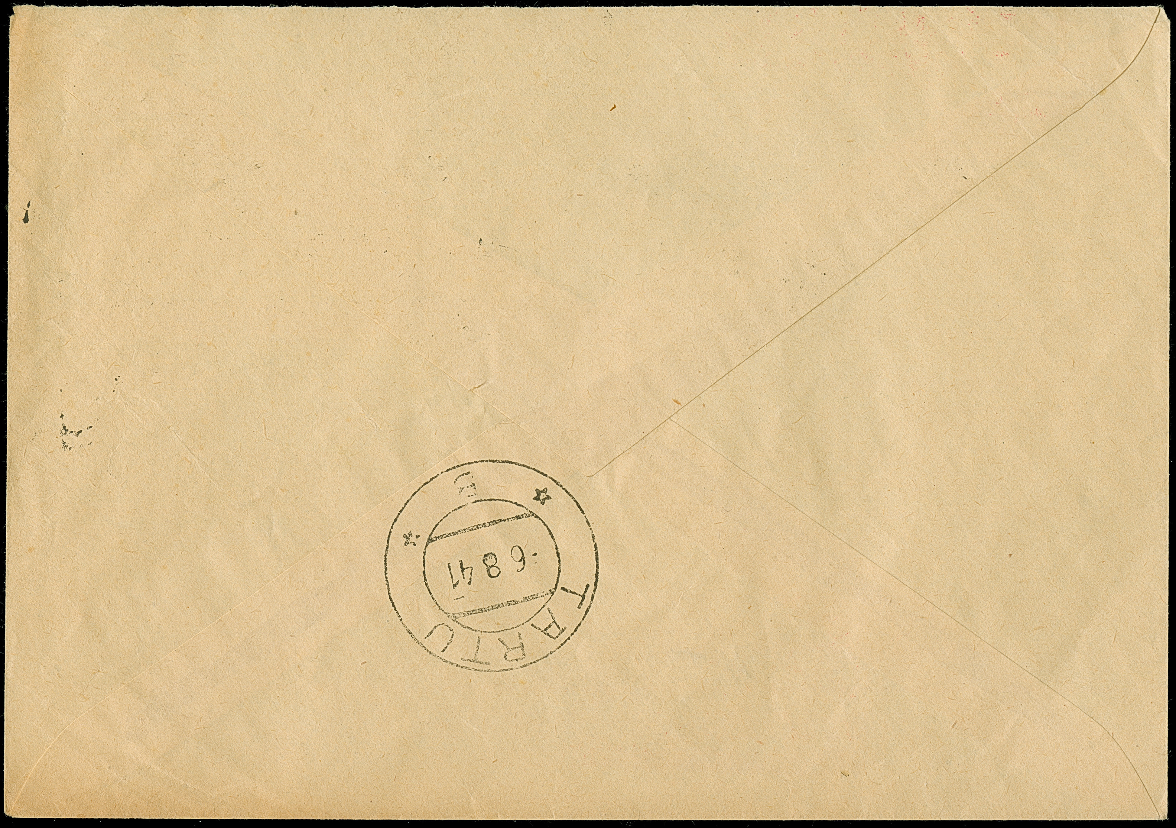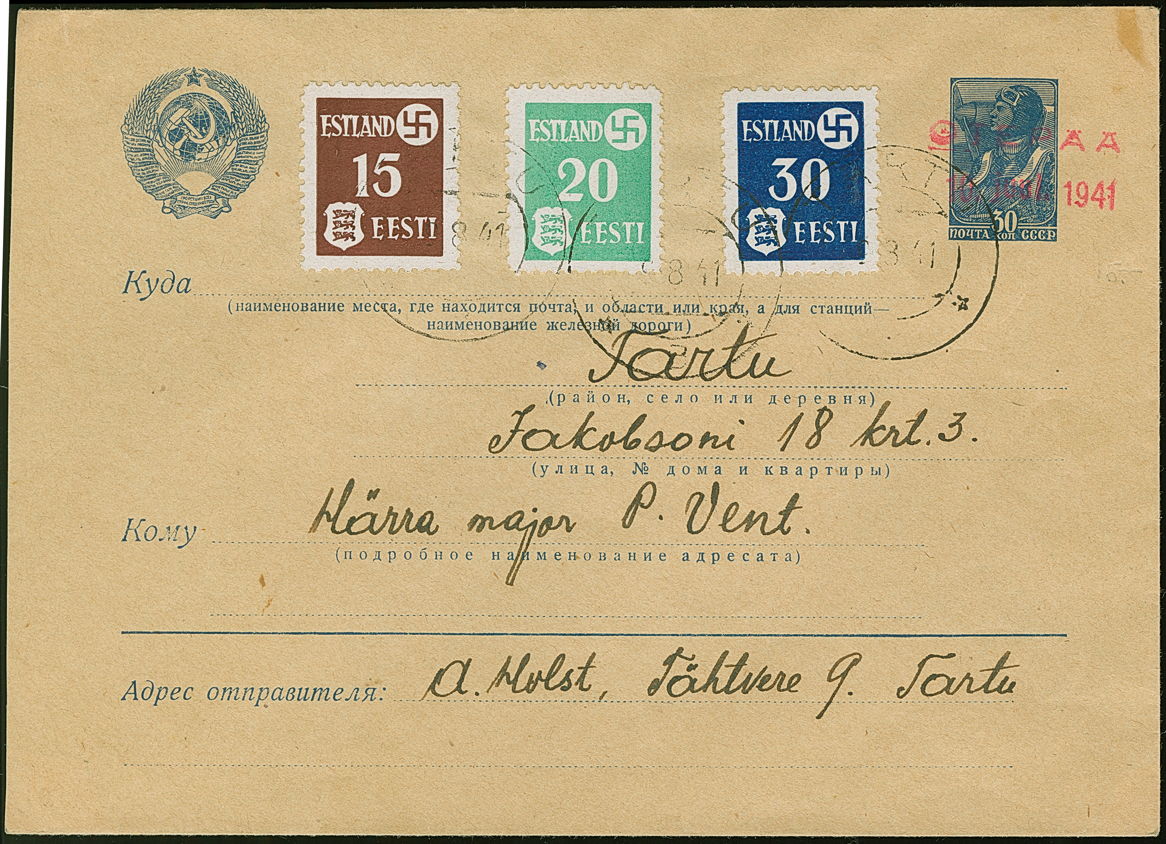 Ganzsachenumschlag Arbeiter 30 K. mit rotem Handstempelaufdruck "OTEPÄÄ 10. juul. 1941", nebengeklebt, Landespost 15-30 Kopeken mit Stempel "TARTU -9 4 41", tadellos, sehr selten. Die Auflage aller Ganzsachen zusammen soll nur 50 Stück betragen haben, ProFi hat jedoch, über verschiedene Ganzsachen verteilt, nur 10 Stück registriert, Fotoattest Krischke (2012)