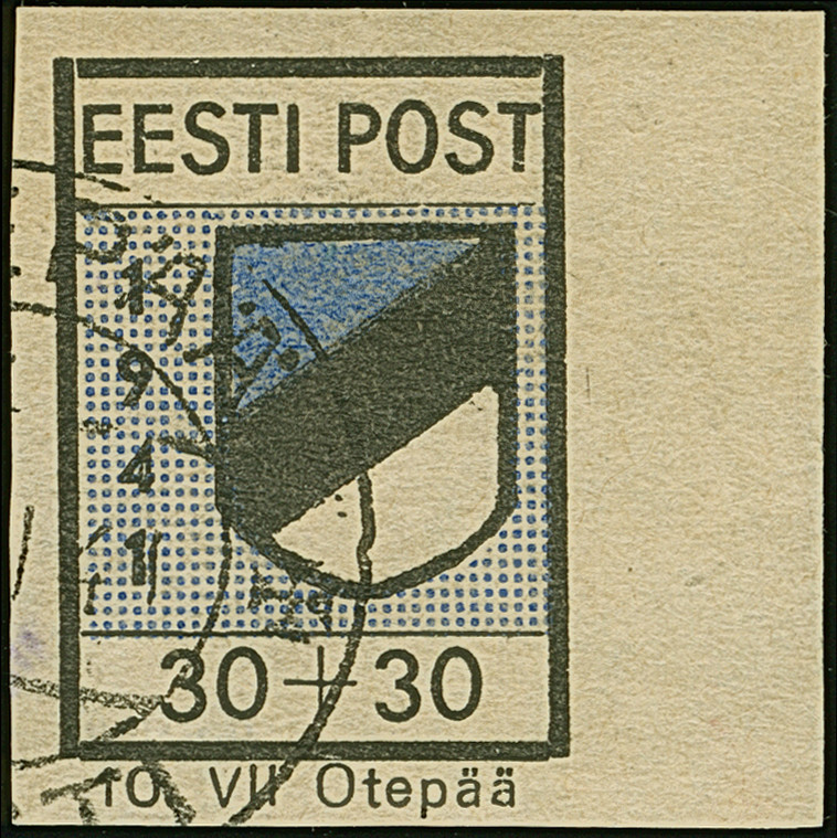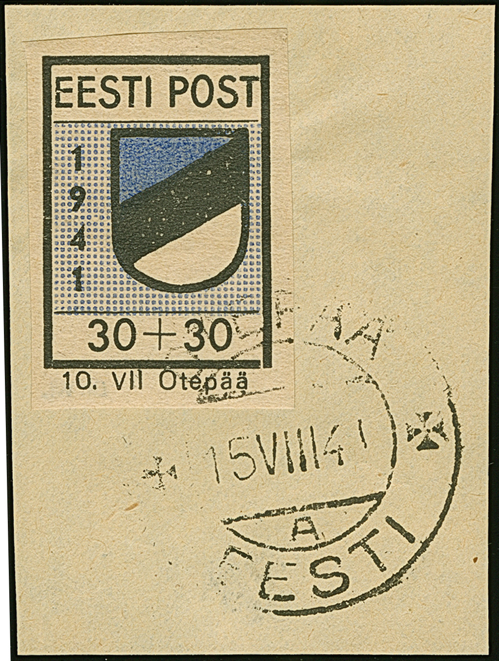 1941, Wappenschild 30 Kopeken, geschnitten, Type II, sauber mit Stempel “OTEPÄÄ 15 VIII 41” auf Briefstück, tadellos, sign. Krischke BPP