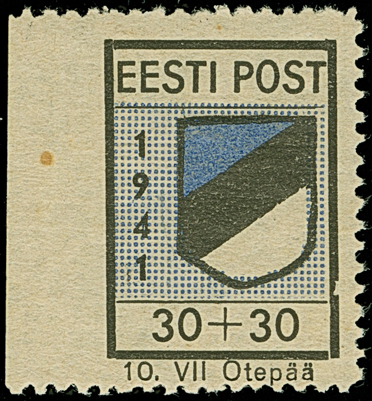 1941, Wappenschild 30 Kopeken, Type III, Feld 9, mit linkem Bogenrand, dort ungezähnt. Nach Eo Vaher ein sogenannter "double error", da die Marke nur geschnitten zur Verausgabung vorgesehen war, im rechten Rahmen zusätzlich ein interessanter Druckausfall, bis auf eine winzige Haftspur sauber postfrisch, vermutlich exisitiert nicht mehr als ein teilgezähnter Bogen aus dieser Druckperiode, eine sehr seltene Marke, ProFi hat in dieser Form nur ein weiteres Stück registriert, sign. Vaher und ausführliches Fotoattest Löbbering BPP (2010)